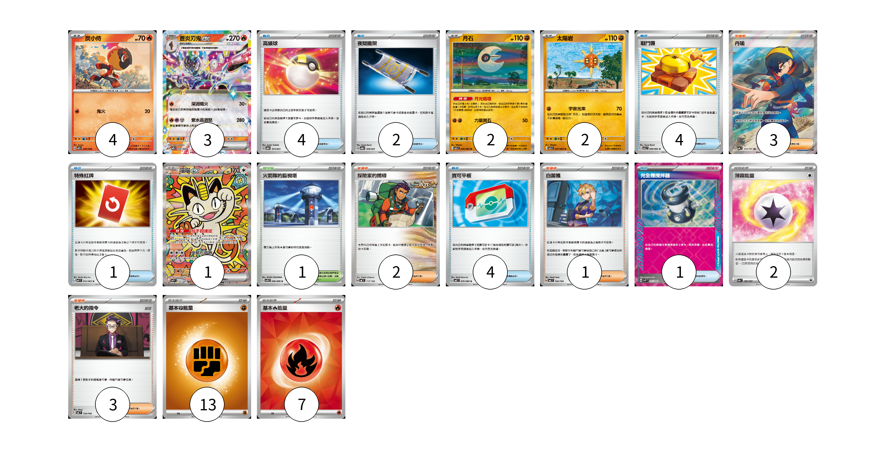 牌組構築方案 以此牌組為基礎新構築牌組 顯示卡面 顯示列表 寶可夢卡(12) 4 3 2 2 1 物品卡(16) 4 2 4 1 4 1 支援者卡(9) 3 2 1 3 競技場卡(1) 1 能量卡(22) 2 13 7 寶可夢卡(12) 卡牌名稱 張數 卡牌名稱 張數 炭小侍 SVPS 005/008 04 蒼炎刃鬼ex SVPS 006/008 03 月石 M1L 026/063 02 太陽岩 M1L 027/063 02 喵喵ex M3 114/080 01 物品卡(16) 卡牌名稱 張數 卡牌名稱 張數 高級球 SVOM 013/021 04 夜間擔架 SVOM 016/021 02 戰鬥鑼 M1L 059/063 04 特殊紅牌 M4 072/083 01 寶可平板 M3 070/080 04 完全體攪拌器 SVK 017/042 01 支援者卡(9) 卡牌名稱 張數 卡牌名稱 張數 丹瑜 SV6 123/101 03 探險家的嚮導 MC 717/742 02 白蕾雅 MC 722/742 01 老大的指令 MC 724/742 03 競技場卡(1) 卡牌名稱 張數 卡牌名稱 張數 火箭隊的監視塔 SV10 096/098 01 能量卡(22) 卡牌名稱 張數 卡牌名稱 張數 薄霧能量 SV8a 186/187 02 基本【鬥】能量 MC FIG 13 基本【火】能量 SVM FIR 07 以此牌組為基礎新構築牌組 牌組編碼 vSgigM-vodwNk-HNAbri copy 列印牌組單 牌組編碼已複製 分享至SNS