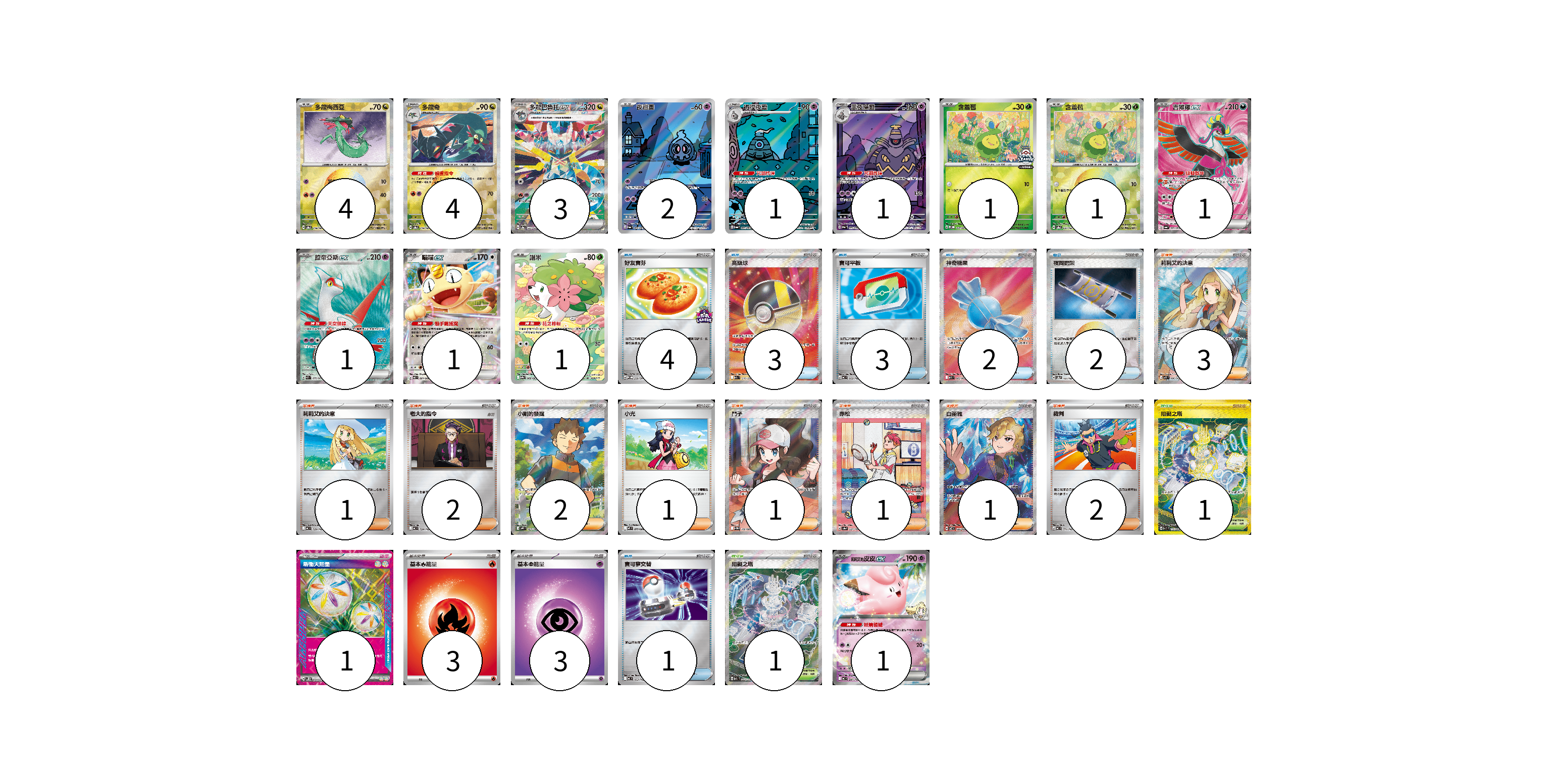 牌組構築方案 以此牌組為基礎新構築牌組 顯示卡面 顯示列表 寶可夢卡(22) 4 4 3 2 1 1 1 1 1 1 1 1 1 物品卡(15) 4 3 3 2 2 1 支援者卡(14) 3 1 2 2 1 1 1 1 2 競技場卡(2) 1 1 能量卡(7) 1 3 3 寶可夢卡(22) 卡牌名稱 張數 卡牌名稱 張數 多龍梅西亞 SV8a 118/187 04 多龍奇 SV8a 119/187 04 多龍巴魯托ex SV8a 221/187 03 夜巡靈 SV6a 068/064 02 彷徨夜靈 SV6a 069/064 01 黑夜魔靈 SV6a 070/064 01 含羞苞 M-P 037/M-P 01 含羞苞 SV8a 001/187 01 吉雉雞ex SV6a 081/064 01 拉帝亞斯ex SV7a 078/064 01 喵喵ex M3 061/080 01 謝米 SV9a 066/063 01 莉莉艾的皮皮ex MC 287/742 01 物品卡(15) 卡牌名稱 張數 卡牌名稱 張數 好友寶芬 SV-P 230/SV-P 04 高級球 M2a 216/193 03 寶可平板 MC 662/742 03 神奇糖果 M1S 082/063 02 夜間擔架 SV8a 151/187 02 寶可夢交替 MC 663/742 01 支援者卡(14) 卡牌名稱 張數 卡牌名稱 張數 莉莉艾的決意 M1L 086/063 03 莉莉艾的決意 MC 729/742 01 老大的指令 MC 724/742 02 小剛的發掘 SV9 123/100 02 小光 M2 077/080 01 鬥子 SV11W 166/086 01 赤松 SV8a 227/187 01 白蕾雅 SV7 126/102 01 裁判 MC 711/742 02 競技場卡(2) 卡牌名稱 張數 卡牌名稱 張數 阻礙之塔 SV10 132/098 01 阻礙之塔 M2a 222/193 01 能量卡(7) 卡牌名稱 張數 卡牌名稱 張數 新衝天能量 SV5K 071/071 01 基本【火】能量 MC FIR 03 基本【超】能量 MC PSY 03 以此牌組為基礎新構築牌組 牌組編碼 vTdkgY-aVqTnw-tsRksq copy 列印牌組單 牌組編碼已複製 分享至SNS
