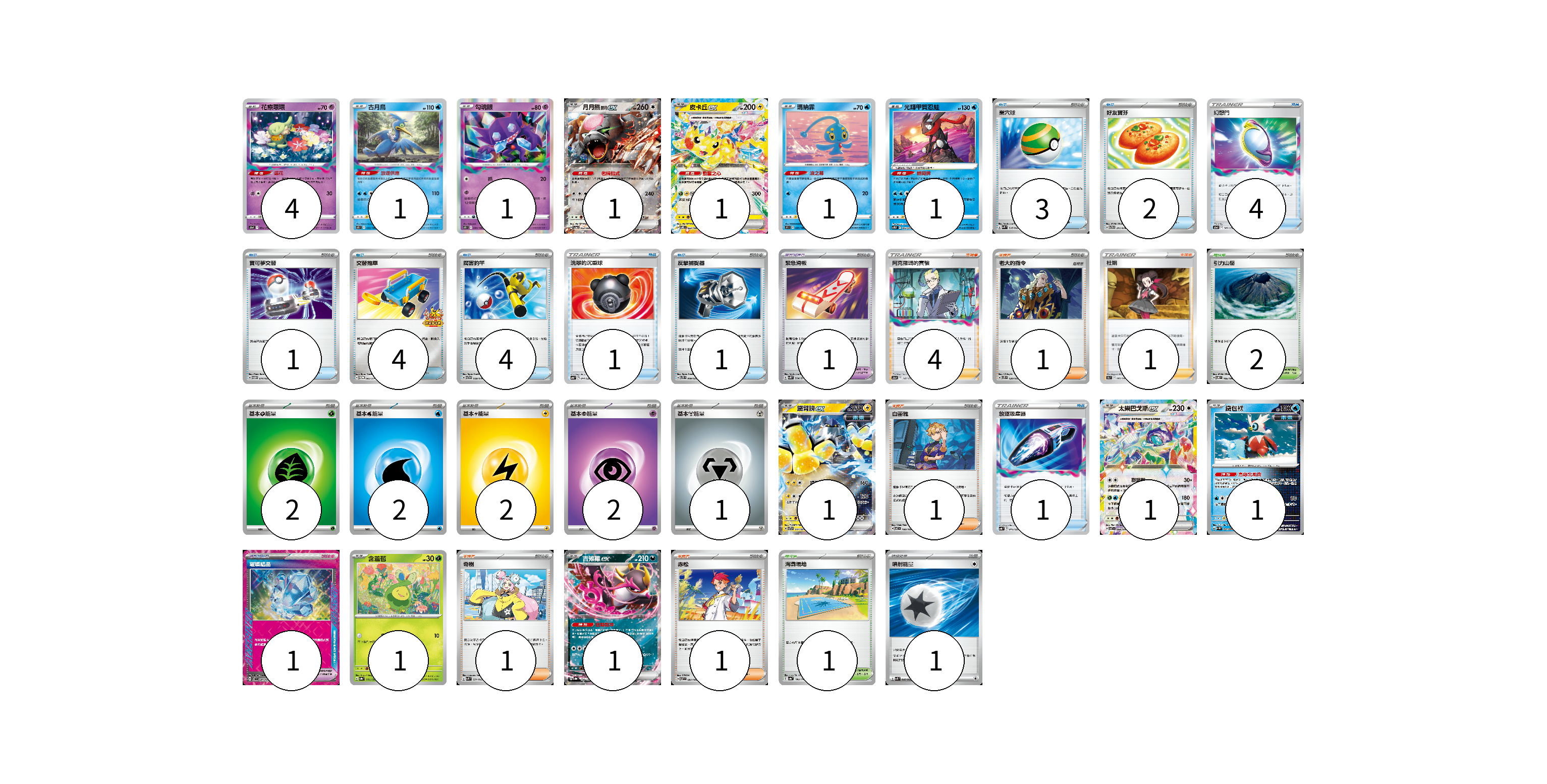 牌組構築方案 以此牌組為基礎新構築牌組 顯示卡面 顯示列表 寶可夢卡(15) 4 1 1 1 1 1 1 1 1 1 1 1 寶可夢道具(2) 1 1 物品卡(21) 3 2 4 1 4 4 1 1 1 支援者卡(9) 4 1 1 1 1 1 競技場卡(3) 2 1 能量卡(10) 2 2 2 2 1 1 寶可夢卡(15) 卡牌名稱 張數 卡牌名稱 張數 花療環環 S12a 064/172 04 古月鳥 S11 033/100 01 勾魂眼 S11 044/100 01 月月熊 赫月 ex SV5a 052/066 01 皮卡丘ex SV8 033/106 01 瑪納霏 S9 031/100 01 光輝甲賀忍蛙 SVTG 002/019 01 鐵臂膀ex SVTR 007/021 01 太樂巴戈斯ex SV7 088/102 01 鐵包袱 SV4M 020/066 01 含羞苞 SV8a 001/187 01 吉雉雞ex SV8a 104/187 01 寶可夢道具(2) 卡牌名稱 張數 卡牌名稱 張數 緊急滑板 SV5K 064/071 01 璀璨結晶 SV7 094/102 01 物品卡(21) 卡牌名稱 張數 卡牌名稱 張數 巢穴球 SVK 016/042 03 好友寶芬 SVTG 011/019 02 幻想門 S12a 141/172 04 寶可夢交替 SVTM 014/022 01 交替推車 SV-P 082/SV-P 04 厲害釣竿 SVTG 009/019 04 洗翠的沉重球 SVB 014/028 01 反擊捕捉器 SVTS 009/022 01 放逐吸塵器 SVB 016/028 01 支援者卡(9) 卡牌名稱 張數 卡牌名稱 張數 阿克羅瑪的實驗 S12a 148/172 04 老大的指令 SVTS 020/022 01 杜娟 S9a 065/067 01 白蕾雅 SV7 100/102 01 奇樹 SVK 031/042 01 赤松 SV7 097/102 01 競技場卡(3) 卡牌名稱 張數 卡牌名稱 張數 引力山岳 SV8 106/106 02 海灘場地 SV4a 184/190 01 能量卡(10) 卡牌名稱 張數 卡牌名稱 張數 基本【草】能量 SVF GRA 02 基本【水】能量 SVF WAT 02 基本【雷】能量 SVF LIG 02 基本【超】能量 SVF PSY 02 基本【鋼】能量 SVF MET 01 噴射能量 SVK 040/042 01 以此牌組為基礎新構築牌組 牌組編碼 vYlBfM-CfnIKH-ukUbma copy 列印牌組單 牌組編碼已複製 分享至SNS