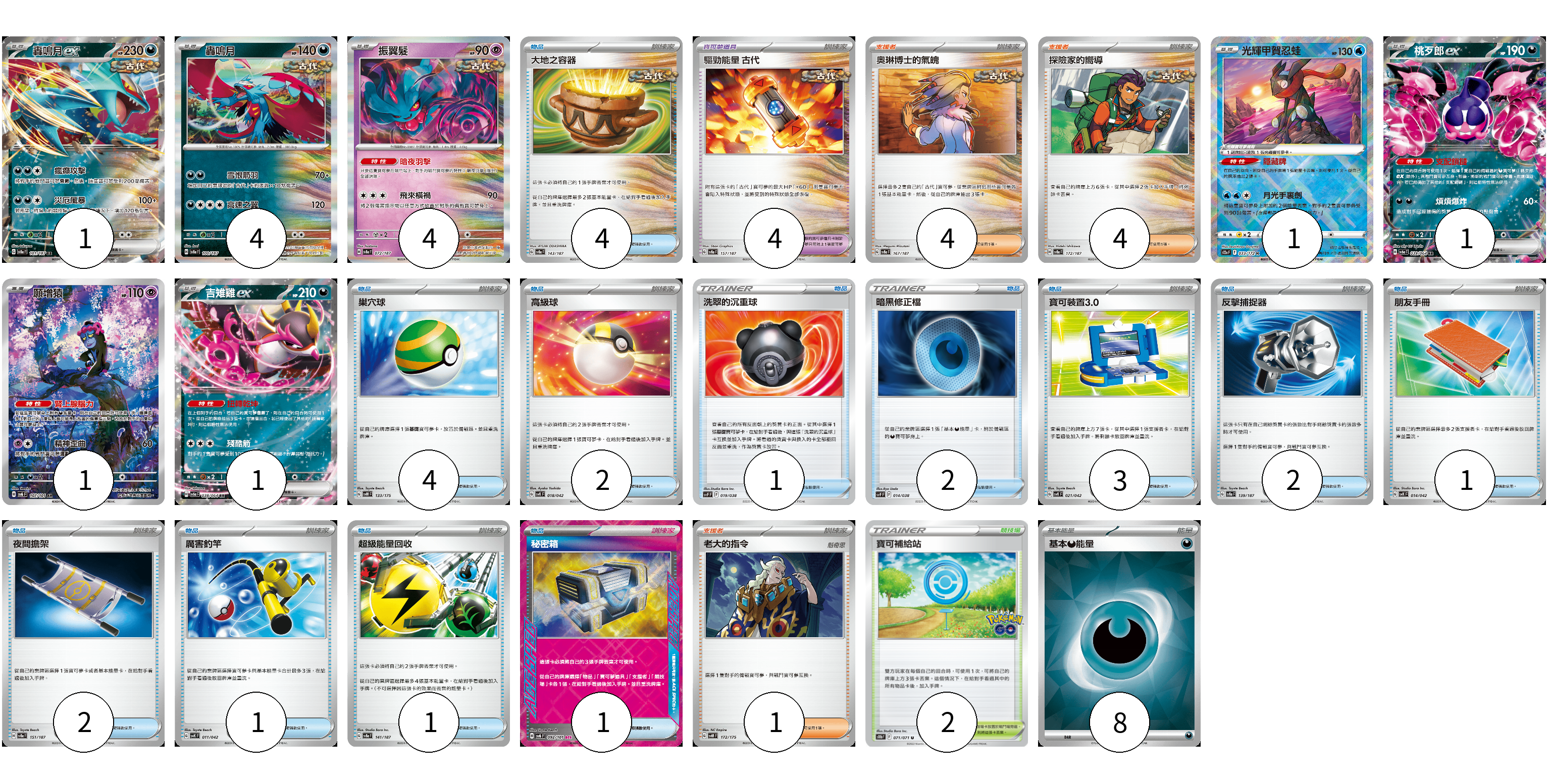 牌組構築方案 以此牌組為基礎新構築牌組 顯示卡面 顯示列表 寶可夢卡(13) 1 4 4 1 1 1 1 寶可夢道具(4) 4 物品卡(24) 4 4 2 1 2 3 2 1 2 1 1 1 支援者卡(9) 4 4 1 競技場卡(2) 2 能量卡(8) 8 寶可夢卡(13) 卡牌名稱 張數 卡牌名稱 張數 轟鳴月ex SV8a 101/187 01 轟鳴月 SV8a 100/187 04 振翼髮 SV8a 072/187 04 光輝甲賀忍蛙 S12a 033/172 01 桃歹郎ex SV6a 039/064 01 願增猿 SV6 107/101 01 吉雉雞ex SV6a 038/064 01 寶可夢道具(4) 卡牌名稱 張數 卡牌名稱 張數 驅勁能量 古代 SV8a 157/187 04 物品卡(24) 卡牌名稱 張數 卡牌名稱 張數 大地之容器 SV8a 143/187 04 巢穴球 SVM 133/175 04 高級球 SVK 018/042 02 洗翠的沉重球 SVF 019/038 01 暗黑修正檔 SVF 014/038 02 寶可裝置3.0 SVK 021/042 03 反擊捕捉器 SV8a 139/187 02 朋友手冊 SVK 014/042 01 夜間擔架 SV8a 151/187 02 厲害釣竿 SVK 011/042 01 超級能量回收 SV8a 141/187 01 秘密箱 SV6 092/101 01 支援者卡(9) 卡牌名稱 張數 卡牌名稱 張數 奧琳博士的氣魄 SV8a 167/187 04 探險家的嚮導 SV8a 172/187 04 老大的指令 SVM 172/175 01 競技場卡(2) 卡牌名稱 張數 卡牌名稱 張數 寶可補給站 S10b 071/071 02 能量卡(8) 卡牌名稱 張數 卡牌名稱 張數 基本【惡】能量 SVK DAR 08 以此牌組為基礎新構築牌組 牌組編碼 vYvWiV-kqvkTS-OSTAWb copy 列印牌組單 牌組編碼已複製 分享至SNS