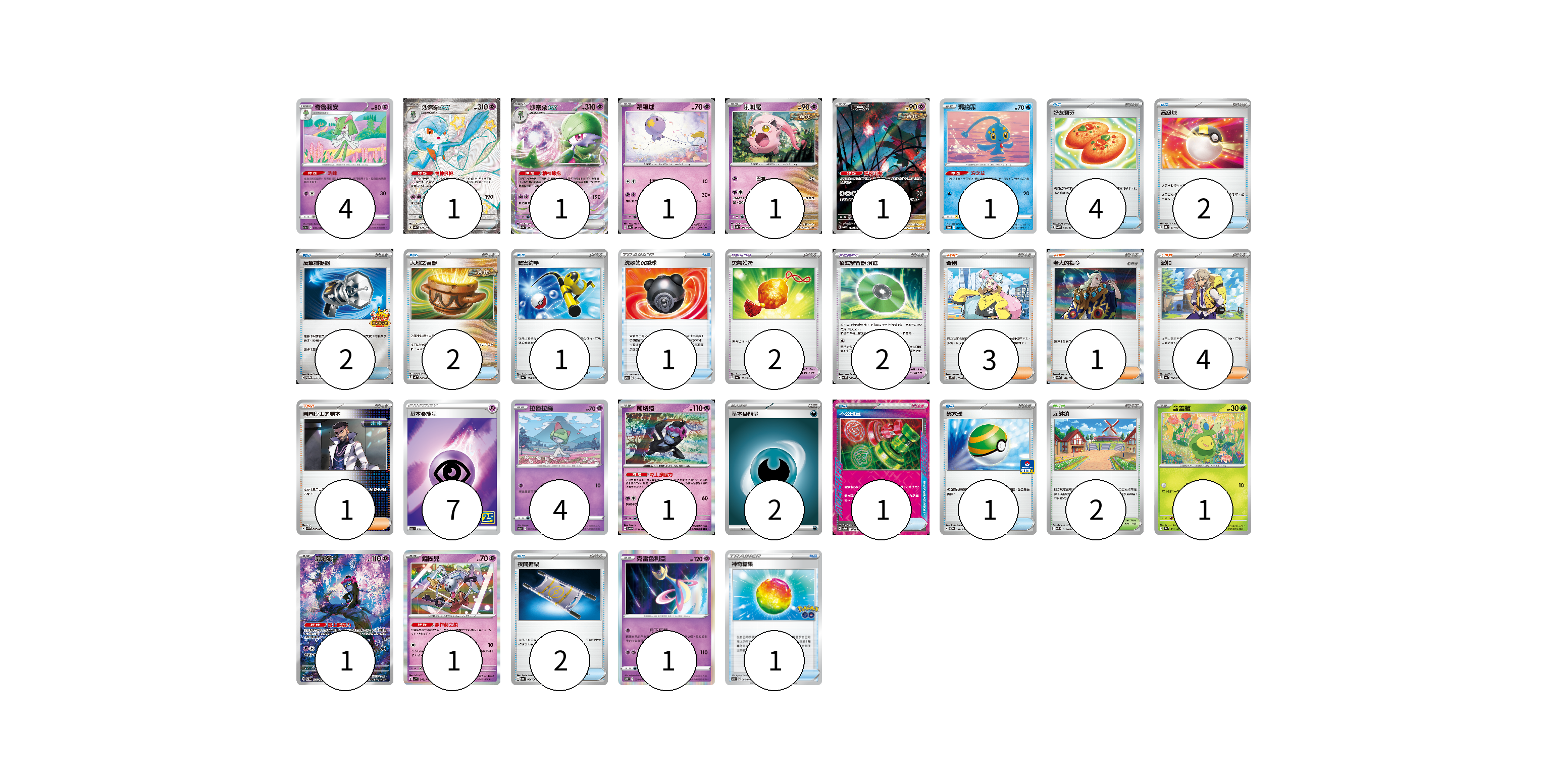牌組構築方案 以此牌組為基礎新構築牌組 顯示卡面 顯示列表 寶可夢卡(19) 4 1 1 1 1 1 1 4 1 1 1 1 1 寶可夢道具(4) 2 2 物品卡(17) 4 2 2 2 1 1 1 1 2 1 支援者卡(9) 3 1 4 1 競技場卡(2) 2 能量卡(9) 7 2 寶可夢卡(19) 卡牌名稱 張數 卡牌名稱 張數 奇魯莉安 S11a 037/068 04 沙奈朵ex SV4a 328/190 01 沙奈朵ex SV4a 082/190 01 飄飄球 SV4a 083/190 01 吼叫尾 SV4K 032/066 01 振翼髮 SV5K 076/071 01 瑪納霏 S12a 029/172 01 拉魯拉絲 S9a 032/067 04 願增猿 SV6 055/101 01 含羞苞 SV8a 001/187 01 願增猿 SV6 107/101 01 鑰圈兒 SV1V 045/078 01 克雷色利亞 S10D 028/067 01 寶可夢道具(4) 卡牌名稱 張數 卡牌名稱 張數 勇氣護符 SV4a 169/190 02 招式學習器 演進 SV4M 063/066 02 物品卡(17) 卡牌名稱 張數 卡牌名稱 張數 好友寶芬 SV5K 063/071 04 高級球 SVHK 013/022 02 反擊捕捉器 SV-P 083/SV-P 02 大地之容器 SV4K 060/066 02 厲害釣竿 SV4a 158/190 01 洗翠的沉重球 SVB 014/028 01 不公印章 SV5a 053/066 01 巢穴球 SV-P 091/SV-P 01 夜間擔架 SV6a 056/064 02 神奇糖果 S10b 066/071 01 支援者卡(9) 卡牌名稱 張數 卡牌名稱 張數 奇樹 SVHK 019/022 03 老大的指令 SV4a 181/190 01 派帕 SV4a 180/190 04 弗圖博士的劇本 SV4M 065/066 01 競技場卡(2) 卡牌名稱 張數 卡牌名稱 張數 深缽鎮 SVF 036/038 02 能量卡(9) 卡牌名稱 張數 卡牌名稱 張數 基本超能量 S8a PSY 07 基本惡能量 sv-p DAR 02 以此牌組為基礎新構築牌組 牌組編碼 vZKbjy-HTqZSC-ujBMAS copy 列印牌組單 牌組編碼已複製 分享至SNS