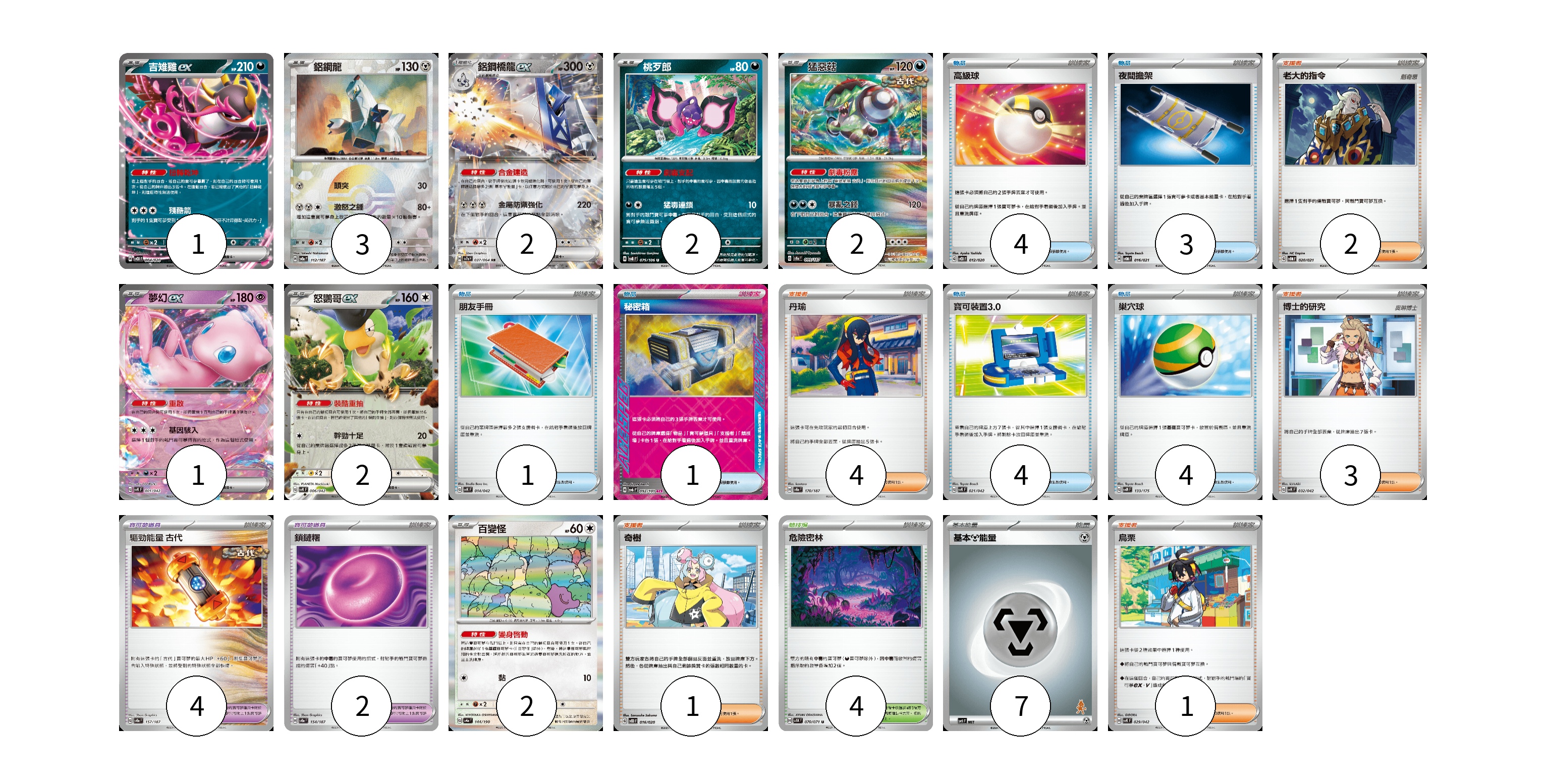 牌組構築方案 以此牌組為基礎新構築牌組 顯示卡面 顯示列表 寶可夢卡(15) 1 3 2 2 2 1 2 2 寶可夢道具(6) 4 2 物品卡(17) 4 3 1 1 4 4 支援者卡(11) 2 4 3 1 1 競技場卡(4) 4 能量卡(7) 7 寶可夢卡(15) 卡牌名稱 張數 卡牌名稱 張數 吉雉雞ex SVOD 004/020 01 鋁鋼龍 SV8a 112/187 03 鋁鋼橋龍ex SV7a 037/064 02 桃歹郎 SV8 075/106 02 猛惡菇 SV8a 099/187 02 夢幻ex SVK 001/042 01 怒鸚哥ex SVK 006/042 02 百變怪 SV4a 144/190 02 寶可夢道具(6) 卡牌名稱 張數 卡牌名稱 張數 驅勁能量 古代 SV8a 157/187 04 鎖鏈糬 SV8a 154/187 02 物品卡(17) 卡牌名稱 張數 卡牌名稱 張數 高級球 SVOD 012/020 04 夜間擔架 SVOM 016/021 03 朋友手冊 SVK 014/042 01 秘密箱 SV6 092/101 01 寶可裝置3.0 SVK 021/042 04 巢穴球 SVM 133/175 04 支援者卡(11) 卡牌名稱 張數 卡牌名稱 張數 老大的指令 SVOM 020/021 02 丹瑜 SV8a 170/187 04 博士的研究 SVK 032/042 03 奇樹 SVOD 016/020 01 烏栗 SVK 029/042 01 競技場卡(4) 卡牌名稱 張數 卡牌名稱 張數 危險密林 SV5K 070/071 04 能量卡(7) 卡牌名稱 張數 卡牌名稱 張數 基本【鋼】能量 SVI MET 07 以此牌組為基礎新構築牌組 牌組編碼 vcUvmn-njwbzd-NxwOnM copy 列印牌組單 牌組編碼已複製 分享至SNS