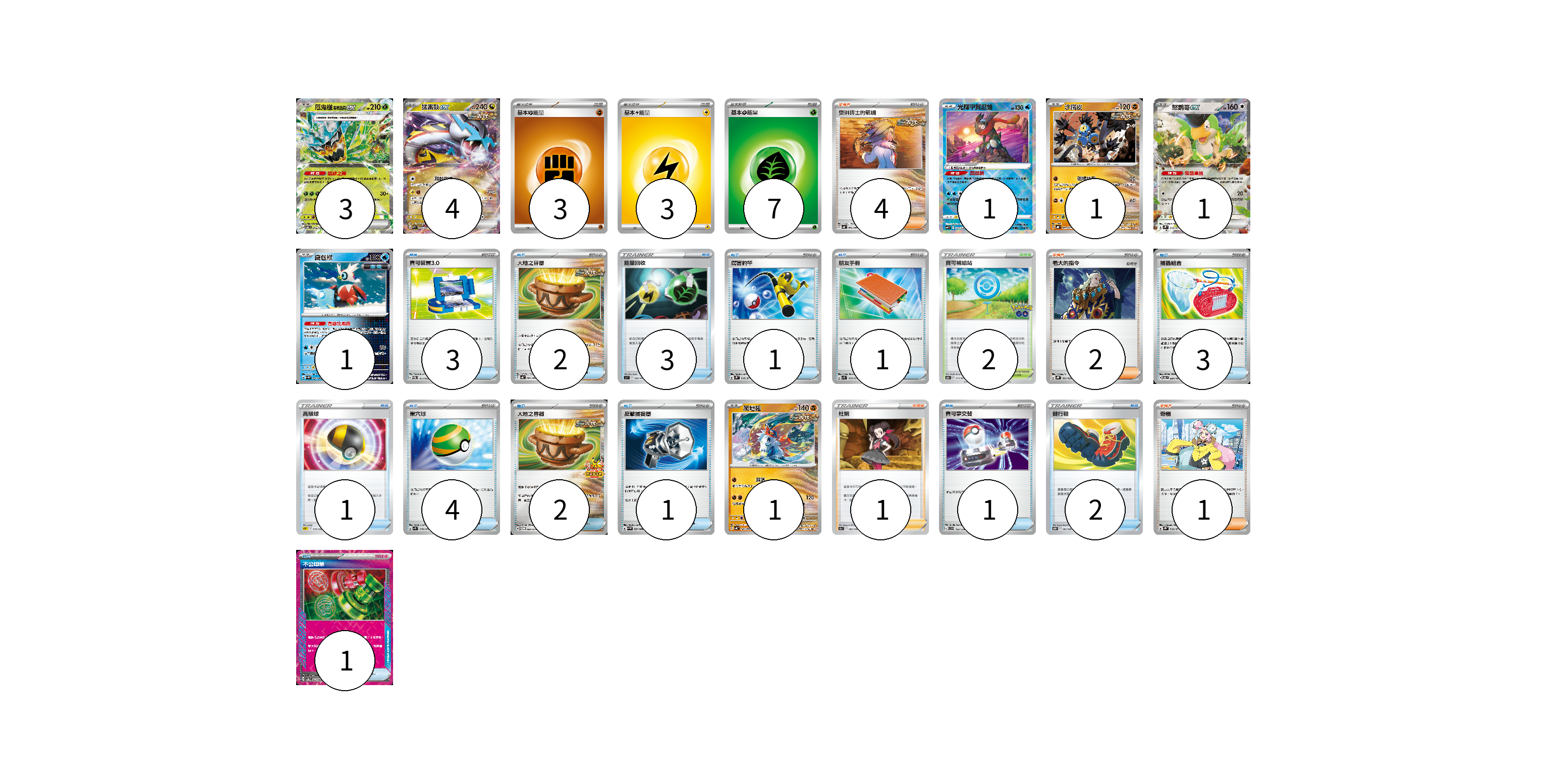 牌組構築方案 以此牌組為基礎新構築牌組 顯示卡面 顯示列表 寶可夢卡(12) 3 4 1 1 1 1 1 物品卡(25) 3 2 3 1 1 3 1 4 2 1 1 2 1 支援者卡(8) 4 2 1 1 競技場卡(2) 2 能量卡(13) 3 3 7 寶可夢卡(12) 卡牌名稱 張數 卡牌名稱 張數 厄鬼椪 碧草面具ex SV6 016/101 03 猛雷鼓ex SV5K 053/071 04 光輝甲賀忍蛙 SVF 004/038 01 沙鐵皮 SVHK 009/022 01 怒鸚哥ex SV2P 065/071 01 鐵包袱 SV4M 020/066 01 爬地翅 SV4K 041/066 01 物品卡(25) 卡牌名稱 張數 卡牌名稱 張數 寶可裝置3.0 SVEM 014/020 03 大地之容器 SV4K 060/066 02 能量回收 SI 365/414 03 厲害釣竿 SV2P 066/071 01 朋友手冊 SV1S 069/078 01 捕蟲組合 SV6 094/101 03 高級球 SDP 015/022 01 巢穴球 SV1S 070/078 04 大地之容器 SV-P 084/SV-P 02 反擊捕捉器 SV4M 059/066 01 寶可夢交替 SVD 122/139 01 健行鞋 S10D 061/067 02 不公印章 SV5a 053/066 01 支援者卡(8) 卡牌名稱 張數 卡牌名稱 張數 奧琳博士的氣魄 SV4K 064/066 04 老大的指令 SVHK 022/022 02 杜娟 S9a 065/067 01 奇樹 SV2D 069/071 01 競技場卡(2) 卡牌名稱 張數 卡牌名稱 張數 寶可補給站 S10b 071/071 02 能量卡(13) 卡牌名稱 張數 卡牌名稱 張數 基本【鬥】能量 SVHK FIG 03 基本【雷】能量 SVHM LIG 03 基本【草】能量 SVF GRA 07 以此牌組為基礎新構築牌組 牌組編碼 vfXrvi-Jtmphb-nXuLwN copy 列印牌組單 牌組編碼已複製 分享至SNS