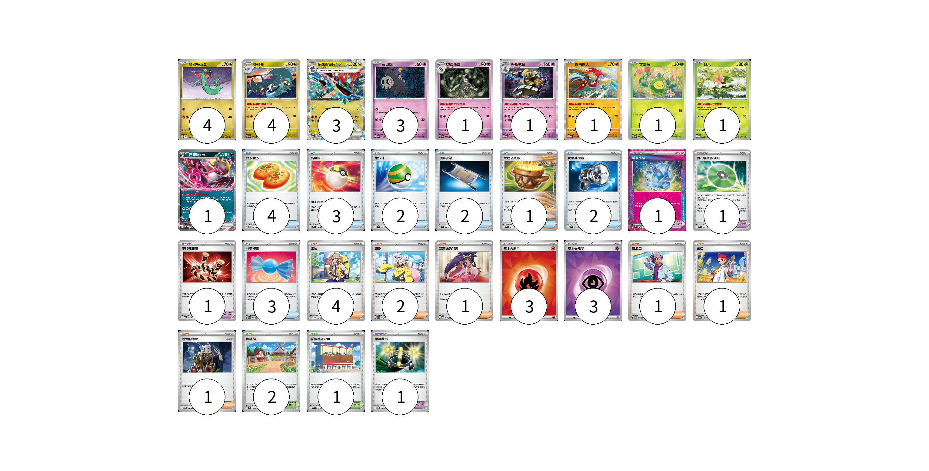 牌組構築方案 以此牌組為基礎新構築牌組 顯示卡面 顯示列表 寶可夢卡(20) 4 4 3 3 1 1 1 1 1 1 寶可夢道具(4) 1 1 1 1 物品卡(17) 4 3 2 2 1 2 3 支援者卡(10) 4 2 1 1 1 1 競技場卡(3) 2 1 能量卡(6) 3 3 寶可夢卡(20) 卡牌名稱 張數 卡牌名稱 張數 多龍梅西亞 SV6 079/101 04 多龍奇 SV8a 119/187 04 多龍巴魯托ex SV8a 120/187 03 夜巡靈 SV8a 064/187 03 彷徨夜靈 SV8a 065/187 01 黑夜魔靈 SV8a 066/187 01 摔角鷹人 SV8a 084/187 01 含羞苞 SV8a 001/187 01 謝米 SV9a 006/063 01 吉雉雞ex SVOM 009/021 01 寶可夢道具(4) 卡牌名稱 張數 卡牌名稱 張數 璀璨結晶 SV8a 152/187 01 招式學習器 演進 SV8a 160/187 01 不服輸頭帶 SV4a 168/190 01 學習裝置 SVTM 016/022 01 物品卡(17) 卡牌名稱 張數 卡牌名稱 張數 好友寶芬 SVOD 011/020 04 高級球 SVOD 012/020 03 巢穴球 SVM 133/175 02 夜間擔架 SV8a 151/187 02 大地之容器 SV8a 143/187 01 反擊捕捉器 SV8a 139/187 02 神奇糖果 SVK 019/042 03 支援者卡(10) 卡牌名稱 張數 卡牌名稱 張數 派帕 SVOD 018/020 04 奇樹 SVM 160/175 02 艾莉絲的鬥志 SV9 094/100 01 吉尼亞 SVAL 017/021 01 赤松 SV8a 163/187 01 老大的指令 SVOM 020/021 01 競技場卡(3) 卡牌名稱 張數 卡牌名稱 張數 深缽鎮 SV4a 185/190 02 城鎮百貨公司 SVK 037/042 01 能量卡(6) 卡牌名稱 張數 卡牌名稱 張數 基本【火】能量 SVK FIR 03 基本【超】能量 SVK PSY 03 以此牌組為基礎新構築牌組 牌組編碼 vhygIh-jCJbse-cNZkVw copy 列印牌組單 牌組編碼已複製 分享至SNS