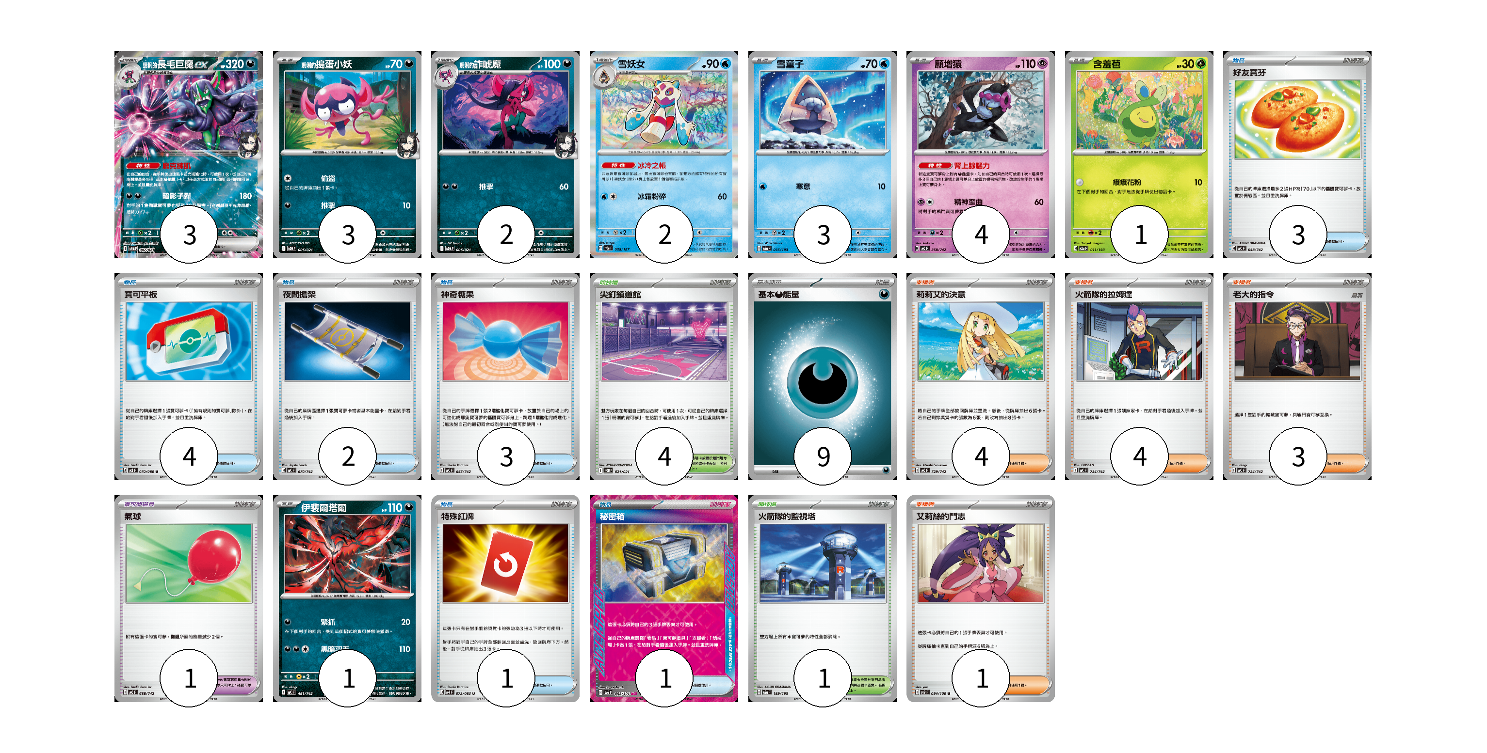 牌組構築方案 以此牌組為基礎新構築牌組 顯示卡面 顯示列表 寶可夢卡(19) 3 3 2 2 3 4 1 1 寶可夢道具(1) 1 物品卡(14) 3 4 2 3 1 1 支援者卡(12) 4 4 3 1 競技場卡(5) 4 1 能量卡(9) 9 寶可夢卡(19) 卡牌名稱 張數 卡牌名稱 張數 <瑪俐的>長毛巨魔ex SVOM 007/021 03 <瑪俐的>搗蛋小妖 SVOM 005/021 03 <瑪俐的>詐唬魔 SVOM 006/021 02 雪妖女 SV8a 038/187 02 雪童子 M2a 035/193 03 願增猿 MC 358/742 04 含羞苞 M2a 011/193 01 伊裴爾塔爾 MC 481/742 01 寶可夢道具(1) 卡牌名稱 張數 卡牌名稱 張數 氣球 MC 688/742 01 物品卡(14) 卡牌名稱 張數 卡牌名稱 張數 好友寶芬 MC 648/742 03 寶可平板 M3 070/080 04 夜間擔架 MC 670/742 02 神奇糖果 MC 655/742 03 特殊紅牌 M4 072/083 01 秘密箱 SV6 092/101 01 支援者卡(12) 卡牌名稱 張數 卡牌名稱 張數 莉莉艾的決意 MC 729/742 04 火箭隊的拉姆達 MC 734/742 04 老大的指令 MC 724/742 03 艾莉絲的鬥志 SV9 094/100 01 競技場卡(5) 卡牌名稱 張數 卡牌名稱 張數 尖釘鎮道館 SVOM 021/021 04 火箭隊的監視塔 M2a 189/193 01 能量卡(9) 卡牌名稱 張數 卡牌名稱 張數 基本【惡】能量 MC DAR 09 以此牌組為基礎新構築牌組 牌組編碼 viPqDu-CiePiQ-TgTOyc copy 列印牌組單 牌組編碼已複製 分享至SNS