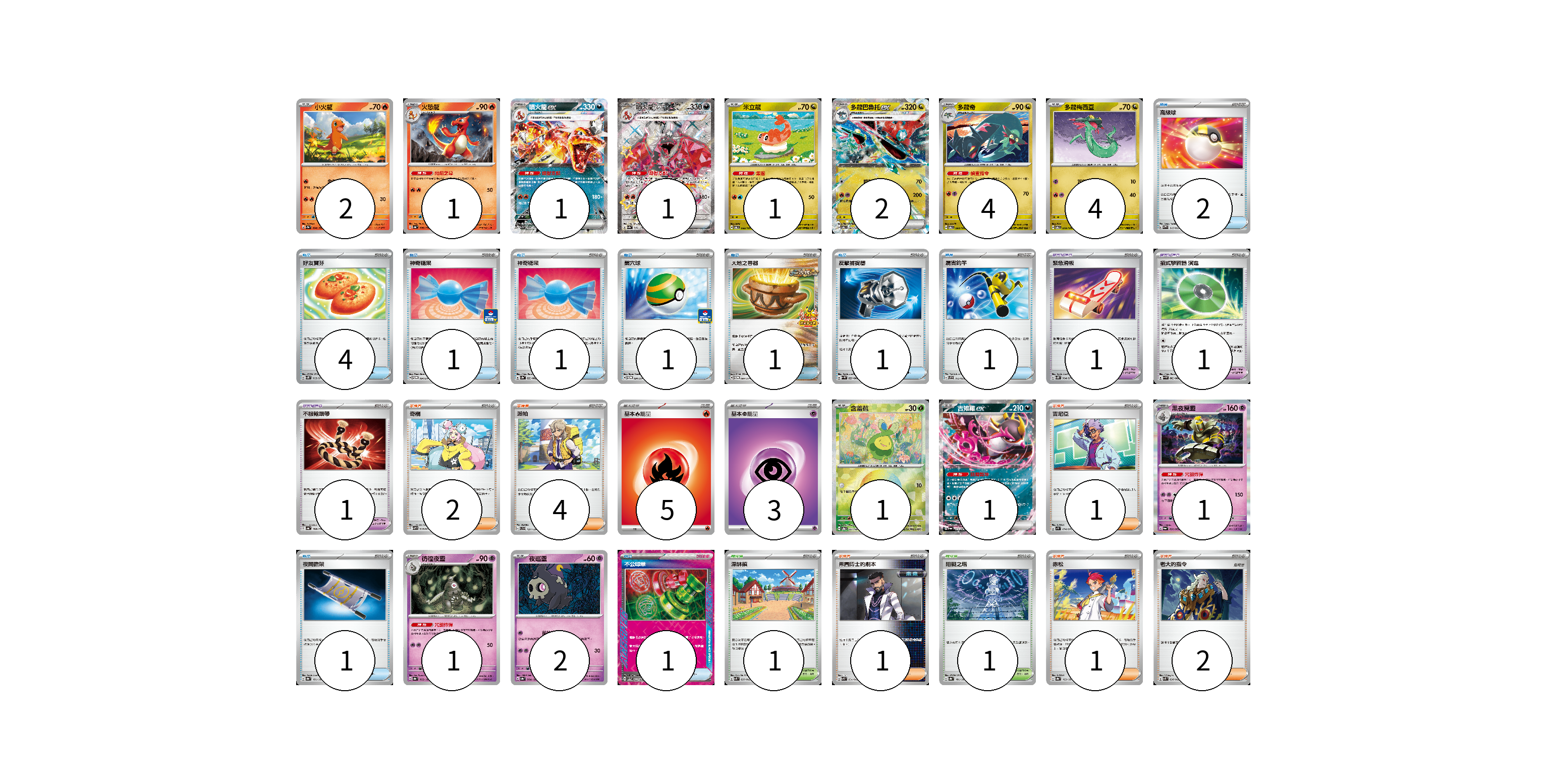 牌組構築方案 以此牌組為基礎新構築牌組 顯示卡面 顯示列表 寶可夢卡(22) 2 1 1 1 1 2 4 4 1 1 1 1 2 寶可夢道具(3) 1 1 1 物品卡(14) 2 4 1 1 1 1 1 1 1 1 支援者卡(11) 2 4 1 1 1 2 競技場卡(2) 1 1 能量卡(8) 5 3 寶可夢卡(22) 卡牌名稱 張數 卡牌名稱 張數 小火龍 SV2a 004/165 02 火恐龍 SV4a 026/190 01 噴火龍ex SV3 066/108 01 噴火龍ex SV4a 331/190 01 米立龍 SV6 082/101 01 多龍巴魯托ex SV6 081/101 02 多龍奇 SV6 080/101 04 多龍梅西亞 SV6 079/101 04 含羞苞 SV8a 001/187 01 吉雉雞ex SV6a 038/064 01 黑夜魔靈 SV6a 020/064 01 彷徨夜靈 SV8a 065/187 01 夜巡靈 SV8a 064/187 02 寶可夢道具(3) 卡牌名稱 張數 卡牌名稱 張數 緊急滑板 SV5K 064/071 01 招式學習器 演進 SV4M 063/066 01 不服輸頭帶 SV4a 168/190 01 物品卡(14) 卡牌名稱 張數 卡牌名稱 張數 高級球 SVAW 015/023 02 好友寶芬 SV5K 063/071 04 神奇糖果 SV-P 104/SV-P 01 神奇糖果 SV3a 053/062 01 巢穴球 SV-P 091/SV-P 01 大地之容器 SV-P 084/SV-P 01 反擊捕捉器 SV4M 059/066 01 厲害釣竿 SVF 013/038 01 夜間擔架 SV8a 151/187 01 不公印章 SV5a 053/066 01 支援者卡(11) 卡牌名稱 張數 卡牌名稱 張數 奇樹 SVHM 018/022 02 派帕 SVD 137/139 04 吉尼亞 SV1S 074/078 01 弗圖博士的劇本 SVK 034/042 01 赤松 SV8a 163/187 01 老大的指令 SVK 036/042 02 競技場卡(2) 卡牌名稱 張數 卡牌名稱 張數 深缽鎮 SVK 039/042 01 阻礙之塔 SV8a 181/187 01 能量卡(8) 卡牌名稱 張數 卡牌名稱 張數 基本【火】能量 SVHK FIR 05 基本【超】能量 SVHM PSY 03 以此牌組為基礎新構築牌組 牌組編碼 vnFWhq-LdkWYR-ZySWxD copy 列印牌組單 牌組編碼已複製 分享至SNS