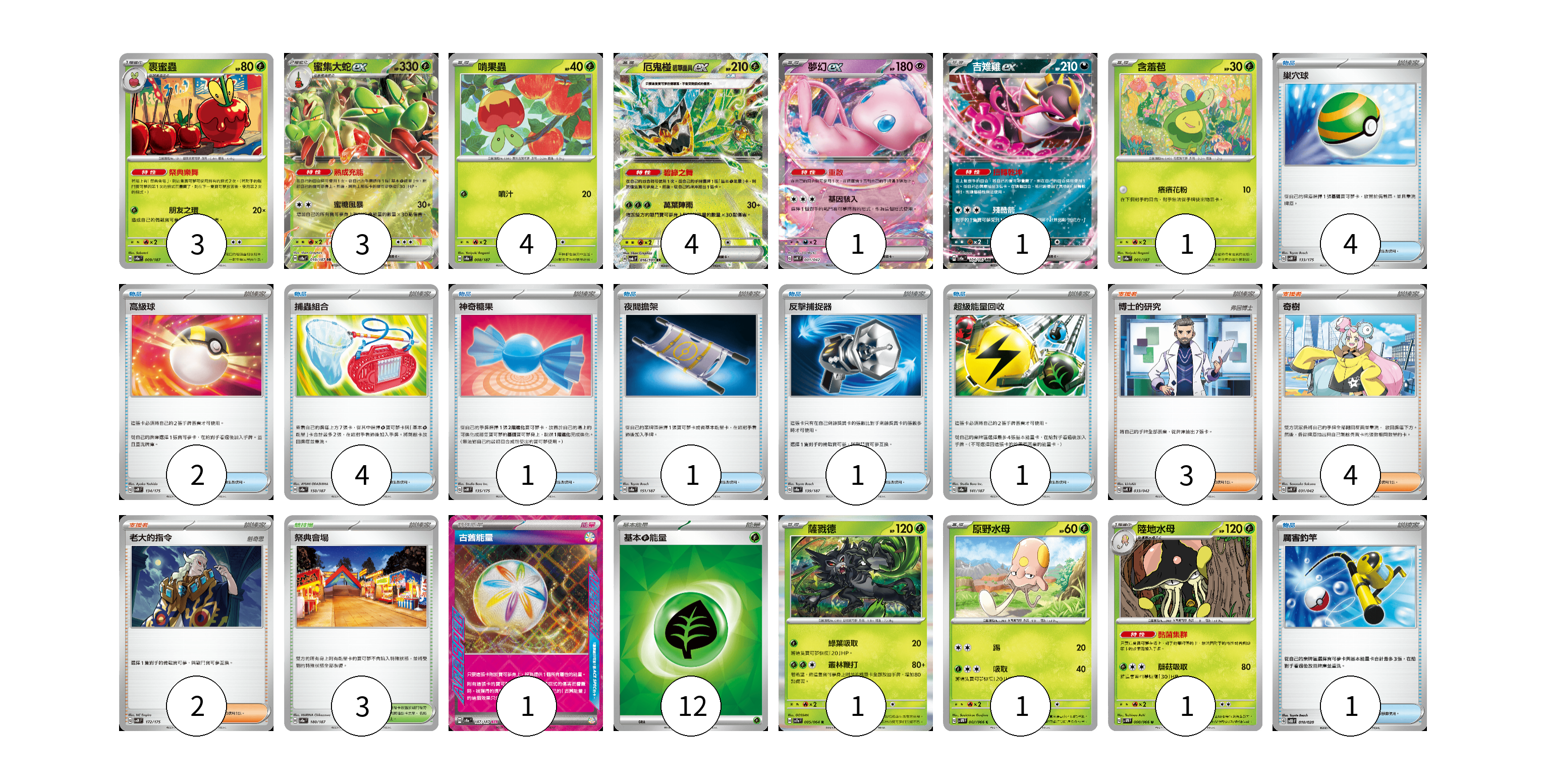 牌組構築方案 以此牌組為基礎新構築牌組 顯示卡面 顯示列表 寶可夢卡(20) 3 3 4 4 1 1 1 1 1 1 物品卡(15) 4 2 4 1 1 1 1 1 支援者卡(9) 3 4 2 競技場卡(3) 3 能量卡(13) 1 12 寶可夢卡(20) 卡牌名稱 張數 卡牌名稱 張數 裹蜜蟲 SV8a 009/187 03 蜜集大蛇ex SV8a 010/187 03 啃果蟲 SV8a 008/187 04 厄鬼椪 碧草面具ex SV6 016/101 04 夢幻ex SVK 001/042 01 吉雉雞ex SV8a 104/187 01 含羞苞 SV8a 001/187 01 薩戮德 SV7a 005/064 01 原野水母 SV4M 007/066 01 陸地水母 SV4M 008/066 01 物品卡(15) 卡牌名稱 張數 卡牌名稱 張數 巢穴球 SVM 133/175 04 高級球 SVM 134/175 02 捕蟲組合 SV8a 150/187 04 神奇糖果 SVM 135/175 01 夜間擔架 SV8a 151/187 01 反擊捕捉器 SV8a 139/187 01 超級能量回收 SV8a 141/187 01 厲害釣竿 SVOD 010/020 01 支援者卡(9) 卡牌名稱 張數 卡牌名稱 張數 博士的研究 SVK 033/042 03 奇樹 SVK 031/042 04 老大的指令 SVM 172/175 02 競技場卡(3) 卡牌名稱 張數 卡牌名稱 張數 祭典會場 SV8a 180/187 03 能量卡(13) 卡牌名稱 張數 卡牌名稱 張數 古舊能量 SV8a 187/187 01 基本【草】能量 SVK GRA 12 以此牌組為基礎新構築牌組 牌組編碼 vrpkXm-dEknhy-lfSbPg copy 列印牌組單 牌組編碼已複製 分享至SNS