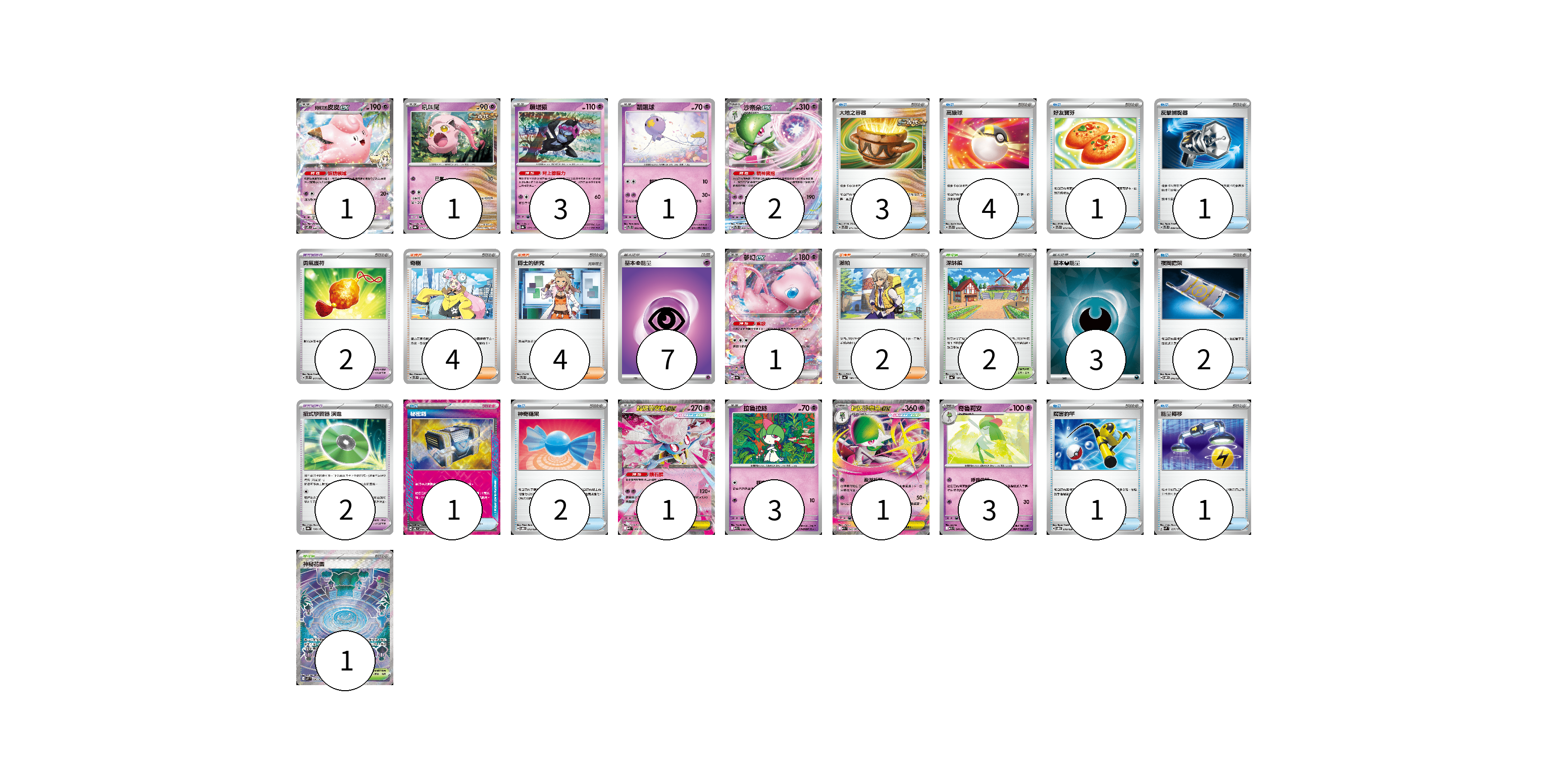 牌組構築方案 以此牌組為基礎新構築牌組 顯示卡面 顯示列表 寶可夢卡(17) 1 1 3 1 2 1 1 3 1 3 寶可夢道具(4) 2 2 物品卡(16) 3 4 1 1 2 1 2 1 1 支援者卡(10) 4 4 2 競技場卡(3) 2 1 能量卡(10) 7 3 寶可夢卡(17) 卡牌名稱 張數 卡牌名稱 張數 莉莉艾的皮皮ex SV9 033/100 01 吼叫尾 SV8a 071/187 01 願增猿 SV8a 075/187 03 飄飄球 SVTS 005/022 01 沙奈朵ex SVTS 004/022 02 夢幻ex SV4a 076/190 01 超級蒂安希ex MBD 006/022 01 拉魯拉絲 M1S 040/063 03 超級沙奈朵ex M1S 042/063 01 奇魯莉安 M1S 041/063 03 寶可夢道具(4) 卡牌名稱 張數 卡牌名稱 張數 勇氣護符 SVTS 017/022 02 招式學習器 演進 SV8a 160/187 02 物品卡(16) 卡牌名稱 張數 卡牌名稱 張數 大地之容器 SVTS 011/022 03 高級球 SVTS 014/022 04 好友寶芬 SVTS 012/022 01 反擊捕捉器 SVTS 009/022 01 夜間擔架 SVOM 016/021 02 秘密箱 SV6 092/101 01 神奇糖果 SVOD 013/020 02 厲害釣竿 SVOD 010/020 01 能量轉移 SVM 127/175 01 支援者卡(10) 卡牌名稱 張數 卡牌名稱 張數 奇樹 SVTS 018/022 04 博士的研究 SVTS 019/022 04 派帕 SV4a 180/190 02 競技場卡(3) 卡牌名稱 張數 卡牌名稱 張數 深缽鎮 SV4a 185/190 02 神秘花園 M1S 086/063 01 能量卡(10) 卡牌名稱 張數 卡牌名稱 張數 基本【超】能量 SVTS PSY 07 基本【惡】能量 SVOM DAR 03 以此牌組為基礎新構築牌組 牌組編碼 vsTlZC-aKQIso-bKxRRa copy 列印牌組單 牌組編碼已複製 分享至SNS