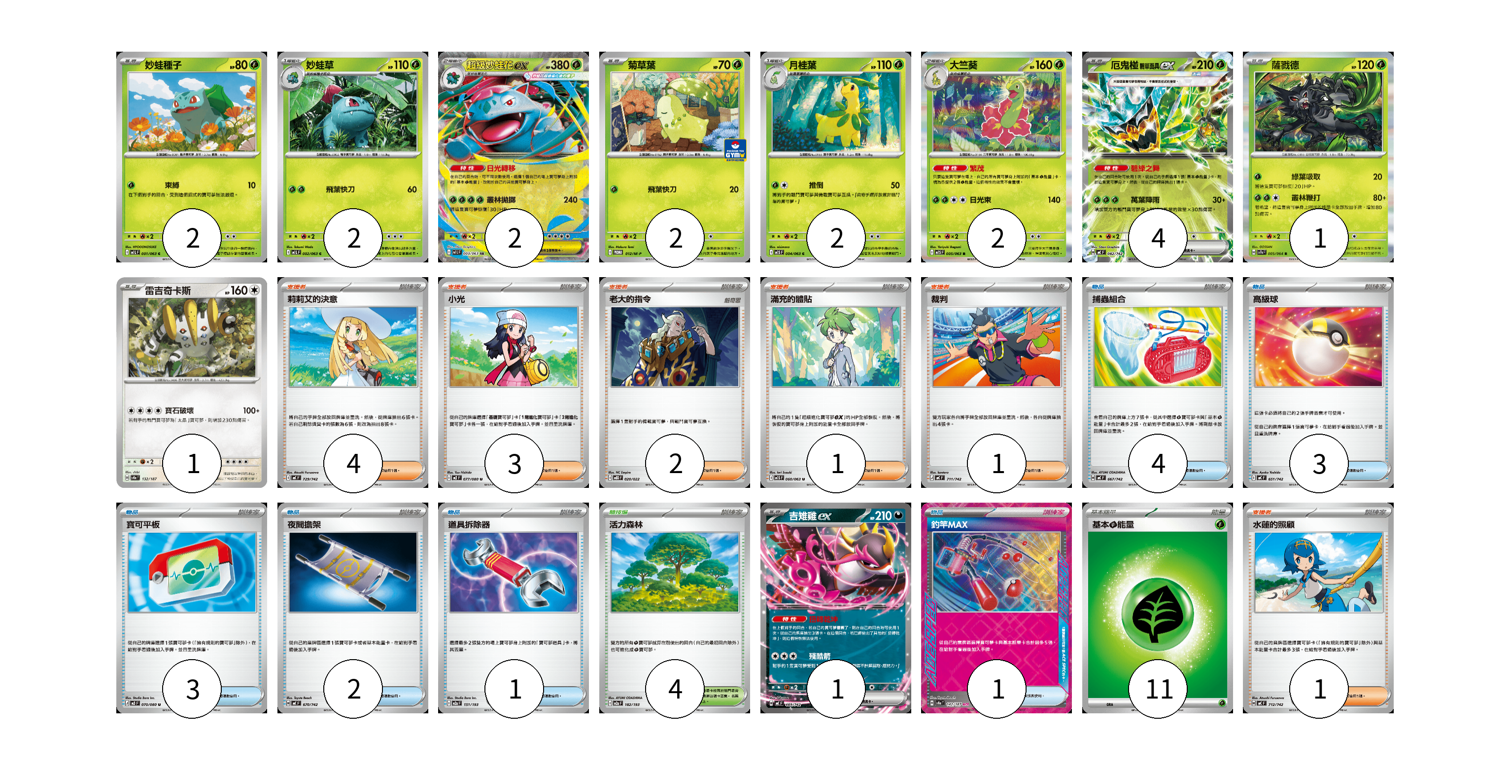 牌組構築方案 以此牌組為基礎新構築牌組 顯示卡面 顯示列表 寶可夢卡(19) 2 2 2 2 2 2 4 1 1 1 物品卡(14) 4 3 3 2 1 1 支援者卡(12) 4 3 2 1 1 1 競技場卡(4) 4 能量卡(11) 11 寶可夢卡(19) 卡牌名稱 張數 卡牌名稱 張數 妙蛙種子 M1L 001/063 02 妙蛙草 M1L 002/063 02 超級妙蛙花ex M1L 003/063 02 菊草葉 M-P 012/M-P 02 月桂葉 M1S 004/063 02 大竺葵 M1S 005/063 02 厄鬼椪 碧草面具ex MC 082/742 04 薩戮德 SV7a 005/064 01 雷吉奇卡斯 SV8a 132/187 01 吉雉雞ex MC 489/742 01 物品卡(14) 卡牌名稱 張數 卡牌名稱 張數 捕蟲組合 MC 667/742 04 高級球 MC 651/742 03 寶可平板 M3 070/080 03 夜間擔架 MC 670/742 02 道具拆除器 M2a 151/193 01 釣竿MAX SV8a 142/187 01 支援者卡(12) 卡牌名稱 張數 卡牌名稱 張數 莉莉艾的決意 MC 729/742 04 小光 M2 077/080 03 老大的指令 MBD 020/022 02 滿充的體貼 M1S 060/063 01 裁判 MC 711/742 01 水蓮的照顧 MC 712/742 01 競技場卡(4) 卡牌名稱 張數 卡牌名稱 張數 活力森林 M2a 182/193 04 能量卡(11) 卡牌名稱 張數 卡牌名稱 張數 基本【草】能量 MC GRA 11 以此牌組為基礎新構築牌組 牌組編碼 vsUyrt-dfVLHX-CJvpzA copy 列印牌組單 牌組編碼已複製 分享至SNS