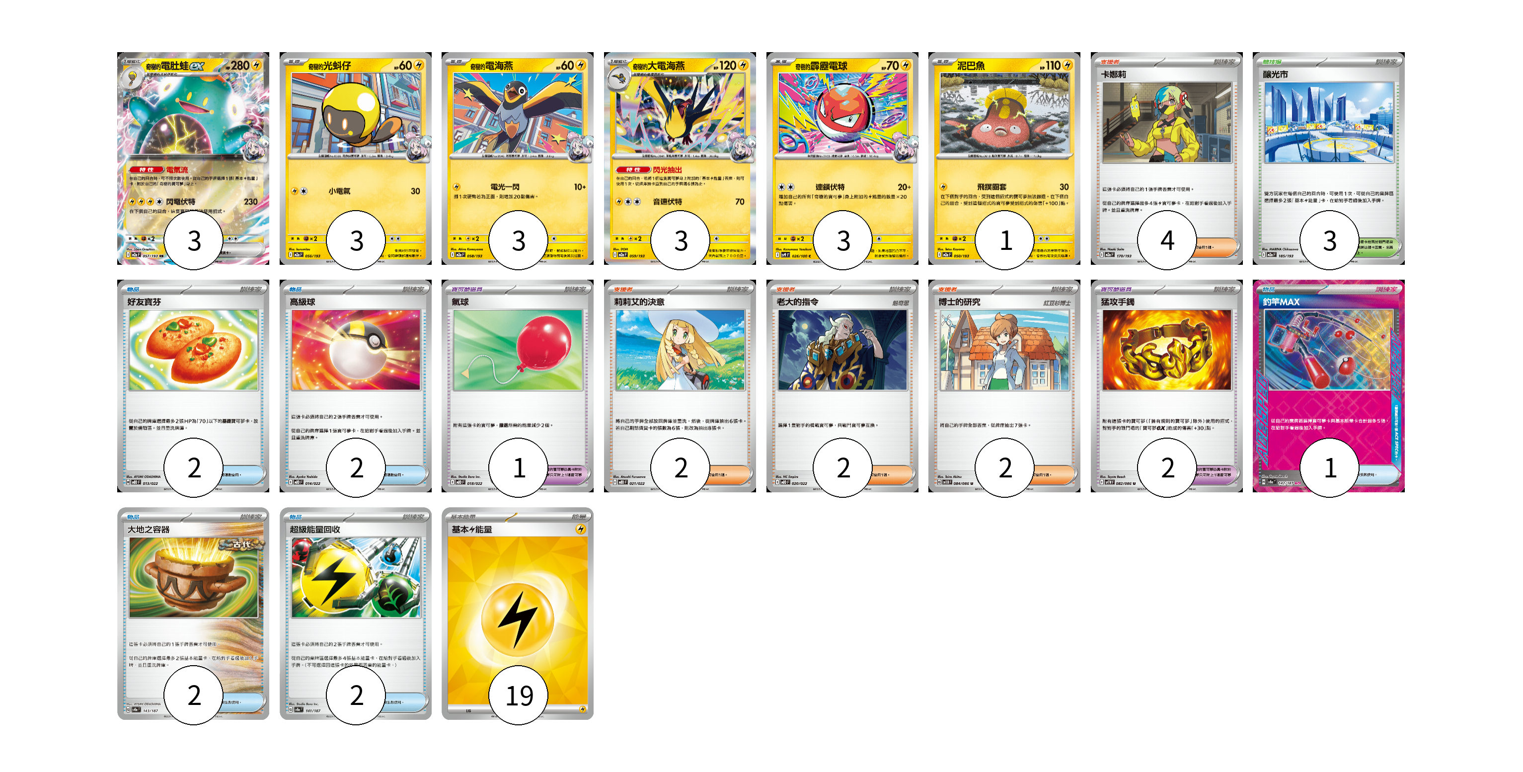牌組構築方案 以此牌組為基礎新構築牌組 顯示卡面 顯示列表 寶可夢卡(16) 3 3 3 3 3 1 寶可夢道具(2) 2 物品卡(10) 2 2 1 1 2 2 支援者卡(10) 4 2 2 2 競技場卡(3) 3 能量卡(19) 19 寶可夢卡(16) 卡牌名稱 張數 卡牌名稱 張數 奇樹的電肚蛙ex M2a 057/193 03 奇樹的光蚪仔 M2a 056/193 03 奇樹的電海燕 M2a 058/193 03 奇樹的大電海燕 M2a 059/193 03 奇樹的霹靂電球 SV9 026/100 03 泥巴魚 M2a 050/193 01 寶可夢道具(2) 卡牌名稱 張數 卡牌名稱 張數 猛攻手鐲 SV11W 082/086 02 物品卡(10) 卡牌名稱 張數 卡牌名稱 張數 好友寶芬 MBD 013/022 02 高級球 MBD 014/022 02 氣球 MBD 018/022 01 釣竿MAX SV8a 142/187 01 大地之容器 SV8a 143/187 02 超級能量回收 SV8a 141/187 02 支援者卡(10) 卡牌名稱 張數 卡牌名稱 張數 卡娜莉 M2a 170/193 04 莉莉艾的決意 MBD 021/022 02 老大的指令 MBD 020/022 02 博士的研究 SV11B 084/086 02 競技場卡(3) 卡牌名稱 張數 卡牌名稱 張數 釀光市 M2a 185/193 03 能量卡(19) 卡牌名稱 張數 卡牌名稱 張數 基本【雷】能量 SVQP LIG 19 以此牌組為基礎新構築牌組 牌組編碼 vveMjl-kZNEfA-sgQDZj copy 列印牌組單 牌組編碼已複製 分享至SNS