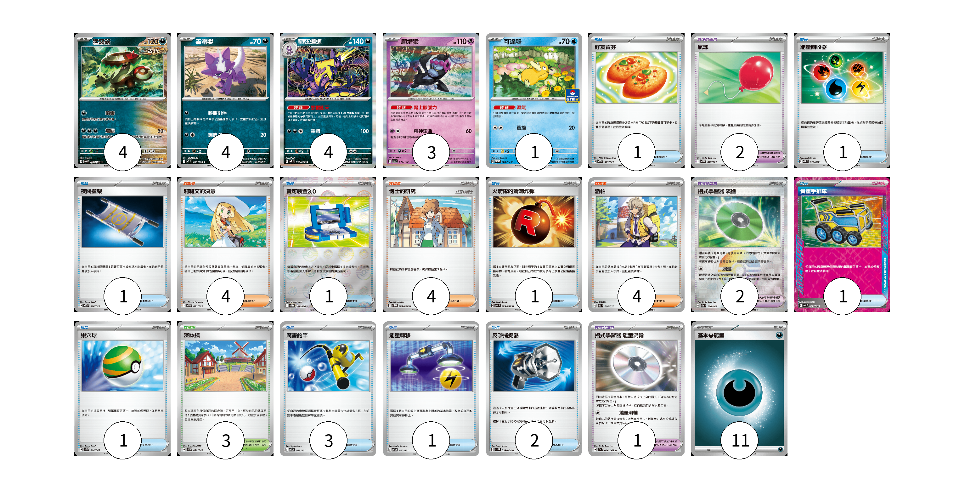 牌組構築方案 以此牌組為基礎新構築牌組 顯示卡面 顯示列表 寶可夢卡(16) 4 4 4 3 1 寶可夢道具(3) 2 1 物品卡(15) 1 2 1 1 1 1 1 1 3 1 2 支援者卡(12) 4 4 4 競技場卡(3) 3 能量卡(11) 11 寶可夢卡(16) 卡牌名稱 張數 卡牌名稱 張數 猛惡菇 SV6 071/101 04 毒電嬰 M2 056/080 04 顫弦蠑螈 M2 057/080 04 願增猿 SV8a 075/187 03 可達鴨 SV-P 220/SV-P 01 寶可夢道具(3) 卡牌名稱 張數 卡牌名稱 張數 招式學習器 演進 SV8a 160/187 02 招式學習器 能量渦輪 SV3a 056/062 01 物品卡(15) 卡牌名稱 張數 卡牌名稱 張數 好友寶芬 MBD 013/022 01 氣球 MBD 018/022 02 能量回收器 MBD 012/022 01 夜間擔架 MBD 016/022 01 寶可裝置3.0 SV11B 081/086 01 火箭隊的驚嚇炸彈 SV10 089/098 01 貴重手推車 SVK 020/042 01 巢穴球 SVK 016/042 01 厲害釣竿 SVTL 009/021 03 能量轉移 SVTR 010/021 01 反擊捕捉器 SV4M 059/066 02 支援者卡(12) 卡牌名稱 張數 卡牌名稱 張數 莉莉艾的決意 MBD 021/022 04 博士的研究 SV11B 084/086 04 派帕 SVOD 018/020 04 競技場卡(3) 卡牌名稱 張數 卡牌名稱 張數 深缽鎮 SVK 039/042 03 能量卡(11) 卡牌名稱 張數 卡牌名稱 張數 基本【惡】能量 MBG DAR 11 以此牌組為基礎新構築牌組 牌組編碼 wDilAA-WVplfy-rVZgSa copy 列印牌組單 牌組編碼已複製 分享至SNS