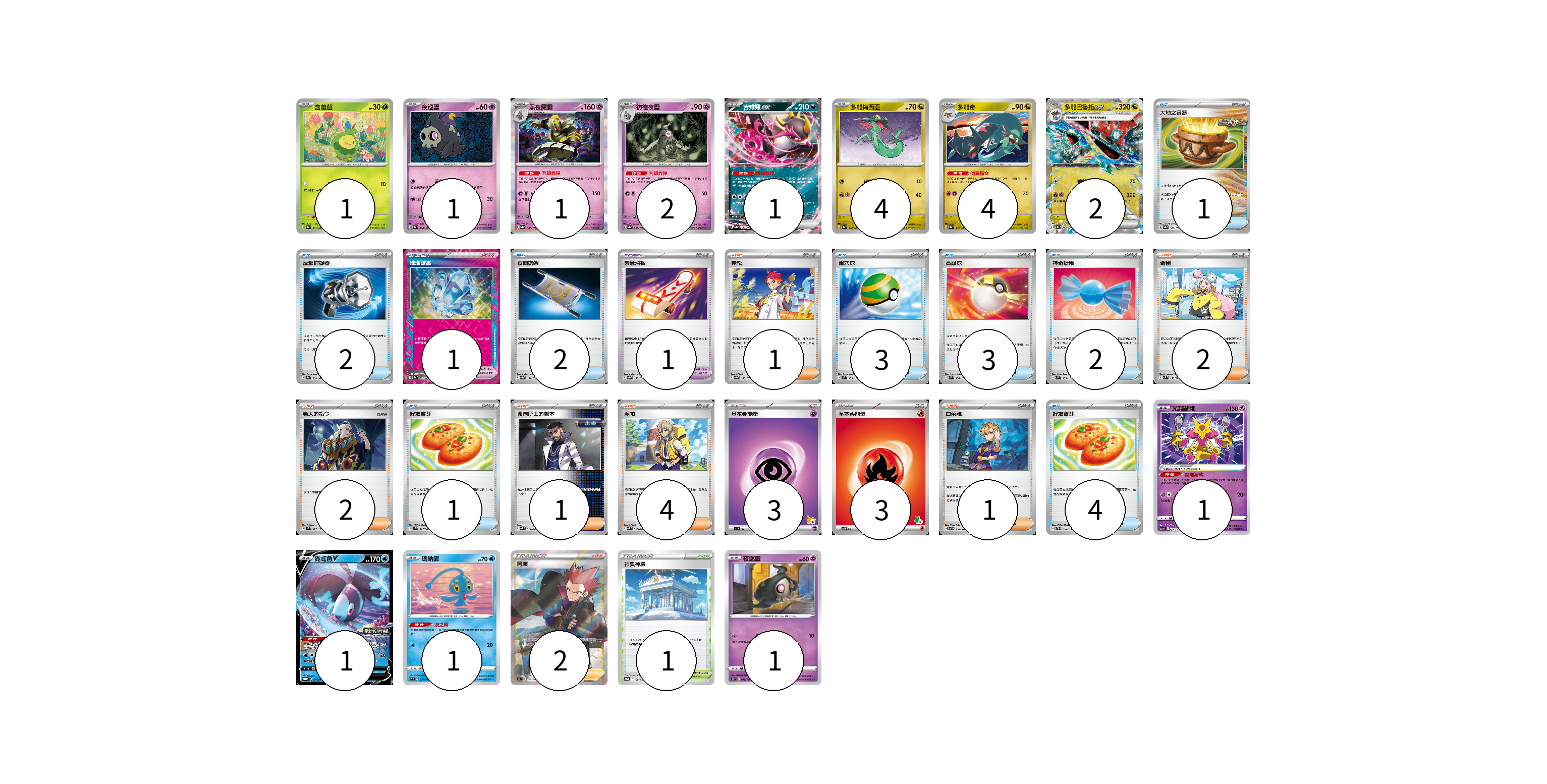 牌組構築方案 以此牌組為基礎新構築牌組 顯示卡面 顯示列表 寶可夢卡(20) 1 1 1 2 1 4 4 2 1 1 1 1 寶可夢道具(2) 1 1 物品卡(18) 1 2 2 3 3 2 1 4 支援者卡(13) 1 2 2 1 4 1 2 競技場卡(1) 1 能量卡(6) 3 3 寶可夢卡(20) 卡牌名稱 張數 卡牌名稱 張數 含羞苞 SV8a 001/187 01 夜巡靈 SV8a 064/187 01 黑夜魔靈 SV8a 066/187 01 彷徨夜靈 SV8a 065/187 02 吉雉雞ex SV8a 104/187 01 多龍梅西亞 SV8a 118/187 04 多龍奇 SV8a 119/187 04 多龍巴魯托ex SV8a 120/187 02 光輝胡地 SVTM 006/022 01 霓虹魚V SV-P 134/SV-P 01 瑪納霏 S9 031/100 01 夜巡靈 S9 045/100 01 寶可夢道具(2) 卡牌名稱 張數 卡牌名稱 張數 璀璨結晶 SV8a 152/187 01 緊急滑板 SV8a 153/187 01 物品卡(18) 卡牌名稱 張數 卡牌名稱 張數 大地之容器 SV8a 143/187 01 反擊捕捉器 SV8a 139/187 02 夜間擔架 SV8a 151/187 02 巢穴球 SVM 133/175 03 高級球 SVM 134/175 03 神奇糖果 SVM 135/175 02 好友寶芬 SVK 015/042 01 好友寶芬 SVTL 010/021 04 支援者卡(13) 卡牌名稱 張數 卡牌名稱 張數 赤松 SV8a 163/187 01 奇樹 SVM 160/175 02 老大的指令 SVM 172/175 02 弗圖博士的劇本 SVK 034/042 01 派帕 SVK 035/042 04 白蕾雅 SV7 100/102 01 阿渡 S12 114/098 02 競技場卡(1) 卡牌名稱 張數 卡牌名稱 張數 神奧神殿 S12a 169/172 01 能量卡(6) 卡牌名稱 張數 卡牌名稱 張數 基本【超】能量 SVI PSY 03 基本【火】能量 SVI FIR 03 以此牌組為基礎新構築牌組 牌組編碼 wEVuZp-jsuaOE-vcQtnx copy 列印牌組單 牌組編碼已複製 分享至SNS