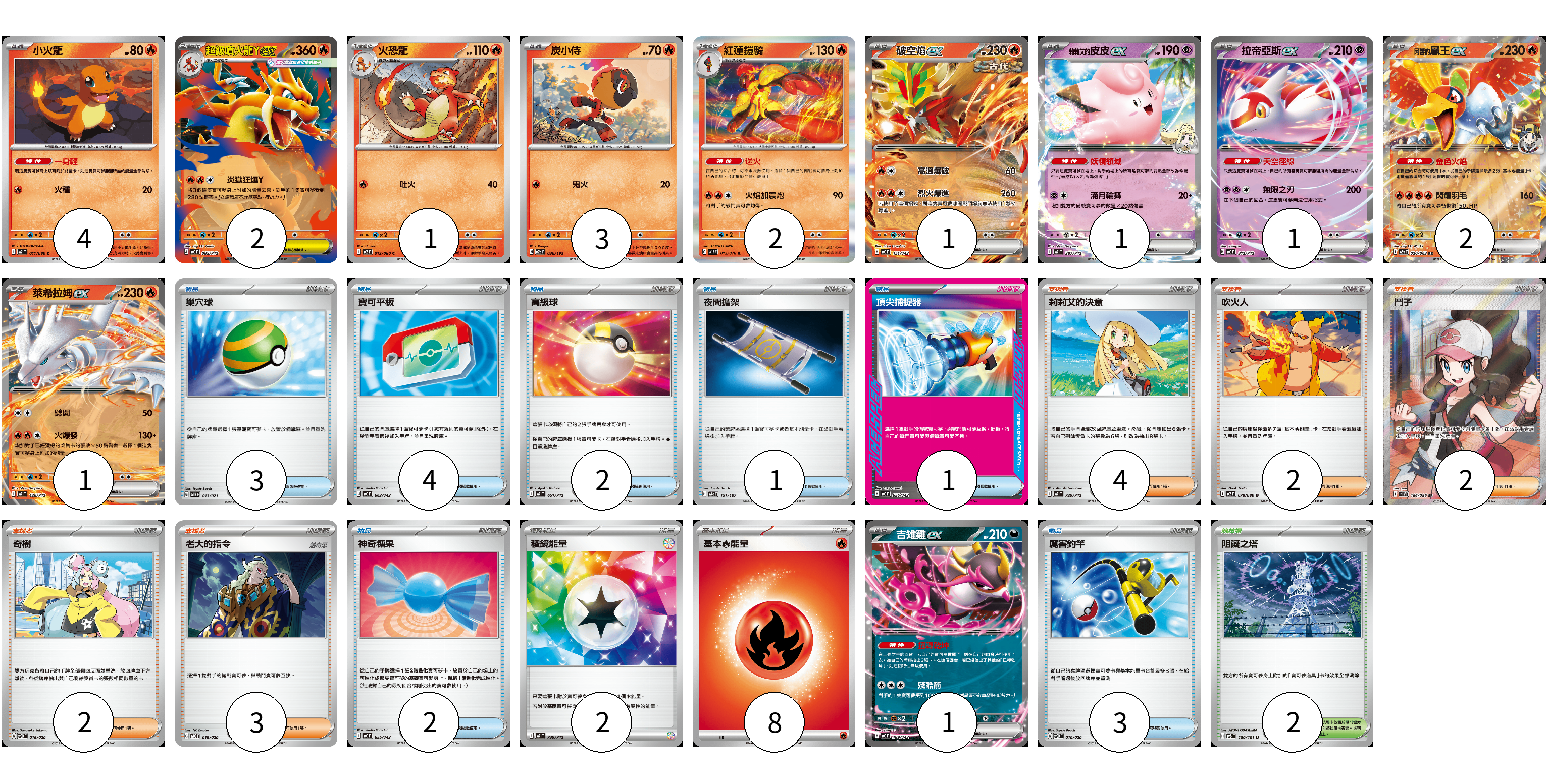 牌組構築方案 以此牌組為基礎新構築牌組 顯示卡面 顯示列表 寶可夢卡(19) 4 2 1 3 2 1 1 1 2 1 1 物品卡(16) 3 4 2 1 1 2 3 支援者卡(13) 4 2 2 2 3 競技場卡(2) 2 能量卡(10) 2 8 寶可夢卡(19) 卡牌名稱 張數 卡牌名稱 張數 小火龍 M2 011/080 04 超級噴火龍Yex MC 085/742 02 火恐龍 M2 012/080 01 炭小侍 M2a 030/193 03 紅蓮鎧騎 SV1S 012/078 02 破空焰ex MC 151/742 01 莉莉艾的皮皮ex MC 287/742 01 拉帝亞斯ex MC 312/742 01 <阿響的>鳳王ex SV9a 020/063 02 萊希拉姆ex MC 126/742 01 吉雉雞ex MC 489/742 01 物品卡(16) 卡牌名稱 張數 卡牌名稱 張數 巢穴球 SVTR 013/021 03 寶可平板 MC 662/742 04 高級球 MC 651/742 02 夜間擔架 SV8a 151/187 01 頂尖捕捉器 MC 656/742 01 神奇糖果 MC 655/742 02 厲害釣竿 SVOD 010/020 03 支援者卡(13) 卡牌名稱 張數 卡牌名稱 張數 莉莉艾的決意 MC 729/742 04 吹火人 M2 078/080 02 鬥子 SV11W 166/086 02 奇樹 SVOD 016/020 02 老大的指令 SVOD 019/020 03 競技場卡(2) 卡牌名稱 張數 卡牌名稱 張數 阻礙之塔 SV6 100/101 02 能量卡(10) 卡牌名稱 張數 卡牌名稱 張數 稜鏡能量 MC 739/742 02 基本【火】能量 MC FIR 08 以此牌組為基礎新構築牌組 牌組編碼 wHiHsu-ycnyiI-WLFFmf copy 列印牌組單 牌組編碼已複製 分享至SNS