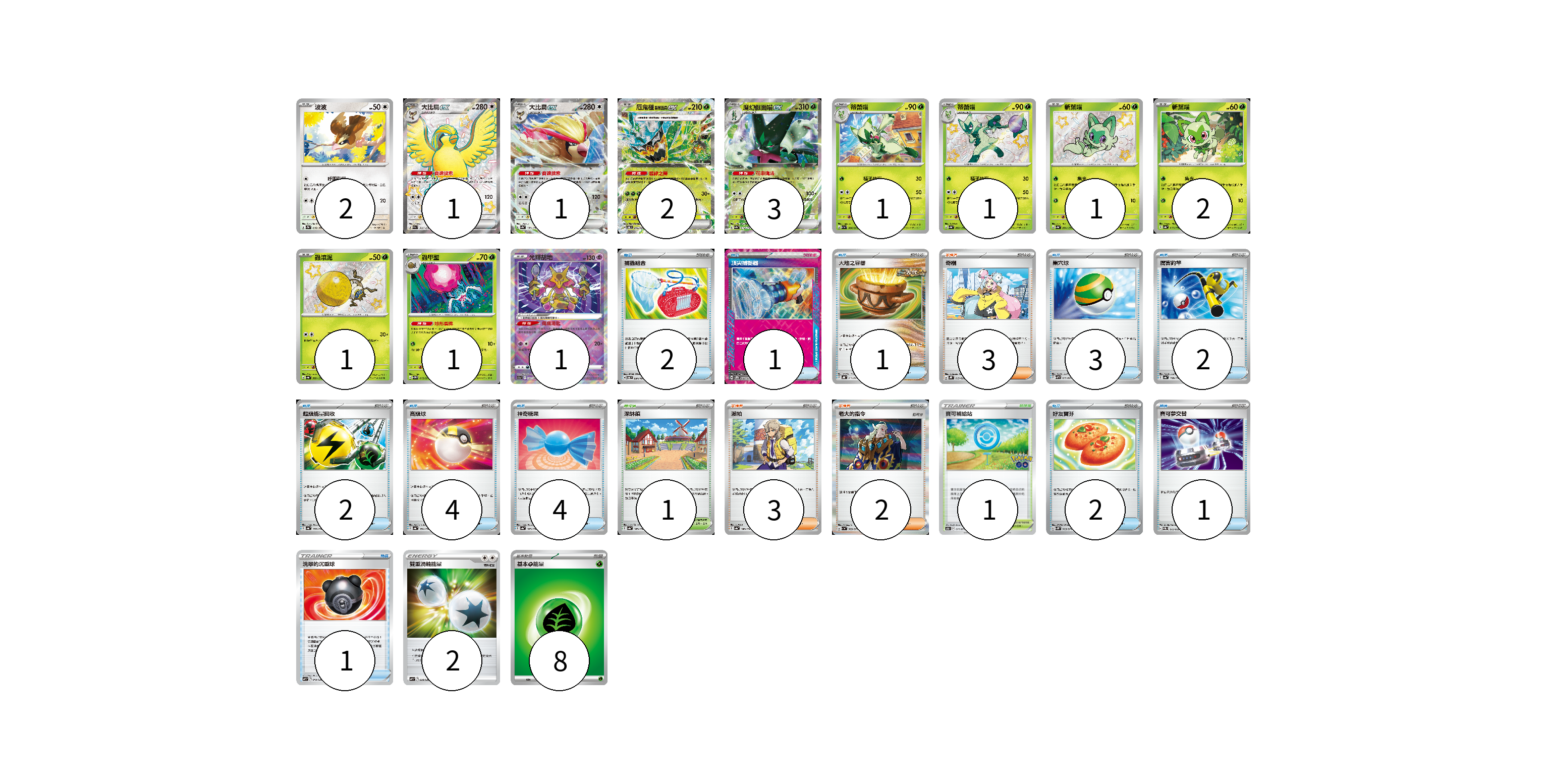 牌組構築方案 以此牌組為基礎新構築牌組 顯示卡面 顯示列表 寶可夢卡(17) 2 1 1 2 3 1 1 1 2 1 1 1 物品卡(23) 2 1 1 3 2 2 4 4 2 1 1 支援者卡(8) 3 3 2 競技場卡(2) 1 1 能量卡(10) 2 8 寶可夢卡(17) 卡牌名稱 張數 卡牌名稱 張數 波波 SV2a 016/165 02 大比鳥ex SV4a 335/190 01 大比鳥ex SV4a 139/190 01 厄鬼椪 碧草面具ex SV6 016/101 02 魔幻假面喵ex SV4a 014/190 03 蒂蕾喵 SV1a 006/073 01 蒂蕾喵 SV4a 202/190 01 新葉喵 SV4a 201/190 01 新葉喵 SV4a 012/190 02 蟲滾泥 SV4a 209/190 01 蟲甲聖 SV5M 015/071 01 光輝胡地 S11a 031/068 01 物品卡(23) 卡牌名稱 張數 卡牌名稱 張數 捕蟲組合 SV6 094/101 02 頂尖捕捉器 SV5M 062/071 01 大地之容器 SVHK 011/022 01 巢穴球 SVHM 012/022 03 厲害釣竿 SV4a 158/190 02 超級能量回收 SV4a 157/190 02 高級球 SV4a 161/190 04 神奇糖果 SV4a 163/190 04 好友寶芬 SV5K 063/071 02 寶可夢交替 SVEM 015/020 01 洗翠的沉重球 SVF 019/038 01 支援者卡(8) 卡牌名稱 張數 卡牌名稱 張數 奇樹 SVHK 019/022 03 派帕 SV4a 180/190 03 老大的指令 SV1a 069/073 02 競技場卡(2) 卡牌名稱 張數 卡牌名稱 張數 深缽鎮 SV4a 185/190 01 寶可補給站 S10b 071/071 01 能量卡(10) 卡牌名稱 張數 卡牌名稱 張數 雙重渦輪能量 SVF 038/038 02 基本【草】能量 SVF GRA 08 以此牌組為基礎新構築牌組 牌組編碼 wMfsKk-pBgkoe-fpNFuf copy 列印牌組單 牌組編碼已複製 分享至SNS