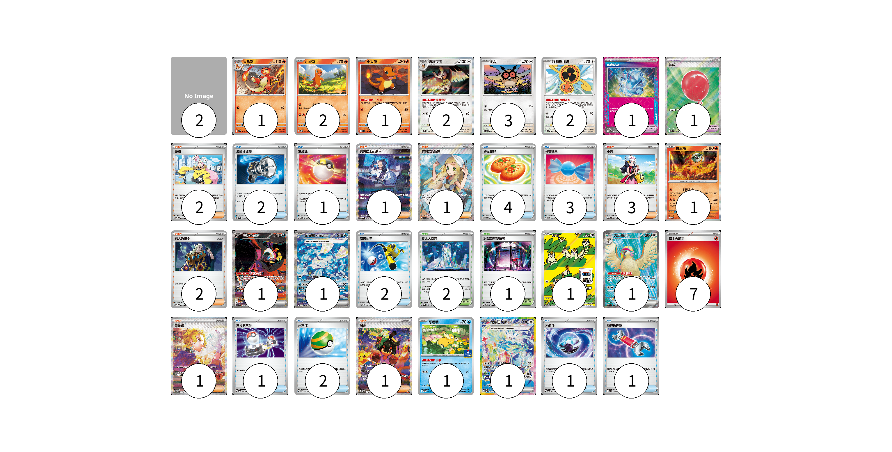 牌組構築方案 以此牌組為基礎新構築牌組 顯示卡面 顯示列表 寶可夢卡(18) 1 2 1 2 3 2 1 1 1 1 1 1 1 寶可夢道具(2) 1 1 物品卡(17) 2 1 4 3 2 1 2 1 1 支援者卡(11) 2 1 1 3 2 1 1 競技場卡(3) 2 1 能量卡(7) 7 寶可夢卡(18) 卡牌名稱 張數 卡牌名稱 張數 火恐龍 M2 012/080 01 小火龍 SVTL 001/021 02 小火龍 M2 011/080 01 貓頭夜鷹 SV8a 128/187 02 咕咕 SV7 076/102 03 旋轉洛托姆 SV8a 131/187 02 古玉魚 SV8a 025/187 01 吉雉雞ex SV6a 089/064 01 厄鬼椪 水井面具ex SV6 127/101 01 波波 SV3 118/108 01 大比鳥ex SV3 128/108 01 可達鴨 SV-P 220/SV-P 01 太樂巴戈斯ex SV8a 226/187 01 寶可夢道具(2) 卡牌名稱 張數 卡牌名稱 張數 璀璨結晶 SV8a 152/187 01 氣球 M1L 084/063 01 物品卡(17) 卡牌名稱 張數 卡牌名稱 張數 反擊捕捉器 SV8a 139/187 02 高級球 MBD 014/022 01 好友寶芬 SVTG 011/019 04 神奇糖果 SVEL 013/020 03 厲害釣竿 SVTH 008/018 02 寶可夢交替 SVQP 016/023 01 巢穴球 SVTG 012/019 02 太晶珠 M2a 152/193 01 道具拆除器 M2a 151/193 01 支援者卡(11) 卡牌名稱 張數 卡牌名稱 張數 奇樹 SVOD 016/020 02 弗圖博士的劇本 SV4M 091/066 01 莉莉艾的決意 M1L 086/063 01 小光 M2 077/080 03 老大的指令 SVOD 019/020 02 白蕾雅 SV7 132/102 01 烏栗 SV6 129/101 01 競技場卡(3) 卡牌名稱 張數 卡牌名稱 張數 零之大空洞 SV8a 182/187 02 對戰圓形競技場 M2 079/080 01 能量卡(7) 卡牌名稱 張數 卡牌名稱 張數 基本【火】能量 M-P FIR 07 以此牌組為基礎新構築牌組 牌組編碼 wNlriH-XAXoCm-AjplJE copy 列印牌組單 牌組編碼已複製 分享至SNS