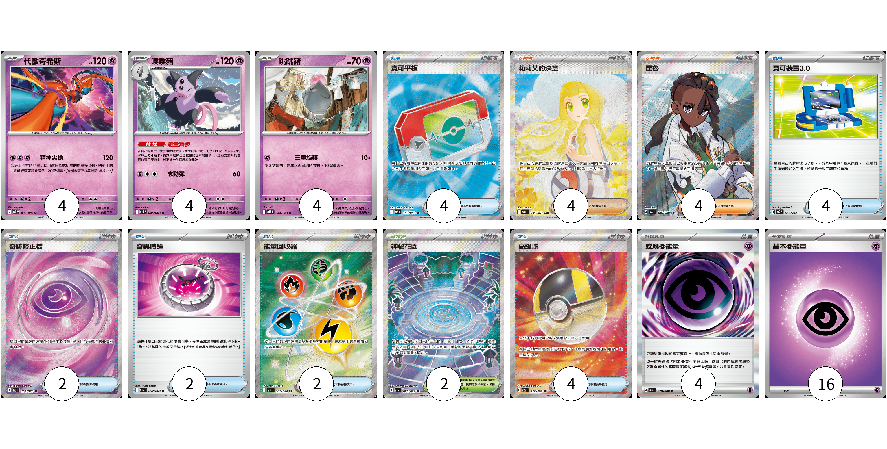 牌組構築方案 以此牌組為基礎新構築牌組 顯示卡面 顯示列表 寶可夢卡(12) 4 4 4 物品卡(18) 4 4 2 2 2 4 支援者卡(8) 4 4 競技場卡(2) 2 能量卡(20) 4 16 寶可夢卡(12) 卡牌名稱 張數 卡牌名稱 張數 代歐奇希斯 M4 032/083 04 噗噗豬 M1S 045/063 04 跳跳豬 M1S 044/063 04 物品卡(18) 卡牌名稱 張數 卡牌名稱 張數 寶可平板 M3 103/080 04 寶可裝置3.0 MC 660/742 04 奇跡修正檔 M3 104/080 02 奇異時鐘 M1S 057/063 02 能量回收器 M3 101/080 02 高級球 M2a 216/193 04 支援者卡(8) 卡牌名稱 張數 卡牌名稱 張數 莉莉艾的決意 M1L 091/063 04 琵魯 M3 106/080 04 競技場卡(2) 卡牌名稱 張數 卡牌名稱 張數 神秘花園 M1S 086/063 02 能量卡(20) 卡牌名稱 張數 卡牌名稱 張數 感應【超】能量 M3 079/080 04 基本【超】能量 MBD PSY 16 以此牌組為基礎新構築牌組 牌組編碼 wQSoRf-bkFLsq-tdBdmR copy 列印牌組單 牌組編碼已複製 分享至SNS