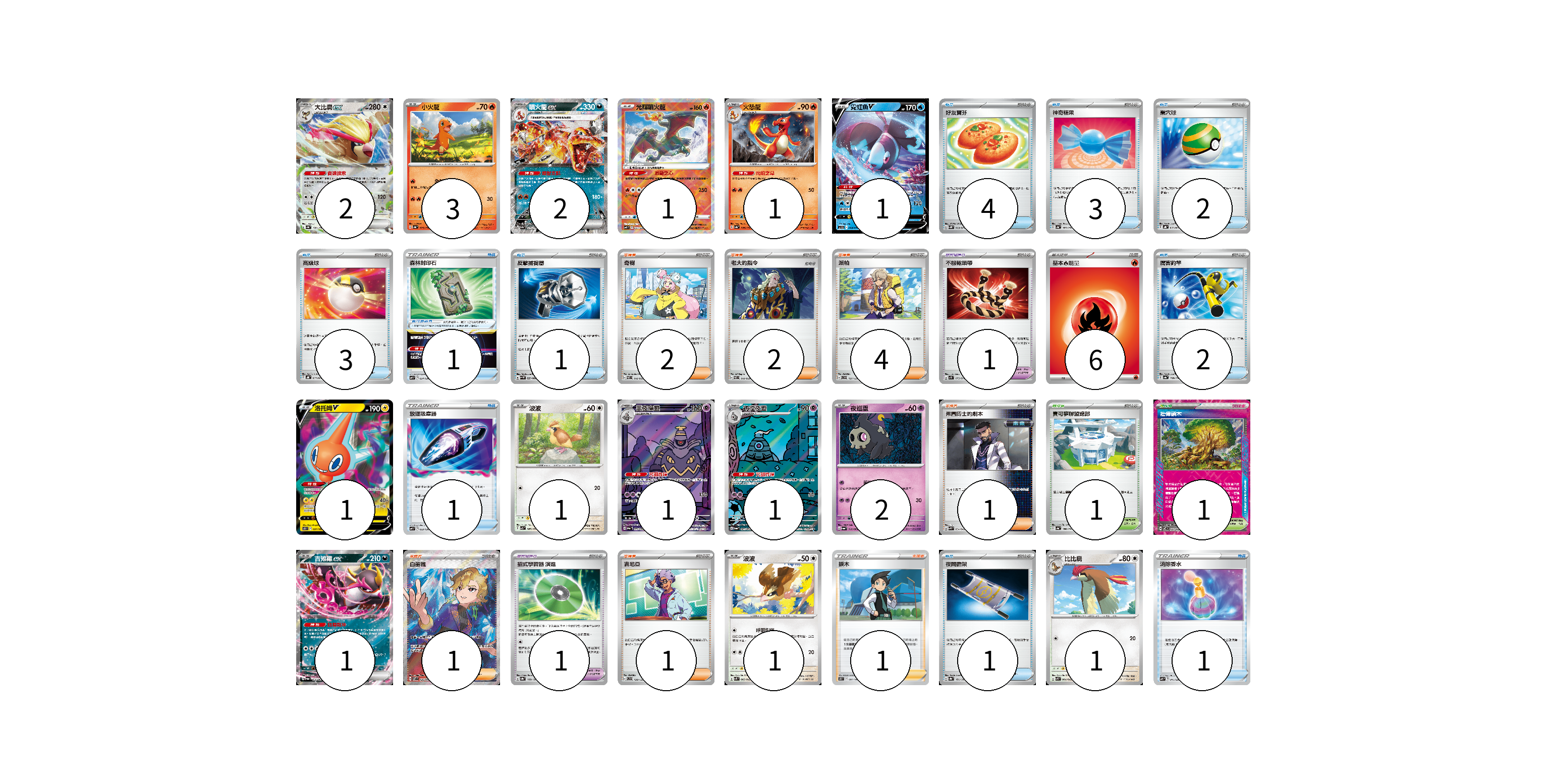 牌組構築方案 以此牌組為基礎新構築牌組 顯示卡面 顯示列表 寶可夢卡(19) 2 3 2 1 1 1 1 1 1 1 2 1 1 1 寶可夢道具(2) 1 1 物品卡(19) 4 3 2 3 1 1 2 1 1 1 支援者卡(12) 2 2 4 1 1 1 1 競技場卡(2) 1 1 能量卡(6) 6 寶可夢卡(19) 卡牌名稱 張數 卡牌名稱 張數 大比鳥ex SV4a 139/190 02 小火龍 SV4a 025/190 03 噴火龍ex SV4a 115/190 02 光輝噴火龍 SVF 001/038 01 火恐龍 SV4a 026/190 01 霓虹魚V SVHK 004/022 01 洛托姆V S11 037/100 01 波波 SV3 087/108 01 黑夜魔靈 SV6a 070/064 01 彷徨夜靈 SV6a 069/064 01 夜巡靈 SV6a 018/064 02 吉雉雞ex SV6a 038/064 01 波波 SVK 003/042 01 比比鳥 SVK 004/042 01 寶可夢道具(2) 卡牌名稱 張數 卡牌名稱 張數 不服輸頭帶 SV1S 073/078 01 招式學習器 演進 SV8a 160/187 01 物品卡(19) 卡牌名稱 張數 卡牌名稱 張數 好友寶芬 SV5K 063/071 04 神奇糖果 SV4a 163/190 03 巢穴球 SVHK 012/022 02 高級球 SVHK 013/022 03 森林封印石 SVF 024/038 01 反擊捕捉器 SV4M 059/066 01 厲害釣竿 SV4a 158/190 02 放逐吸塵器 SVF 023/038 01 夜間擔架 SV8a 151/187 01 消除香水 SVF 011/038 01 支援者卡(12) 卡牌名稱 張數 卡牌名稱 張數 奇樹 SVEL 016/020 02 老大的指令 SVEL 019/020 02 派帕 SVD 137/139 04 弗圖博士的劇本 SVK 034/042 01 白蕾雅 SV7 126/102 01 吉尼亞 SVD 129/139 01 捩木 S11 097/100 01 競技場卡(2) 卡牌名稱 張數 卡牌名稱 張數 寶可夢聯盟總部 SV4a 186/190 01 壯偉碩木 SV7 101/102 01 能量卡(6) 卡牌名稱 張數 卡牌名稱 張數 基本火能量 sv-p FIR 06 以此牌組為基礎新構築牌組 牌組編碼 wQWcBI-ONbXOc-CnIqvB copy 列印牌組單 牌組編碼已複製 分享至SNS