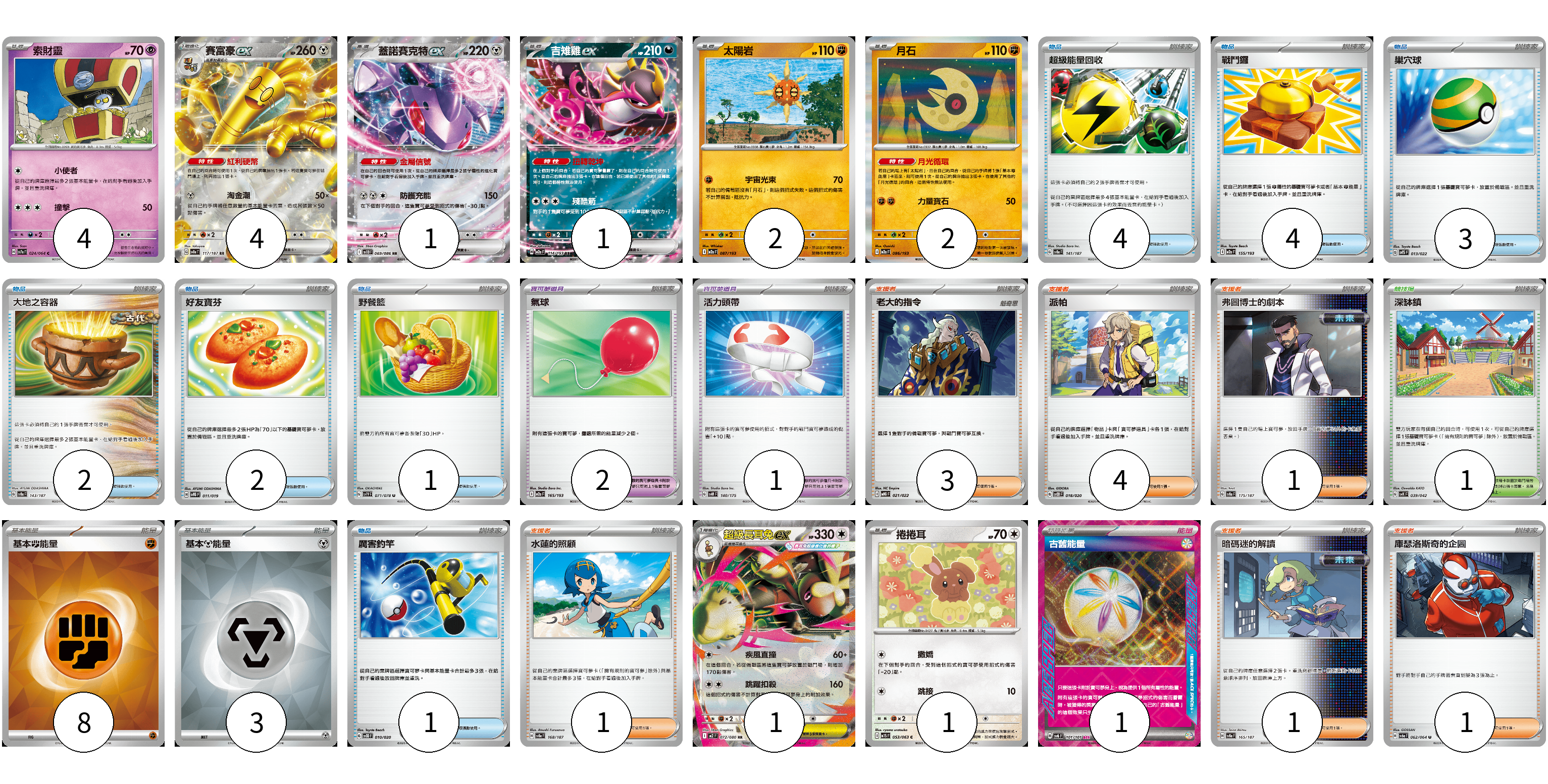 牌組構築方案 以此牌組為基礎新構築牌組 顯示卡面 顯示列表 寶可夢卡(16) 4 4 1 1 2 2 1 1 寶可夢道具(3) 2 1 物品卡(17) 4 4 3 2 2 1 1 支援者卡(11) 3 4 1 1 1 1 競技場卡(1) 1 能量卡(12) 8 3 1 寶可夢卡(16) 卡牌名稱 張數 卡牌名稱 張數 索財靈 SV7a 024/064 04 賽富豪ex SV8a 117/187 04 蓋諾賽克特ex SV11B 069/086 01 吉雉雞ex M2a 114/193 01 太陽岩 M2a 087/193 02 月石 M2a 086/193 02 超級長耳兔ex M2 072/080 01 捲捲耳 M1S 053/063 01 寶可夢道具(3) 卡牌名稱 張數 卡牌名稱 張數 氣球 M2a 165/193 02 活力頭帶 SVM 140/175 01 物品卡(17) 卡牌名稱 張數 卡牌名稱 張數 超級能量回收 SV8a 141/187 04 戰鬥鑼 M2a 155/193 04 巢穴球 SVTS 013/022 03 大地之容器 SV8a 143/187 02 好友寶芬 SVTG 011/019 02 野餐籃 SV1V 071/078 01 厲害釣竿 SVOD 010/020 01 支援者卡(11) 卡牌名稱 張數 卡牌名稱 張數 老大的指令 MBG 021/022 03 派帕 SVOD 018/020 04 弗圖博士的劇本 SV8a 175/187 01 水蓮的照顧 SV8a 168/187 01 暗碼迷的解讀 SV8a 165/187 01 庫瑟洛斯奇的企圖 SV6a 062/064 01 競技場卡(1) 卡牌名稱 張數 卡牌名稱 張數 深缽鎮 SVK 039/042 01 能量卡(12) 卡牌名稱 張數 卡牌名稱 張數 基本【鬥】能量 SVK FIG 08 基本【鋼】能量 SVK MET 03 古舊能量 SV6 101/101 01 以此牌組為基礎新構築牌組 牌組編碼 wYmvxc-wMbhGP-jXBlvQ copy 列印牌組單 牌組編碼已複製 分享至SNS