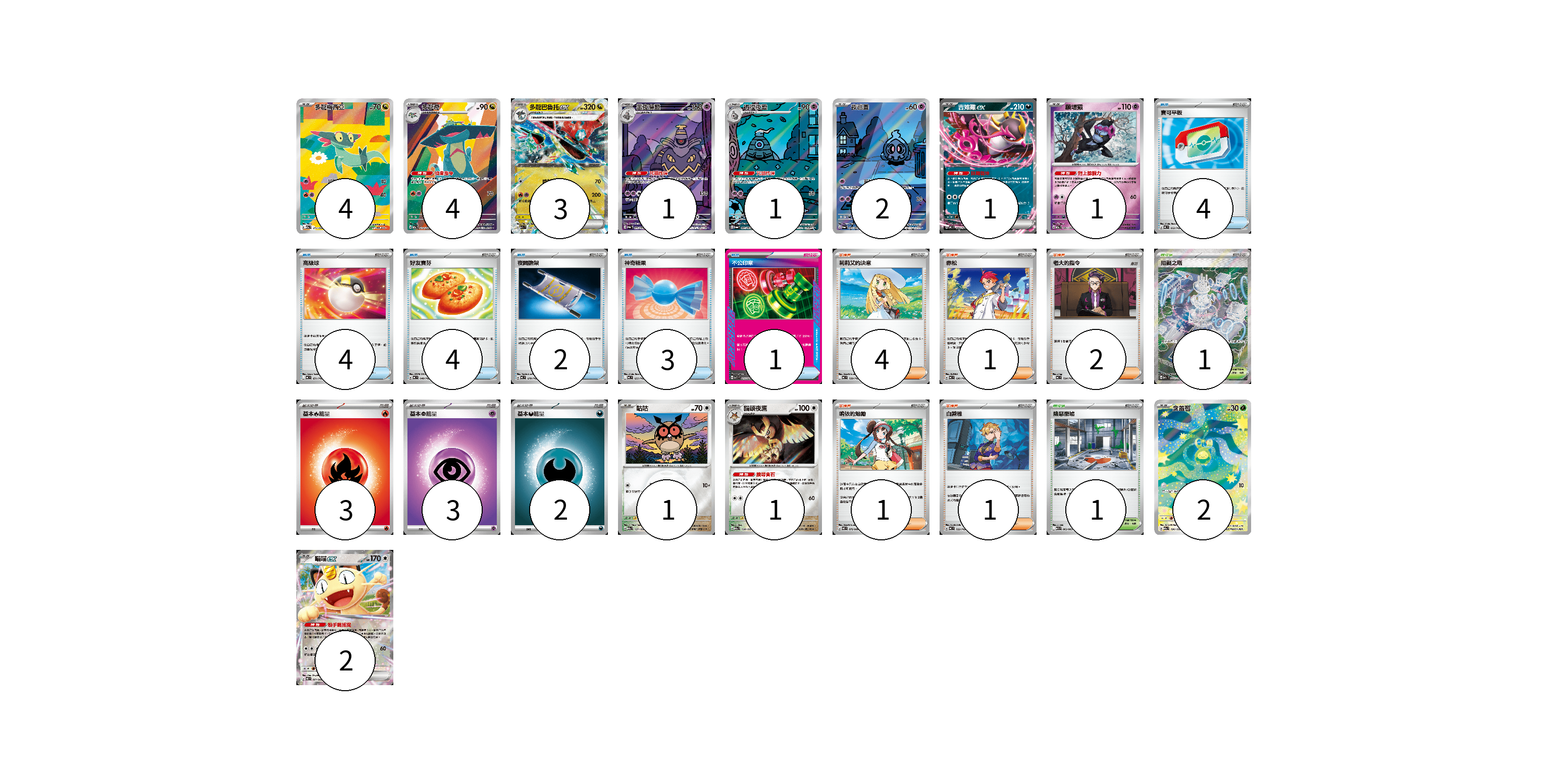 牌組構築方案 以此牌組為基礎新構築牌組 顯示卡面 顯示列表 寶可夢卡(23) 4 4 3 1 1 2 1 1 1 1 2 2 物品卡(18) 4 4 4 2 3 1 支援者卡(9) 4 1 2 1 1 競技場卡(2) 1 1 能量卡(8) 3 3 2 寶可夢卡(23) 卡牌名稱 張數 卡牌名稱 張數 多龍梅西亞 M2a 211/193 04 多龍奇 M2a 212/193 04 多龍巴魯托ex M2a 134/193 03 黑夜魔靈 SV6a 070/064 01 彷徨夜靈 SV6a 069/064 01 夜巡靈 SV6a 068/064 02 吉雉雞ex MC 489/742 01 願增猿 M2a 081/193 01 咕咕 M2a 137/193 01 貓頭夜鷹 M2a 138/193 01 含羞苞 M2a 196/193 02 喵喵ex M3 061/080 02 物品卡(18) 卡牌名稱 張數 卡牌名稱 張數 寶可平板 MC 662/742 04 高級球 MC 651/742 04 好友寶芬 MC 648/742 04 夜間擔架 MC 670/742 02 神奇糖果 MC 655/742 03 不公印章 MBD 011/022 01 支援者卡(9) 卡牌名稱 張數 卡牌名稱 張數 莉莉艾的決意 MC 729/742 04 赤松 MC 696/742 01 老大的指令 MC 724/742 02 鳴依的勉勵 M3 075/080 01 白蕾雅 MC 722/742 01 競技場卡(2) 卡牌名稱 張數 卡牌名稱 張數 阻礙之塔 M2a 222/193 01 險惡廢墟 M1L 063/063 01 能量卡(8) 卡牌名稱 張數 卡牌名稱 張數 基本【火】能量 MC FIR 03 基本【超】能量 MC PSY 03 基本【惡】能量 MC DAR 02 以此牌組為基礎新構築牌組 牌組編碼 wZnHth-HbIfJk-kuAdGS copy 列印牌組單 牌組編碼已複製 分享至SNS