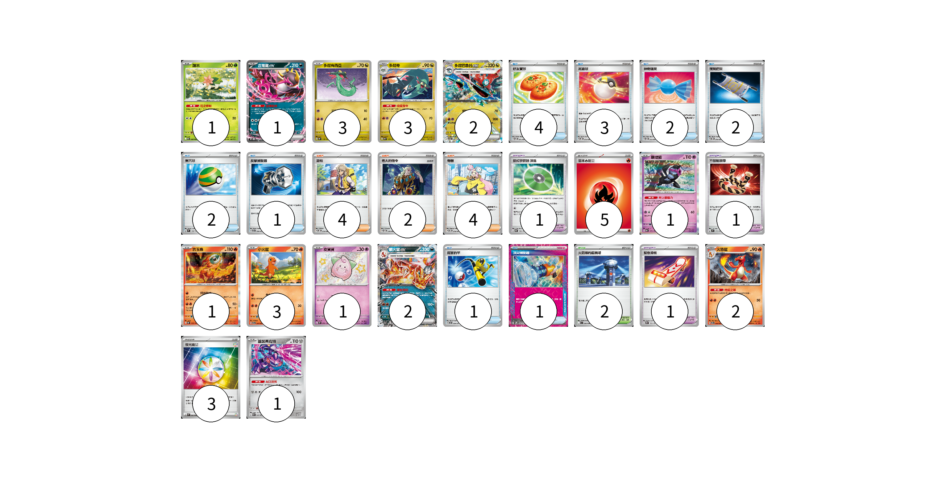 牌組構築方案 以此牌組為基礎新構築牌組 顯示卡面 顯示列表 寶可夢卡(21) 1 1 3 3 2 1 1 3 1 2 2 1 寶可夢道具(3) 1 1 1 物品卡(16) 4 3 2 2 2 1 1 1 支援者卡(10) 4 2 4 競技場卡(2) 2 能量卡(8) 5 3 寶可夢卡(21) 卡牌名稱 張數 卡牌名稱 張數 謝米 SV9a 006/063 01 吉雉雞ex SVOD 004/020 01 多龍梅西亞 SV8a 118/187 03 多龍奇 SV8a 119/187 03 多龍巴魯托ex SV6 081/101 02 願增猿 SV8a 075/187 01 古玉魚 SV8a 025/187 01 小火龍 SVTL 001/021 03 皮寶寶 SV4a 255/190 01 噴火龍ex SVTL 006/021 02 火恐龍 SVTL 002/021 02 蓋諾賽克特 SV6a 040/064 01 寶可夢道具(3) 卡牌名稱 張數 卡牌名稱 張數 招式學習器 演進 SV8a 160/187 01 不服輸頭帶 SV1S 073/078 01 緊急滑板 SV8a 153/187 01 物品卡(16) 卡牌名稱 張數 卡牌名稱 張數 好友寶芬 SVOD 011/020 04 高級球 SVOD 012/020 03 神奇糖果 SVOD 013/020 02 夜間擔架 SVOM 016/021 02 巢穴球 SVM 133/175 02 反擊捕捉器 SVTS 009/022 01 厲害釣竿 SVTL 009/021 01 頂尖捕捉器 SV5M 062/071 01 支援者卡(10) 卡牌名稱 張數 卡牌名稱 張數 派帕 SVOD 018/020 04 老大的指令 SVOD 019/020 02 奇樹 SVOM 018/021 04 競技場卡(2) 卡牌名稱 張數 卡牌名稱 張數 火箭隊的監視塔 SV10 096/098 02 能量卡(8) 卡牌名稱 張數 卡牌名稱 張數 基本【火】能量 SVTL FIR 05 夜光能量 SVK 042/042 03 以此牌組為基礎新構築牌組 牌組編碼 wauRox-FUSqMt-wWiOag copy 列印牌組單 牌組編碼已複製 分享至SNS