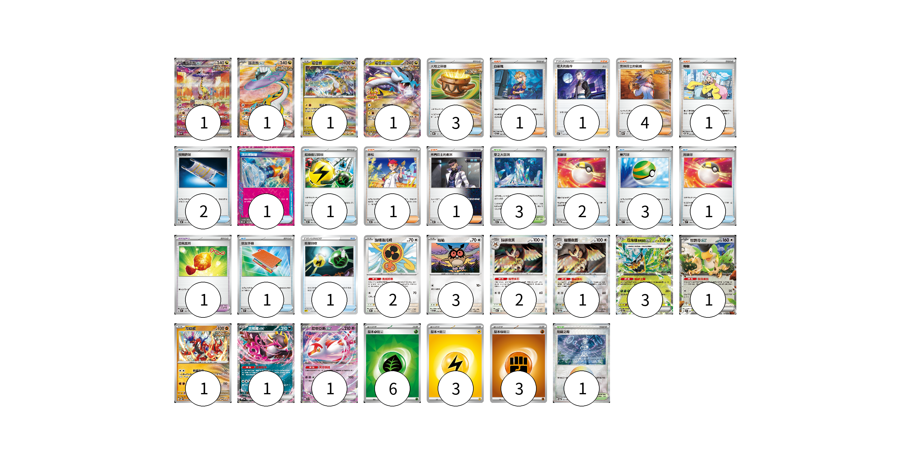 牌組構築方案 以此牌組為基礎新構築牌組 顯示卡面 顯示列表 寶可夢卡(19) 1 1 1 1 2 3 2 1 3 1 1 1 1 寶可夢道具(1) 1 物品卡(15) 3 2 1 1 2 3 1 1 1 支援者卡(9) 1 1 4 1 1 1 競技場卡(4) 3 1 能量卡(12) 6 3 3 寶可夢卡(19) 卡牌名稱 張數 卡牌名稱 張數 猛雷鼓ex SV5K 095/071 01 猛雷鼓ex SV5K 089/071 01 猛雷鼓 SV7 075/102 01 猛雷鼓ex SV-P 081/SV-P 01 旋轉洛托姆 SV8a 131/187 02 咕咕 SV7 076/102 03 貓頭夜鷹 SV8a 128/187 02 貓頭夜鷹 SV8a 128/187 01 厄鬼椪 碧草面具ex SV6 016/101 03 怒鸚哥ex SVK 006/042 01 故勒頓 SV8 069/106 01 吉雉雞ex SV6a 038/064 01 拉帝亞斯ex SV7a 019/064 01 寶可夢道具(1) 卡牌名稱 張數 卡牌名稱 張數 勇氣護符 SVM 142/175 01 物品卡(15) 卡牌名稱 張數 卡牌名稱 張數 大地之容器 SV8a 143/187 03 夜間擔架 SV8a 151/187 02 頂尖捕捉器 SV8a 148/187 01 超級能量回收 SV8a 141/187 01 高級球 SVOD 012/020 02 巢穴球 SVM 133/175 03 高級球 SVM 134/175 01 朋友手冊 SVK 014/042 01 能量回收 SDP 013/022 01 支援者卡(9) 卡牌名稱 張數 卡牌名稱 張數 白蕾雅 SV7 100/102 01 老大的指令(赤日) SVB 024/028 01 奧琳博士的氣魄 SV8a 167/187 04 奇樹 SVOD 016/020 01 赤松 SV8a 163/187 01 弗圖博士的劇本 SV8a 175/187 01 競技場卡(4) 卡牌名稱 張數 卡牌名稱 張數 零之大空洞 SV8a 182/187 03 阻礙之塔 SV8a 181/187 01 能量卡(12) 卡牌名稱 張數 卡牌名稱 張數 基本【草】能量 SVK GRA 06 基本【雷】能量 SVTR LIG 03 基本【鬥】能量 SVTG FIG 03 以此牌組為基礎新構築牌組 牌組編碼 wcMMPB-gCidGU-LNXHwY copy 列印牌組單 牌組編碼已複製 分享至SNS