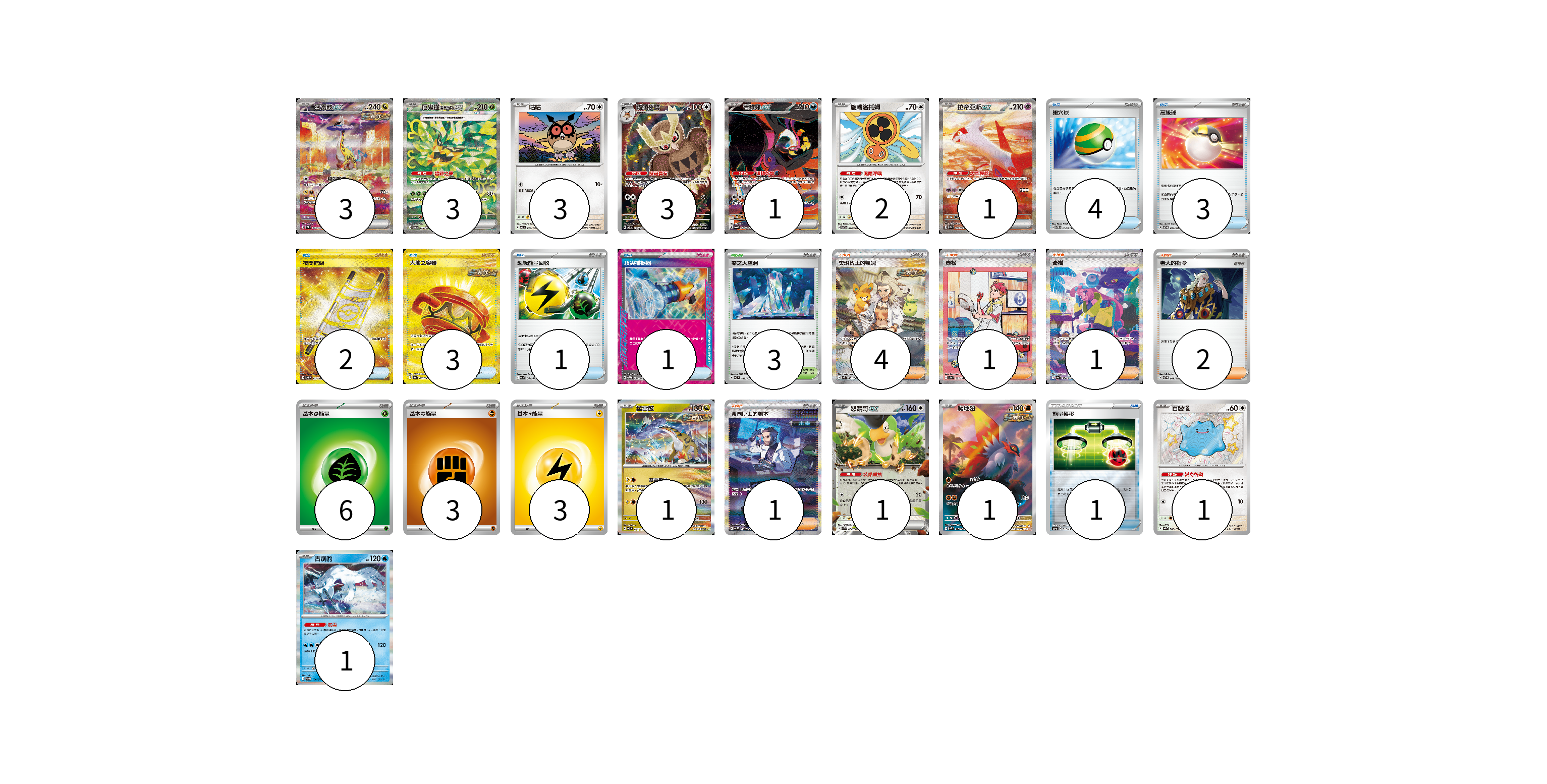 牌組構築方案 以此牌組為基礎新構築牌組 顯示卡面 顯示列表 寶可夢卡(21) 3 3 3 3 1 2 1 1 1 1 1 1 物品卡(15) 4 3 2 3 1 1 1 支援者卡(9) 4 1 1 2 1 競技場卡(3) 3 能量卡(12) 6 3 3 寶可夢卡(21) 卡牌名稱 張數 卡牌名稱 張數 猛雷鼓ex SV5K 095/071 03 厄鬼椪 碧草面具ex SV6 125/101 03 咕咕 SV7 076/102 03 貓頭夜鷹 SV7 114/102 03 吉雉雞ex SV6a 089/064 01 旋轉洛托姆 SV7 080/102 02 拉帝亞斯ex SV7a 087/064 01 猛雷鼓 SV7 075/102 01 怒鸚哥ex SVK 006/042 01 爬地翅 SV4K 074/066 01 百變怪 SV4a 309/190 01 古劍豹 SV-P 190/SV-P 01 物品卡(15) 卡牌名稱 張數 卡牌名稱 張數 巢穴球 SVTG 012/019 04 高級球 SVTG 013/019 03 夜間擔架 SV8 137/106 02 大地之容器 SV6a 093/064 03 超級能量回收 SV1a 064/073 01 頂尖捕捉器 SV5M 062/071 01 能量轉移 SO 017/030 01 支援者卡(9) 卡牌名稱 張數 卡牌名稱 張數 奧琳博士的氣魄 SV4K 091/066 04 赤松 SV8a 227/187 01 奇樹 SV4a 350/190 01 老大的指令 SVTG 019/019 02 弗圖博士的劇本 SV4M 091/066 01 競技場卡(3) 卡牌名稱 張數 卡牌名稱 張數 零之大空洞 SV7 102/102 03 能量卡(12) 卡牌名稱 張數 卡牌名稱 張數 基本【草】能量 SVF GRA 06 基本【鬥】能量 SVF FIG 03 基本【雷】能量 SVF LIG 03 以此牌組為基礎新構築牌組 牌組編碼 wfosnq-SayUeQ-olyhDQ copy 列印牌組單 牌組編碼已複製 分享至SNS