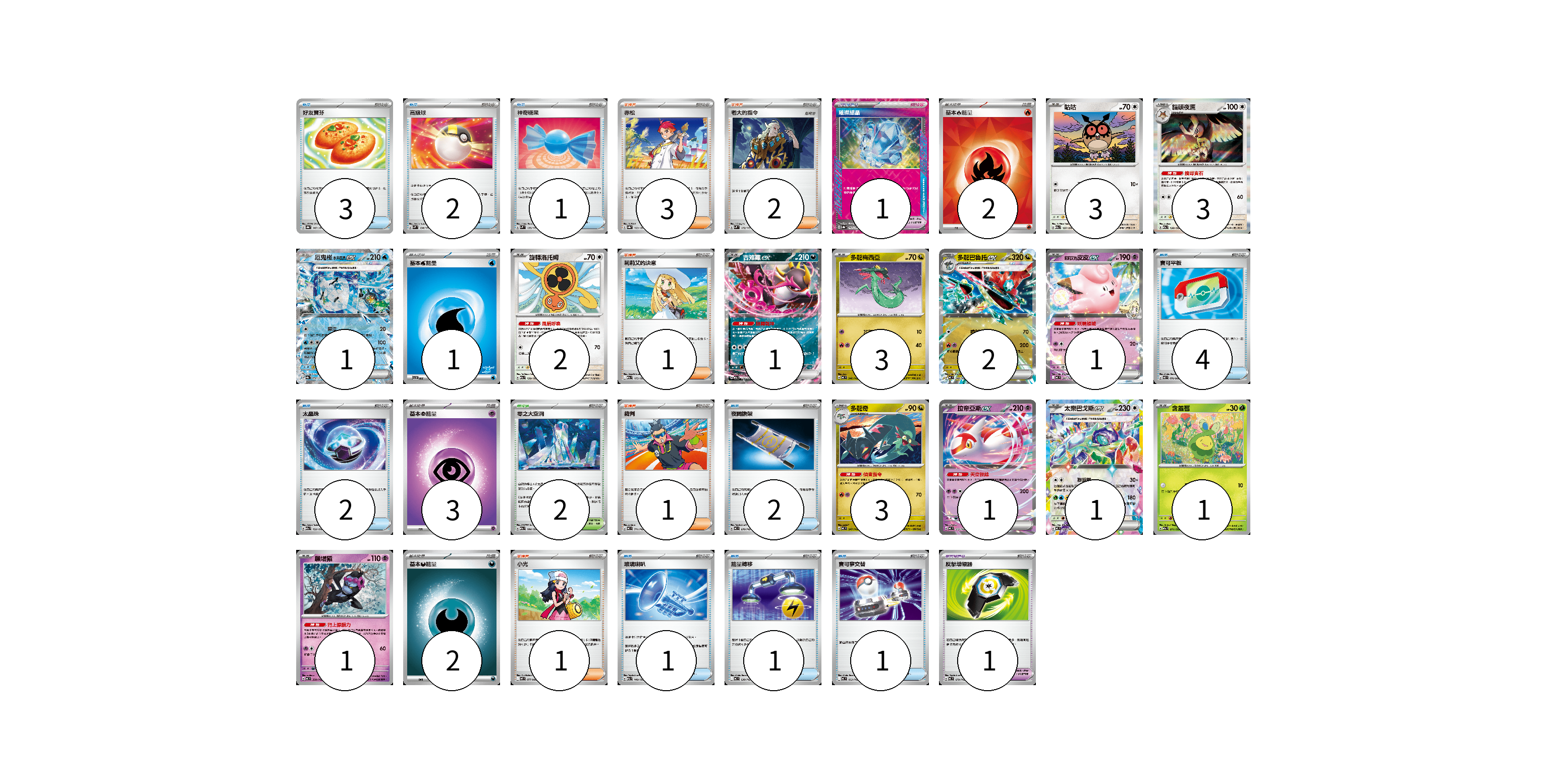 牌組構築方案 以此牌組為基礎新構築牌組 顯示卡面 顯示列表 寶可夢卡(23) 3 3 1 2 1 3 2 1 3 1 1 1 1 寶可夢道具(2) 1 1 物品卡(17) 3 2 1 4 2 2 1 1 1 支援者卡(8) 3 2 1 1 1 競技場卡(2) 2 能量卡(8) 2 1 3 2 寶可夢卡(23) 卡牌名稱 張數 卡牌名稱 張數 咕咕 M2a 137/193 03 貓頭夜鷹 M2a 138/193 03 厄鬼椪 水井面具ex SV8a 050/187 01 旋轉洛托姆 M2a 139/193 02 吉雉雞ex M2a 114/193 01 多龍梅西亞 MC 546/742 03 多龍巴魯托ex MC 548/742 02 莉莉艾的皮皮ex MC 287/742 01 多龍奇 MC 547/742 03 拉帝亞斯ex MC 312/742 01 太樂巴戈斯ex MC 630/742 01 含羞苞 M2a 011/193 01 願增猿 MC 358/742 01 寶可夢道具(2) 卡牌名稱 張數 卡牌名稱 張數 璀璨結晶 SV8a 152/187 01 反擊增幅器 MC 679/742 01 物品卡(17) 卡牌名稱 張數 卡牌名稱 張數 好友寶芬 SV8a 147/187 03 高級球 SVM 134/175 02 神奇糖果 SVM 135/175 01 寶可平板 M3 070/080 04 太晶珠 M2a 152/193 02 夜間擔架 MC 670/742 02 玻璃喇叭 M2a 149/193 01 能量轉移 MC 638/742 01 寶可夢交替 MC 663/742 01 支援者卡(8) 卡牌名稱 張數 卡牌名稱 張數 赤松 SV8a 163/187 03 老大的指令 SVM 172/175 02 莉莉艾的決意 M2a 175/193 01 裁判 MC 711/742 01 小光 M2 077/080 01 競技場卡(2) 卡牌名稱 張數 卡牌名稱 張數 零之大空洞 M2a 184/193 02 能量卡(8) 卡牌名稱 張數 卡牌名稱 張數 基本【火】能量 SVK FIR 02 基本【水】能量 SVI WAT 01 基本【超】能量 MC PSY 03 基本【惡】能量 MC DAR 02 以此牌組為基礎新構築牌組 牌組編碼 wfqoYQ-XGQPPx-zgtZqN copy 列印牌組單 牌組編碼已複製 分享至SNS