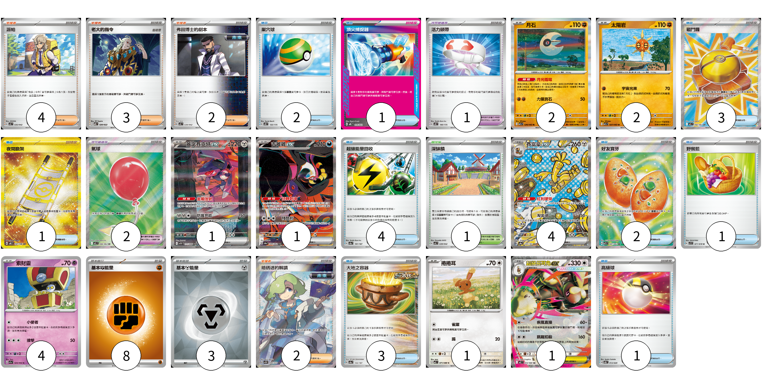 牌組構築方案 以此牌組為基礎新構築牌組 顯示卡面 顯示列表 寶可夢卡(16) 2 2 1 1 4 4 1 1 寶可夢道具(3) 1 2 物品卡(18) 2 1 3 1 4 2 1 3 1 支援者卡(11) 4 3 2 2 競技場卡(1) 1 能量卡(11) 8 3 寶可夢卡(16) 卡牌名稱 張數 卡牌名稱 張數 月石 M1L 026/063 02 太陽岩 M1L 027/063 02 蓋諾賽克特ex SV11B 172/086 01 吉雉雞ex SV6a 089/064 01 賽富豪ex SV8a 220/187 04 索財靈 SV7a 024/064 04 捲捲耳 M2 071/080 01 超級長耳兔ex M2 072/080 01 寶可夢道具(3) 卡牌名稱 張數 卡牌名稱 張數 活力頭帶 SVM 140/175 01 氣球 M1L 084/063 02 物品卡(18) 卡牌名稱 張數 卡牌名稱 張數 巢穴球 SVM 133/175 02 頂尖捕捉器 MBG 014/022 01 戰鬥鑼 M1L 082/063 03 夜間擔架 SV8 137/106 01 超級能量回收 SV8a 141/187 04 好友寶芬 M1S 081/063 02 野餐籃 SV1V 071/078 01 大地之容器 SV8a 143/187 03 高級球 SVEM 013/020 01 支援者卡(11) 卡牌名稱 張數 卡牌名稱 張數 派帕 SVK 035/042 04 老大的指令 MBD 020/022 03 弗圖博士的劇本 SVK 034/042 02 暗碼迷的解讀 SV5M 090/071 02 競技場卡(1) 卡牌名稱 張數 卡牌名稱 張數 深缽鎮 SVK 039/042 01 能量卡(11) 卡牌名稱 張數 卡牌名稱 張數 基本【鬥】能量 M-P FIG 08 基本【鋼】能量 SVOD MET 03 以此牌組為基礎新構築牌組 牌組編碼 whWXNF-YslwYR-jYminU copy 列印牌組單 牌組編碼已複製 分享至SNS