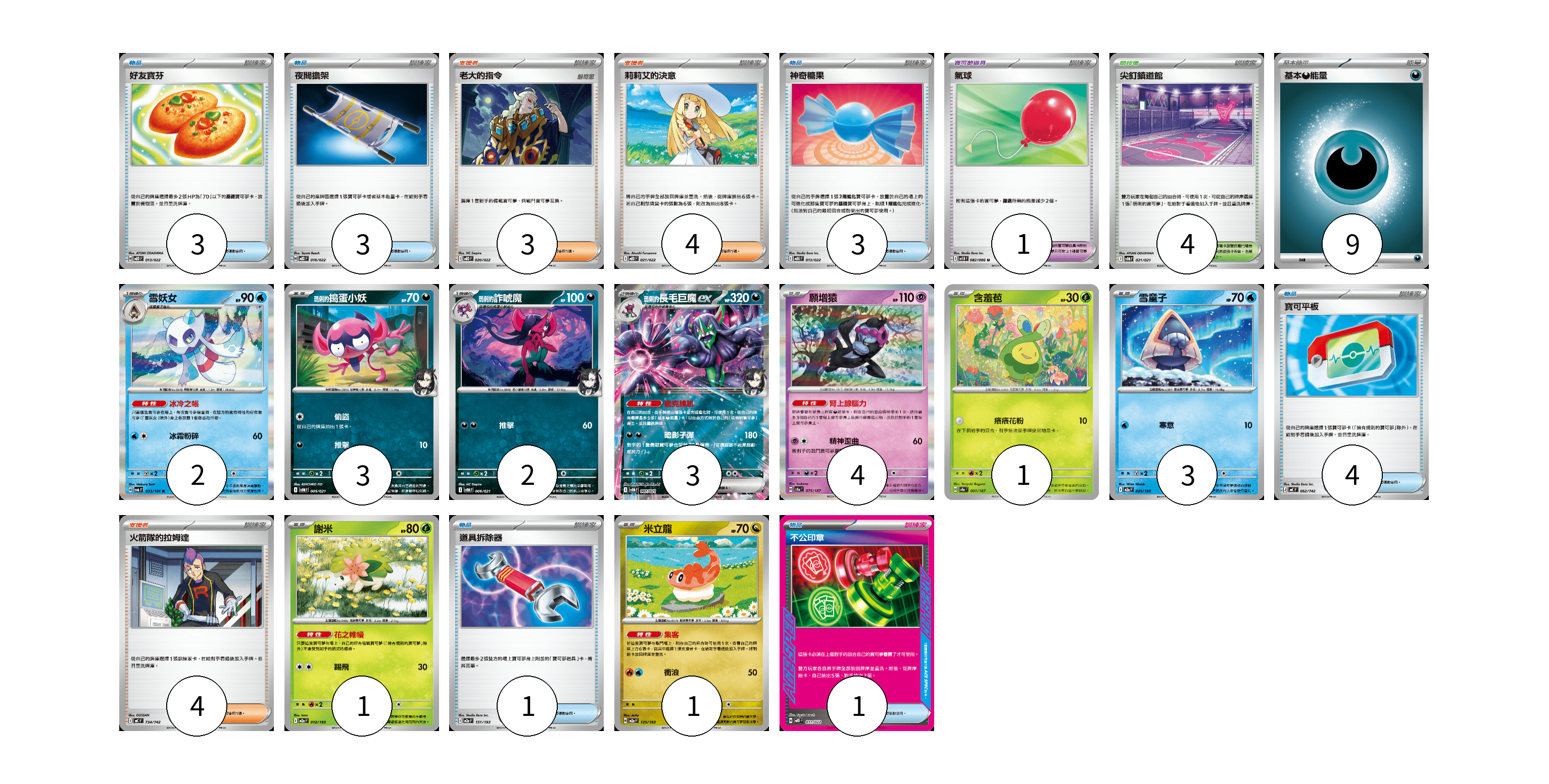 牌組構築方案 以此牌組為基礎新構築牌組 顯示卡面 顯示列表 寶可夢卡(20) 2 3 2 3 4 1 3 1 1 寶可夢道具(1) 1 物品卡(15) 3 3 3 4 1 1 支援者卡(11) 3 4 4 競技場卡(4) 4 能量卡(9) 9 寶可夢卡(20) 卡牌名稱 張數 卡牌名稱 張數 雪妖女 SV6 033/101 02 <瑪俐的>搗蛋小妖 SVOM 005/021 03 <瑪俐的>詐唬魔 SVOM 006/021 02 <瑪俐的>長毛巨魔ex SVOM 007/021 03 願增猿 SV8a 075/187 04 含羞苞 SV8a 001/187 01 雪童子 M2a 035/193 03 謝米 M2a 012/193 01 米立龍 M2a 135/193 01 寶可夢道具(1) 卡牌名稱 張數 卡牌名稱 張數 氣球 SV11B 082/086 01 物品卡(15) 卡牌名稱 張數 卡牌名稱 張數 好友寶芬 MBD 013/022 03 夜間擔架 MBD 016/022 03 神奇糖果 MBG 013/022 03 寶可平板 MC 662/742 04 道具拆除器 M2a 151/193 01 不公印章 MBD 011/022 01 支援者卡(11) 卡牌名稱 張數 卡牌名稱 張數 老大的指令 MBD 020/022 03 莉莉艾的決意 MBD 021/022 04 火箭隊的拉姆達 MC 734/742 04 競技場卡(4) 卡牌名稱 張數 卡牌名稱 張數 尖釘鎮道館 SVOM 021/021 04 能量卡(9) 卡牌名稱 張數 卡牌名稱 張數 基本【惡】能量 MBG DAR 09 以此牌組為基礎新構築牌組 牌組編碼 whiOwU-KGKQgz-tRpmQM copy 列印牌組單 牌組編碼已複製 分享至SNS