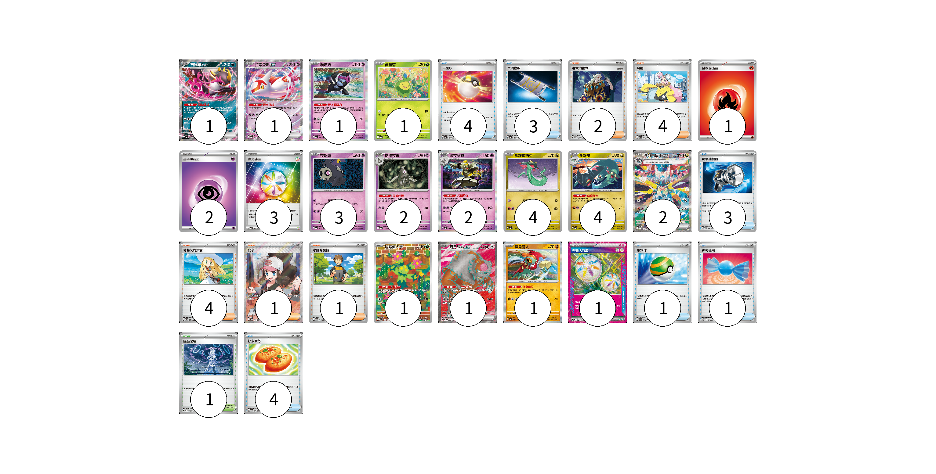 牌組構築方案 以此牌組為基礎新構築牌組 顯示卡面 顯示列表 寶可夢卡(24) 1 1 1 1 3 2 2 4 4 2 1 1 1 物品卡(16) 4 3 3 1 1 4 支援者卡(12) 2 4 4 1 1 競技場卡(1) 1 能量卡(7) 1 2 3 1 寶可夢卡(24) 卡牌名稱 張數 卡牌名稱 張數 吉雉雞ex SV6a 038/064 01 拉帝亞斯ex SV7a 019/064 01 願增猿 SV8a 075/187 01 含羞苞 SV8a 001/187 01 夜巡靈 SV8a 064/187 03 彷徨夜靈 SV8a 065/187 02 黑夜魔靈 SV8a 066/187 02 多龍梅西亞 SV8a 118/187 04 多龍奇 SV8a 119/187 04 多龍巴魯托ex SV8a 221/187 02 沙鈴仙人掌 SV9 101/100 01 月月熊 赫月 ex SV5a 084/066 01 摔角鷹人 SV8a 084/187 01 物品卡(16) 卡牌名稱 張數 卡牌名稱 張數 高級球 SVM 134/175 04 夜間擔架 SV8a 151/187 03 反擊捕捉器 SVTS 009/022 03 巢穴球 SVM 133/175 01 神奇糖果 SVTG 014/019 01 好友寶芬 MBG 011/022 04 支援者卡(12) 卡牌名稱 張數 卡牌名稱 張數 老大的指令 SVTH 017/018 02 奇樹 SVM 160/175 04 莉莉艾的決意 M1L 062/063 04 鬥子 SV11W 166/086 01 小剛的發掘 SV9 096/100 01 競技場卡(1) 卡牌名稱 張數 卡牌名稱 張數 阻礙之塔 SV6 100/101 01 能量卡(7) 卡牌名稱 張數 卡牌名稱 張數 基本【火】能量 SVTL FIR 01 基本【超】能量 SVTS PSY 02 夜光能量 SVK 042/042 03 新衝天能量 SV5K 071/071 01 以此牌組為基礎新構築牌組 牌組編碼 wjTvVS-fgjCDa-tIfphK copy 列印牌組單 牌組編碼已複製 分享至SNS