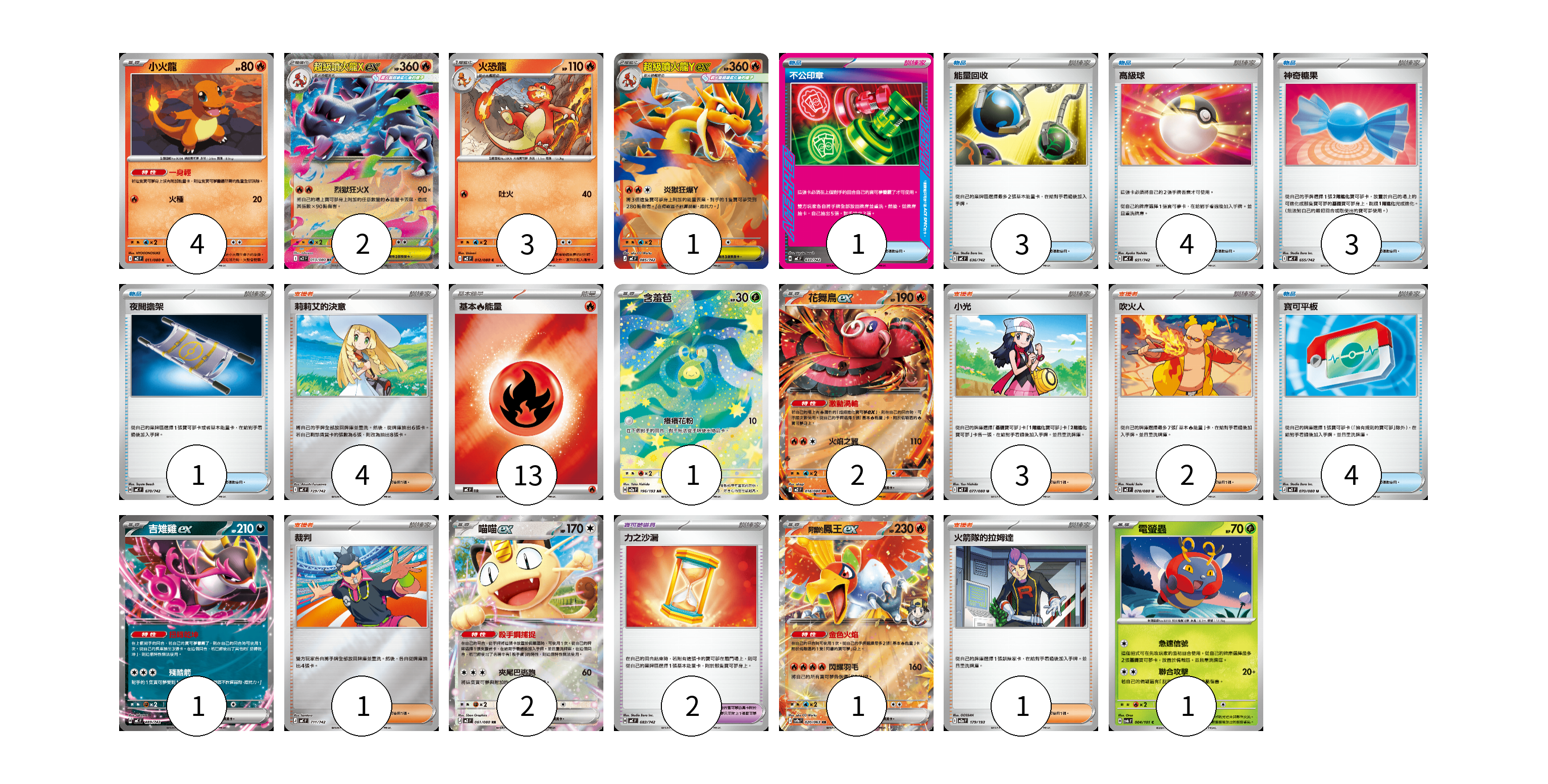 牌組構築方案 以此牌組為基礎新構築牌組 顯示卡面 顯示列表 寶可夢卡(18) 4 2 3 1 1 2 1 2 1 1 寶可夢道具(2) 2 物品卡(16) 1 3 4 3 1 4 支援者卡(11) 4 3 2 1 1 能量卡(13) 13 寶可夢卡(18) 卡牌名稱 張數 卡牌名稱 張數 小火龍 M2 011/080 04 超級噴火龍Xex M2 013/080 02 火恐龍 M2 012/080 03 超級噴火龍Yex MC 085/742 01 含羞苞 M2a 196/193 01 花舞鳥ex M2 018/080 02 吉雉雞ex MC 489/742 01 喵喵ex M3 061/080 02 <阿響的>鳳王ex SV9a 020/063 01 電螢蟲 SV6 004/101 01 寶可夢道具(2) 卡牌名稱 張數 卡牌名稱 張數 力之沙漏 MC 683/742 02 物品卡(16) 卡牌名稱 張數 卡牌名稱 張數 不公印章 MC 633/742 01 能量回收 MC 636/742 03 高級球 MC 651/742 04 神奇糖果 MC 655/742 03 夜間擔架 MC 670/742 01 寶可平板 M3 070/080 04 支援者卡(11) 卡牌名稱 張數 卡牌名稱 張數 莉莉艾的決意 MC 729/742 04 小光 M2 077/080 03 吹火人 M2 078/080 02 裁判 MC 711/742 01 火箭隊的拉姆達 M2a 179/193 01 能量卡(13) 卡牌名稱 張數 卡牌名稱 張數 基本【火】能量 MC FIR 13 以此牌組為基礎新構築牌組 牌組編碼 wjjEGW-beuvOf-VmvMUO copy 列印牌組單 牌組編碼已複製 分享至SNS
