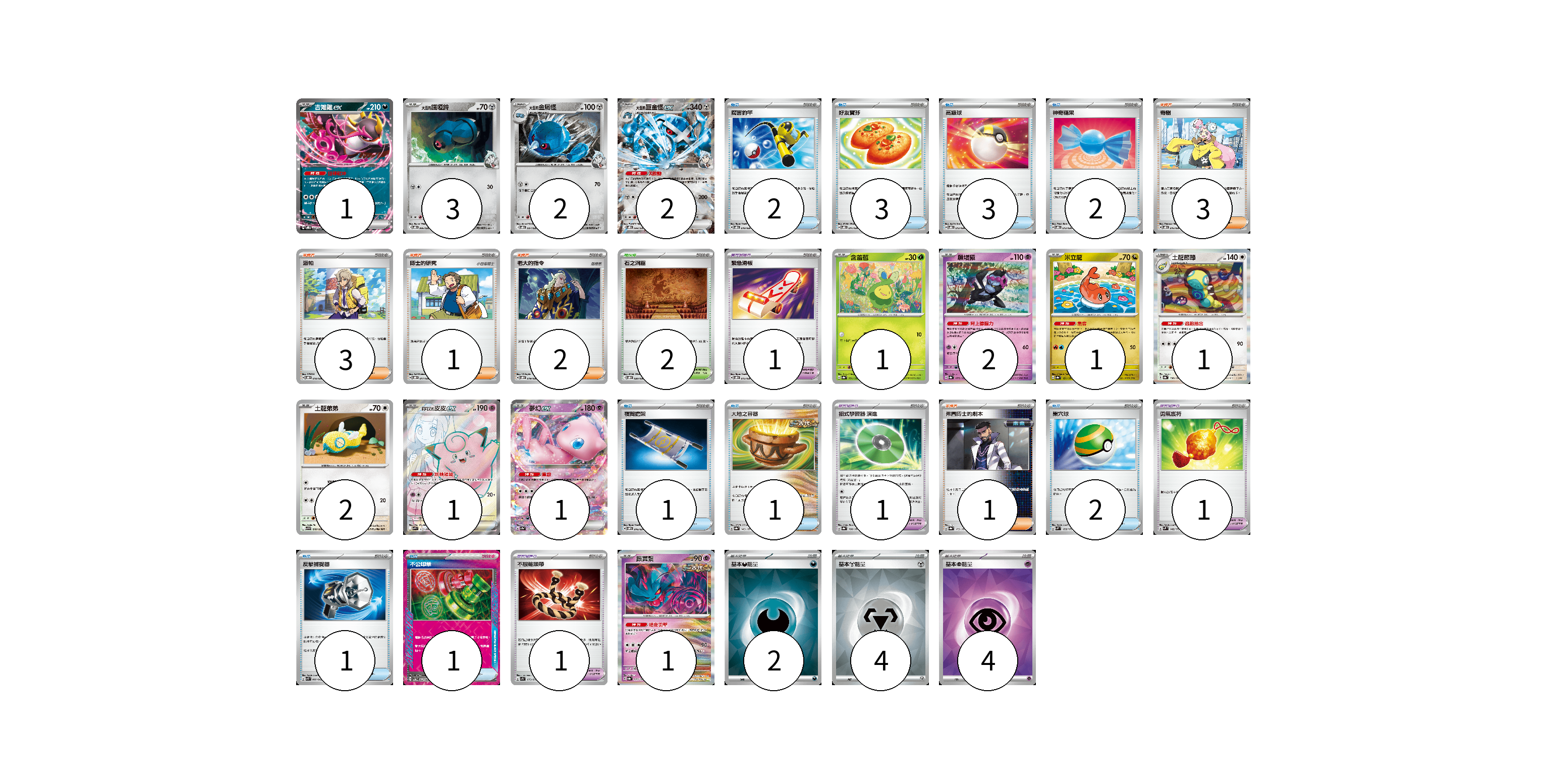 牌組構築方案 以此牌組為基礎新構築牌組 顯示卡面 顯示列表 寶可夢卡(18) 1 3 2 2 1 2 1 1 2 1 1 1 寶可夢道具(4) 1 1 1 1 物品卡(16) 2 3 3 2 1 1 2 1 1 支援者卡(10) 3 3 1 2 1 競技場卡(2) 2 能量卡(10) 2 4 4 寶可夢卡(18) 卡牌名稱 張數 卡牌名稱 張數 吉雉雞ex SVOD 004/020 01 <大吾的>鐵啞鈴 SVOD 006/020 03 <大吾的>金屬怪 SVOD 007/020 02 <大吾的>巨金怪ex SVOD 008/020 02 含羞苞 SV8a 001/187 01 願增猿 SV8a 075/187 02 米立龍 SV8a 121/187 01 土龍節節 SV8a 130/187 01 土龍弟弟 SV9 078/100 02 莉莉艾的皮皮ex SV9 115/100 01 夢幻ex SV2a 151/165 01 振翼髮 SV8a 072/187 01 寶可夢道具(4) 卡牌名稱 張數 卡牌名稱 張數 緊急滑板 SVOD 015/020 01 招式學習器 演進 SV8a 160/187 01 勇氣護符 SVM 142/175 01 不服輸頭帶 SV1S 073/078 01 物品卡(16) 卡牌名稱 張數 卡牌名稱 張數 厲害釣竿 SVOD 010/020 02 好友寶芬 SVOD 011/020 03 高級球 SVOD 012/020 03 神奇糖果 SVOD 013/020 02 夜間擔架 SVOM 016/021 01 大地之容器 SV8a 143/187 01 巢穴球 SVM 133/175 02 反擊捕捉器 SVK 009/042 01 不公印章 SV5a 053/066 01 支援者卡(10) 卡牌名稱 張數 卡牌名稱 張數 奇樹 SVOD 016/020 03 派帕 SVOD 018/020 03 博士的研究 SVOD 017/020 01 老大的指令 SVOD 019/020 02 弗圖博士的劇本 SV8a 175/187 01 競技場卡(2) 卡牌名稱 張數 卡牌名稱 張數 石之洞窟 SVOD 020/020 02 能量卡(10) 卡牌名稱 張數 卡牌名稱 張數 基本【惡】能量 SVK DAR 02 基本【鋼】能量 SVOD MET 04 基本【超】能量 SVOD PSY 04 以此牌組為基礎新構築牌組 牌組編碼 wjxpOr-lpOdqb-jqoOSf copy 列印牌組單 牌組編碼已複製 分享至SNS