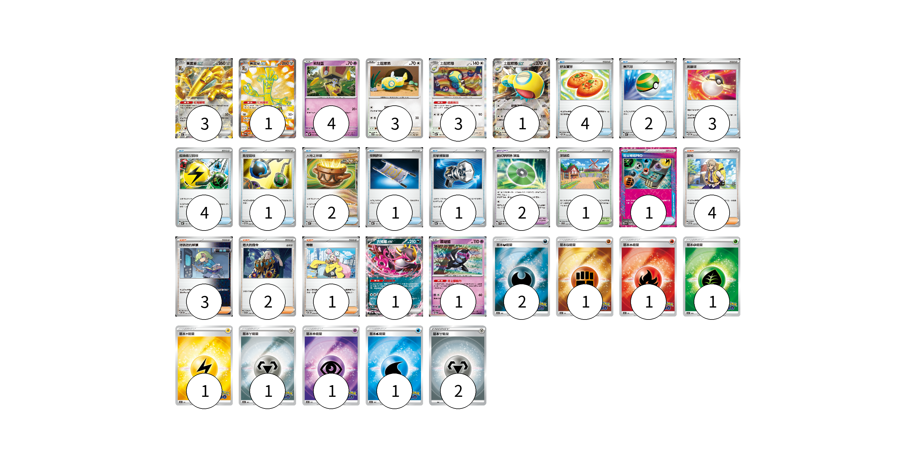 牌組構築方案 以此牌組為基礎新構築牌組 顯示卡面 顯示列表 寶可夢卡(17) 3 1 4 3 3 1 1 1 寶可夢道具(2) 2 物品卡(19) 4 2 3 4 1 2 1 1 1 支援者卡(10) 4 3 2 1 競技場卡(1) 1 能量卡(11) 2 1 1 1 1 1 1 1 2 寶可夢卡(17) 卡牌名稱 張數 卡牌名稱 張數 賽富豪ex SV3a 050/062 03 賽富豪ex SV3a 079/062 01 索財靈 SV3a 021/062 04 土龍弟弟 SV9 078/100 03 土龍節節 SV8a 130/187 03 土龍節節ex SV9 079/100 01 吉雉雞ex SV8a 104/187 01 願增猿 SV6 055/101 01 寶可夢道具(2) 卡牌名稱 張數 卡牌名稱 張數 招式學習器 演進 SV4M 063/066 02 物品卡(19) 卡牌名稱 張數 卡牌名稱 張數 好友寶芬 SVOM 012/021 04 巢穴球 SVK 016/042 02 高級球 SVOM 013/021 03 超級能量回收 SV8a 141/187 04 能量回收 SVTM 009/022 01 大地之容器 SVK 012/042 02 夜間擔架 SV8a 151/187 01 反擊捕捉器 SV8a 139/187 01 能量輸送PRO SV7a 052/064 01 支援者卡(10) 卡牌名稱 張數 卡牌名稱 張數 派帕 SVTM 019/022 04 暗碼迷的解讀 SV5M 067/071 03 老大的指令 SVTG 019/019 02 奇樹 SVOM 018/021 01 競技場卡(1) 卡牌名稱 張數 卡牌名稱 張數 深缽鎮 SVF 036/038 01 能量卡(11) 卡牌名稱 張數 卡牌名稱 張數 基本惡能量 S10b DAR 02 基本鬥能量 S10b FIG 01 基本火能量 S10b FIR 01 基本草能量 S10b GRA 01 基本雷能量 S10b LIG 01 基本鋼能量 S10b MET 01 基本超能量 S10b PSY 01 基本水能量 S10b WAT 01 基本【鋼】能量 SI MET 02 以此牌組為基礎新構築牌組 牌組編碼 wkyatJ-mfuihm-mcbShR copy 列印牌組單 牌組編碼已複製 分享至SNS