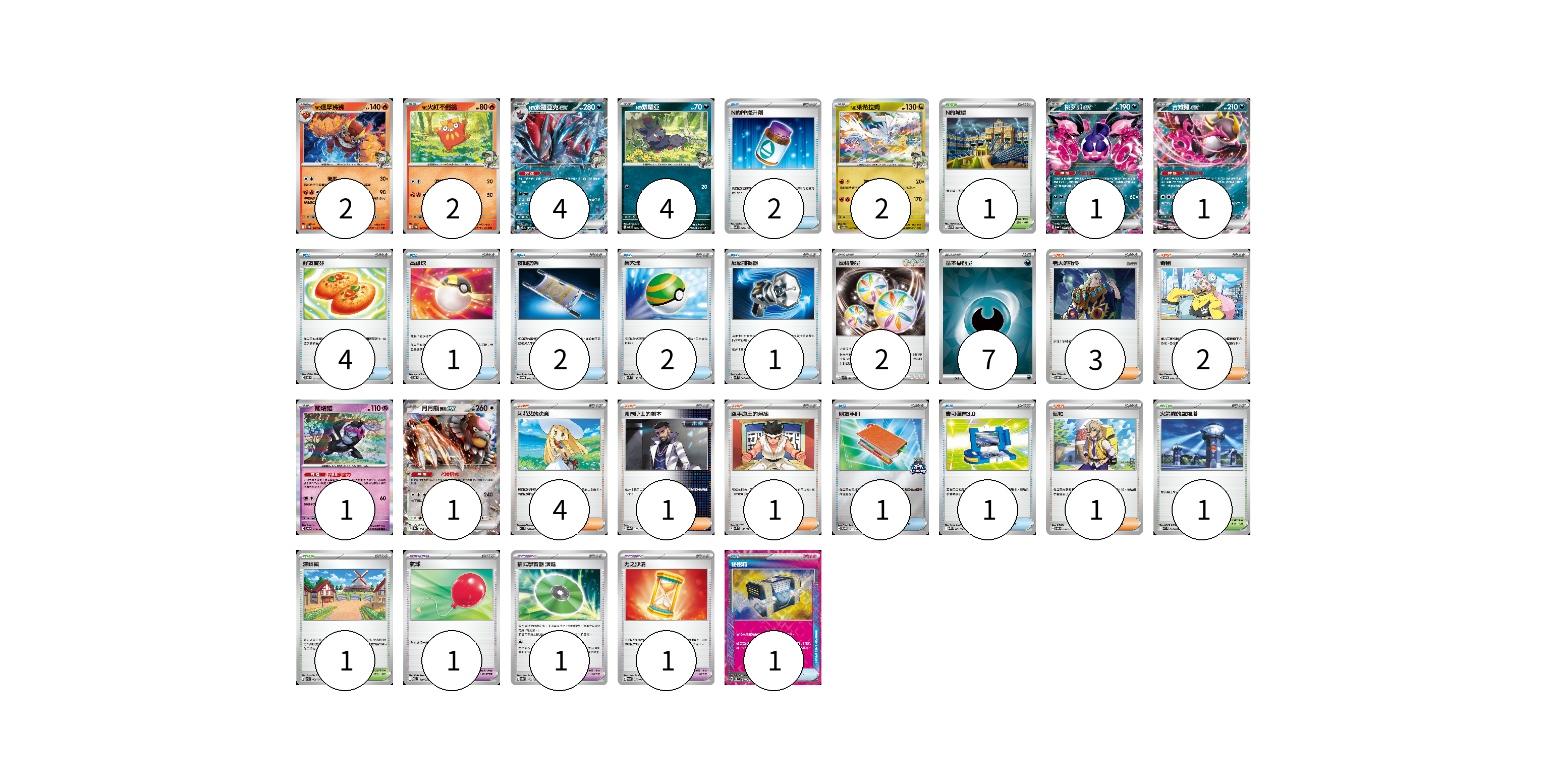 牌組構築方案 以此牌組為基礎新構築牌組 顯示卡面 顯示列表 寶可夢卡(18) 2 2 4 4 2 1 1 1 1 寶可夢道具(2) 1 1 物品卡(16) 2 4 1 2 2 1 1 1 1 1 支援者卡(12) 3 2 4 1 1 1 競技場卡(3) 1 1 1 能量卡(9) 2 7 寶可夢卡(18) 卡牌名稱 張數 卡牌名稱 張數 N的達摩狒狒 SV9 016/100 02 N的火紅不倒翁 SV9 015/100 02 N的索羅亞克ex SV9 061/100 04 N的索羅亞 SV9 060/100 04 N的萊希拉姆 SV9 074/100 02 桃歹郎ex SV6a 039/064 01 吉雉雞ex SV6a 038/064 01 願增猿 SV6 055/101 01 月月熊 赫月ex SV8a 134/187 01 寶可夢道具(2) 卡牌名稱 張數 卡牌名稱 張數 招式學習器 演進 SV8a 160/187 01 力之沙漏 SV6a 058/064 01 物品卡(16) 卡牌名稱 張數 卡牌名稱 張數 N的PP提升劑 SV9 089/100 02 好友寶芬 SVOD 011/020 04 高級球 SVOD 012/020 01 夜間擔架 SVOM 016/021 02 巢穴球 SVM 133/175 02 反擊捕捉器 SVK 009/042 01 朋友手冊 SV-P 182/SV-P 01 寶可裝置3.0 SV11B 081/086 01 氣球 MBD 018/022 01 秘密箱 SV6 092/101 01 支援者卡(12) 卡牌名稱 張數 卡牌名稱 張數 老大的指令 SVOD 019/020 03 奇樹 SVOM 018/021 02 莉莉艾的決意 M1L 062/063 04 弗圖博士的劇本 SV8a 175/187 01 空手道王的演練 SVM 143/175 01 派帕 SVOD 018/020 01 競技場卡(3) 卡牌名稱 張數 卡牌名稱 張數 N的城堡 SV9 097/100 01 火箭隊的監視塔 SV10 096/098 01 深缽鎮 SVK 039/042 01 能量卡(9) 卡牌名稱 張數 卡牌名稱 張數 反轉能量 SVK 041/042 02 基本【惡】能量 SVK DAR 07 以此牌組為基礎新構築牌組 牌組編碼 wlffrC-BcXeTp-cibWex copy 列印牌組單 牌組編碼已複製 分享至SNS