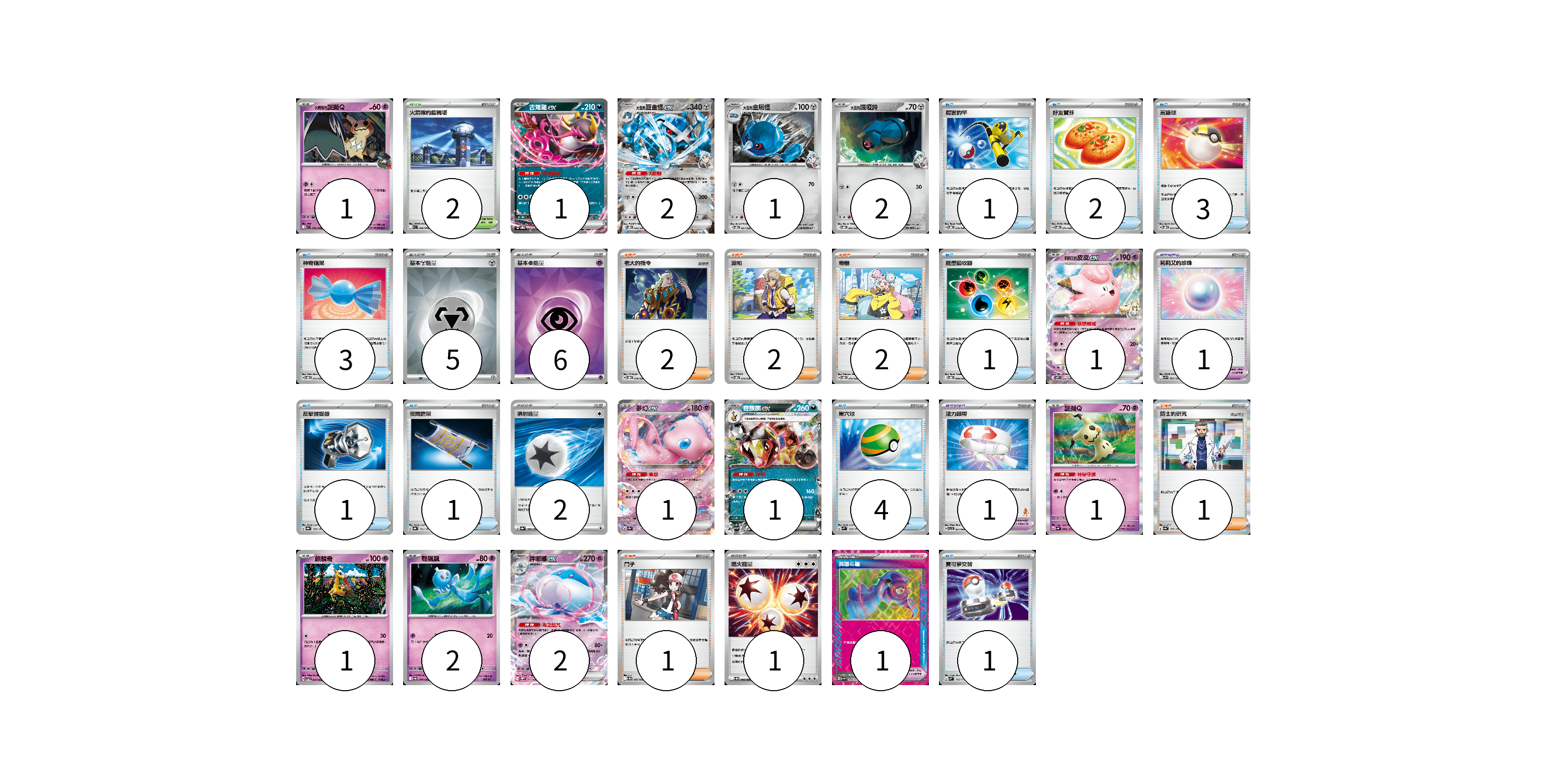牌組構築方案 以此牌組為基礎新構築牌組 顯示卡面 顯示列表 寶可夢卡(16) 1 1 2 1 2 1 1 1 1 1 2 2 寶可夢道具(3) 1 1 1 物品卡(17) 1 2 3 3 1 1 1 4 1 支援者卡(8) 2 2 2 1 1 競技場卡(2) 2 能量卡(14) 5 6 2 1 寶可夢卡(16) 卡牌名稱 張數 卡牌名稱 張數 <火箭隊的>謎擬Q SV10 042/098 01 吉雉雞ex SVOD 004/020 01 <大吾的>巨金怪ex SVOD 008/020 02 <大吾的>金屬怪 SVOD 007/020 01 <大吾的>鐵啞鈴 SVOD 006/020 02 莉莉艾的皮皮ex SV9 033/100 01 夢幻ex SV2a 151/165 01 奇麒麟ex SV5M 042/071 01 謎擬Q SV4a 088/190 01 麒麟奇 SV5a 034/066 01 輕飄飄 SV11W 041/086 02 胖嘟嘟ex SV11W 042/086 02 寶可夢道具(3) 卡牌名稱 張數 卡牌名稱 張數 莉莉艾的珍珠 SV9 093/100 01 活力頭帶 SVI 057/066 01 英雄斗篷 SV5M 064/071 01 物品卡(17) 卡牌名稱 張數 卡牌名稱 張數 厲害釣竿 SVOD 010/020 01 好友寶芬 SVOD 011/020 02 高級球 SVOD 012/020 03 神奇糖果 SVOD 013/020 03 能量回收器 SVOD 009/020 01 反擊捕捉器 SV8a 139/187 01 夜間擔架 SV8a 151/187 01 巢穴球 SVM 133/175 04 寶可夢交替 SVM 136/175 01 支援者卡(8) 卡牌名稱 張數 卡牌名稱 張數 老大的指令 SVOD 019/020 02 派帕 SVOD 018/020 02 奇樹 SVOD 016/020 02 博士的研究 SV4a 177/190 01 鬥子 SV11W 085/086 01 競技場卡(2) 卡牌名稱 張數 卡牌名稱 張數 火箭隊的監視塔 SV10 096/098 02 能量卡(14) 卡牌名稱 張數 卡牌名稱 張數 基本【鋼】能量 SVOD MET 05 基本【超】能量 SVOD PSY 06 噴射能量 SV8a 185/187 02 燃火能量 SV11W 086/086 01 以此牌組為基礎新構築牌組 牌組編碼 wtWWuX-kgDzaM-FjWNEI copy 列印牌組單 牌組編碼已複製 分享至SNS