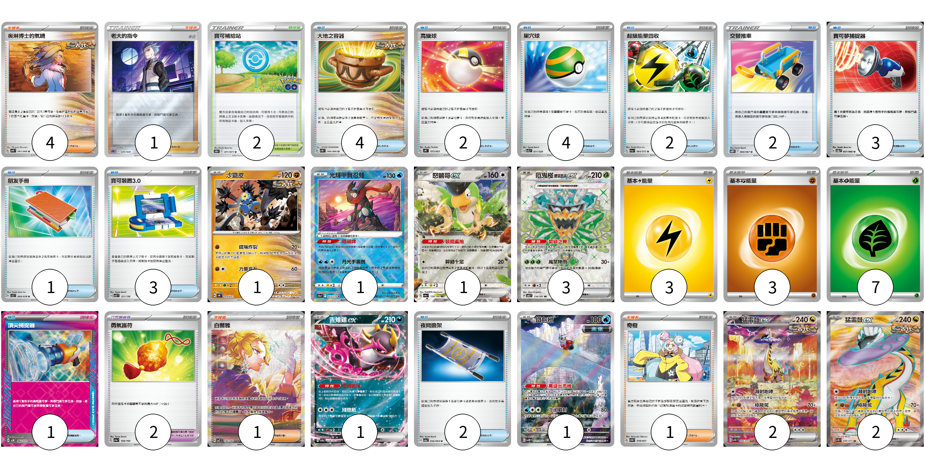 牌組構築方案 以此牌組為基礎新構築牌組 顯示卡面 顯示列表 寶可夢卡(12) 1 1 1 3 1 1 2 2 寶可夢道具(2) 2 物品卡(24) 4 2 4 2 2 3 1 3 1 2 支援者卡(7) 4 1 1 1 競技場卡(2) 2 能量卡(13) 3 3 7 寶可夢卡(12) 卡牌名稱 張數 卡牌名稱 張數 沙鐵皮 SVHK 009/022 01 光輝甲賀忍蛙 S12a 033/172 01 怒鸚哥ex SV4a 154/190 01 厄鬼椪 碧草面具ex SV6 114/101 03 吉雉雞ex SV6a 038/064 01 鐵包袱 SV4M 071/066 01 猛雷鼓ex SV5K 095/071 02 猛雷鼓ex SV5K 089/071 02 寶可夢道具(2) 卡牌名稱 張數 卡牌名稱 張數 勇氣護符 SV4a 169/190 02 物品卡(24) 卡牌名稱 張數 卡牌名稱 張數 大地之容器 SV4K 060/066 04 高級球 SVHK 013/022 02 巢穴球 SVEL 011/020 04 超級能量回收 SV1a 064/073 02 交替推車 S10D 060/067 02 寶可夢捕捉器 SV5a 057/066 03 朋友手冊 SV1S 069/078 01 寶可裝置3.0 SVD 121/139 03 頂尖捕捉器 SV5M 062/071 01 夜間擔架 SV6a 056/064 02 支援者卡(7) 卡牌名稱 張數 卡牌名稱 張數 奧琳博士的氣魄 SV4K 064/066 04 老大的指令(赤日) SPD 020/020 01 白蕾雅 SV7 132/102 01 奇樹 SVHM 018/022 01 競技場卡(2) 卡牌名稱 張數 卡牌名稱 張數 寶可補給站 S10b 071/071 02 能量卡(13) 卡牌名稱 張數 卡牌名稱 張數 基本【雷】能量 SVHM LIG 03 基本【鬥】能量 SVF FIG 03 基本【草】能量 SVF GRA 07 以此牌組為基礎新構築牌組 牌組編碼 wuczHL-goRdxL-elAEJp copy 列印牌組單 牌組編碼已複製 分享至SNS