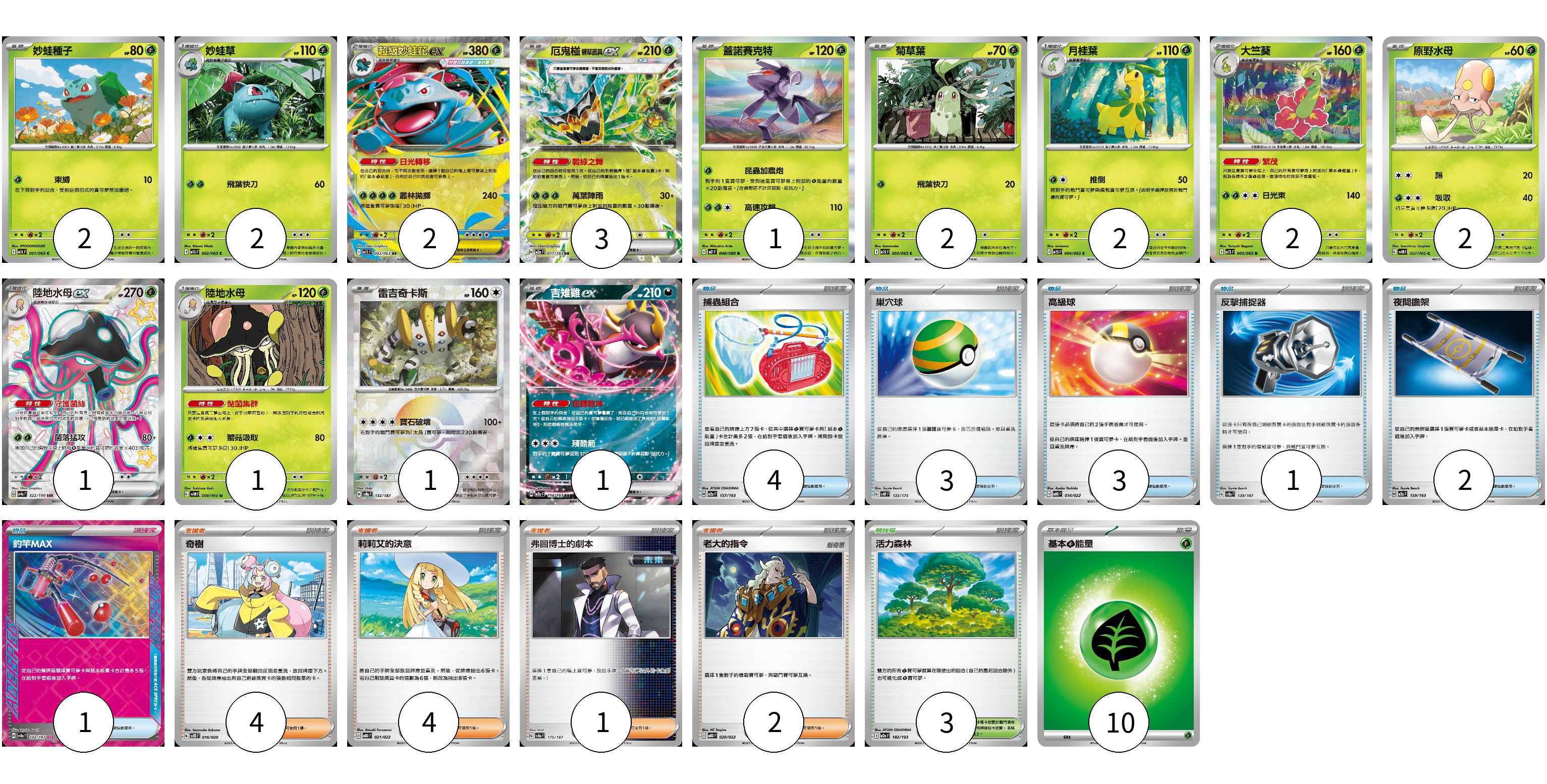 牌組構築方案 以此牌組為基礎新構築牌組 顯示卡面 顯示列表 寶可夢卡(22) 2 2 2 3 1 2 2 2 2 1 1 1 1 物品卡(14) 4 3 3 1 2 1 支援者卡(11) 4 4 1 2 競技場卡(3) 3 能量卡(10) 10 寶可夢卡(22) 卡牌名稱 張數 卡牌名稱 張數 妙蛙種子 M1L 001/063 02 妙蛙草 M1L 002/063 02 超級妙蛙花ex M1L 003/063 02 厄鬼椪 碧草面具ex M2a 017/193 03 蓋諾賽克特 M2 008/080 01 菊草葉 M1S 003/063 02 月桂葉 M1S 004/063 02 大竺葵 M1S 005/063 02 原野水母 SV4M 007/066 02 陸地水母ex SV4a 322/190 01 陸地水母 SV4M 008/066 01 雷吉奇卡斯 SV8a 132/187 01 吉雉雞ex M2a 114/193 01 物品卡(14) 卡牌名稱 張數 卡牌名稱 張數 捕蟲組合 M2a 157/193 04 巢穴球 SVM 133/175 03 高級球 MBD 014/022 03 反擊捕捉器 SV8a 139/187 01 夜間擔架 M2a 159/193 02 釣竿MAX SV8a 142/187 01 支援者卡(11) 卡牌名稱 張數 卡牌名稱 張數 奇樹 SVOD 016/020 04 莉莉艾的決意 MBD 021/022 04 弗圖博士的劇本 SV8a 175/187 01 老大的指令 MBD 020/022 02 競技場卡(3) 卡牌名稱 張數 卡牌名稱 張數 活力森林 M2a 182/193 03 能量卡(10) 卡牌名稱 張數 卡牌名稱 張數 基本【草】能量 M-P GRA 10 以此牌組為基礎新構築牌組 牌組編碼 wwPbyj-YXgArz-lHXNpa copy 列印牌組單 牌組編碼已複製 分享至SNS