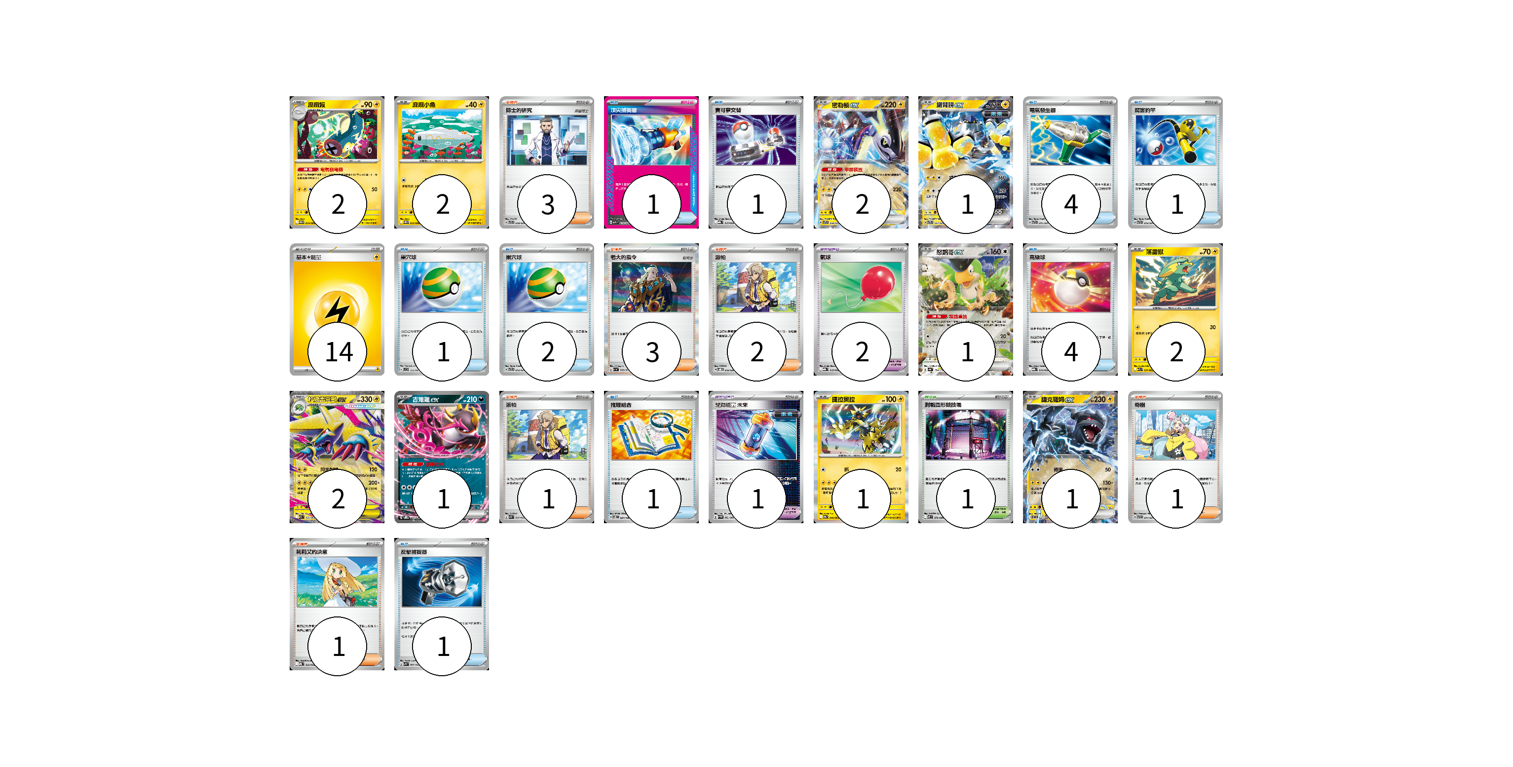 牌組構築方案 以此牌組為基礎新構築牌組 顯示卡面 顯示列表 寶可夢卡(15) 2 2 2 1 1 2 2 1 1 1 寶可夢道具(3) 2 1 物品卡(16) 1 1 4 1 1 2 4 1 1 支援者卡(11) 3 3 2 1 1 1 競技場卡(1) 1 能量卡(14) 14 寶可夢卡(15) 卡牌名稱 張數 卡牌名稱 張數 麻麻鰻 SV11B 034/086 02 麻麻小魚 SV11B 033/086 02 密勒頓ex SVTR 008/021 02 鐵臂膀ex SVTR 007/021 01 怒鸚哥ex SV4a 154/190 01 落雷獸 M1S 031/063 02 超級雷電獸ex M1S 032/063 02 吉雉雞ex SVOD 004/020 01 捷拉奧拉 SV9a 040/063 01 捷克羅姆ex SV11B 037/086 01 寶可夢道具(3) 卡牌名稱 張數 卡牌名稱 張數 氣球 MBG 019/022 02 驅勁能量 未來 SV4M 062/066 01 物品卡(16) 卡牌名稱 張數 卡牌名稱 張數 頂尖捕捉器 MBG 014/022 01 寶可夢交替 MBG 015/022 01 電氣發生器 SVTR 011/021 04 厲害釣竿 SVTR 012/021 01 巢穴球 SVC 013/021 01 巢穴球 SVTR 013/021 02 高級球 MBG 012/022 04 推理組合 SV8 094/106 01 反擊捕捉器 SVK 009/042 01 支援者卡(11) 卡牌名稱 張數 卡牌名稱 張數 博士的研究 SVTR 018/021 03 老大的指令 SV1a 069/073 03 派帕 SVOD 018/020 02 派帕 SVK 035/042 01 奇樹 SVTR 017/021 01 莉莉艾的決意 MBG 022/022 01 競技場卡(1) 卡牌名稱 張數 卡牌名稱 張數 對戰圓形競技場 M2 079/080 01 能量卡(14) 卡牌名稱 張數 卡牌名稱 張數 基本【雷】能量 SVTR LIG 14 以此牌組為基礎新構築牌組 牌組編碼 wwgfJV-orWHQL-kpXlZE copy 列印牌組單 牌組編碼已複製 分享至SNS