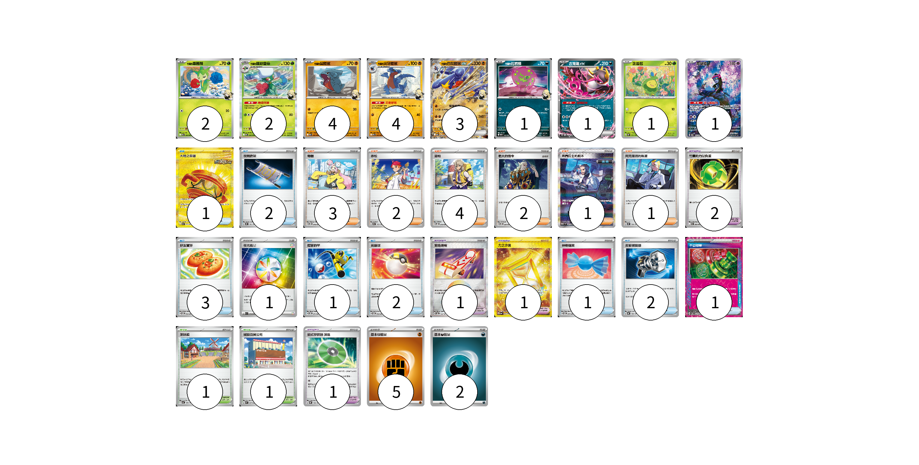 牌組構築方案 以此牌組為基礎新構築牌組 顯示卡面 顯示列表 寶可夢卡(19) 2 2 4 4 3 1 1 1 1 寶可夢道具(5) 2 1 1 1 物品卡(13) 1 2 3 1 2 1 2 1 支援者卡(13) 3 2 4 2 1 1 競技場卡(2) 1 1 能量卡(8) 1 5 2 寶可夢卡(19) 卡牌名稱 張數 卡牌名稱 張數 <竹蘭的>毒薔薇 SV9a 004/063 02 <竹蘭的>羅絲雷朵 SV9a 005/063 02 <竹蘭的>圓陸鯊 SV9a 042/063 04 <竹蘭的>尖牙陸鯊 SV9a 043/063 04 <竹蘭的>烈咬陸鯊ex SV9a 044/063 03 <竹蘭的>花岩怪 SV9a 050/063 01 吉雉雞ex SVOM 009/021 01 含羞苞 SV8a 001/187 01 願增猿 SV6 107/101 01 寶可夢道具(5) 卡牌名稱 張數 卡牌名稱 張數 竹蘭的力量負重 SV9a 060/063 02 緊急滑板 SV8a 153/187 01 力之沙漏 SV6a 094/064 01 招式學習器 演進 SV8a 160/187 01 物品卡(13) 卡牌名稱 張數 卡牌名稱 張數 大地之容器 SV6a 093/064 01 夜間擔架 SV8a 151/187 02 好友寶芬 SVOM 012/021 03 厲害釣竿 SVOM 011/021 01 高級球 SVOM 013/021 02 神奇糖果 SVOM 014/021 01 反擊捕捉器 SV8a 139/187 02 不公印章 SV5a 053/066 01 支援者卡(13) 卡牌名稱 張數 卡牌名稱 張數 奇樹 SVOM 018/021 03 赤松 SV8a 163/187 02 派帕 SVOD 018/020 04 老大的指令 SVOM 020/021 02 弗圖博士的劇本 SV4M 091/066 01 阿克羅瑪的執著 SV8a 164/187 01 競技場卡(2) 卡牌名稱 張數 卡牌名稱 張數 深缽鎮 SV4a 185/190 01 城鎮百貨公司 SVK 037/042 01 能量卡(8) 卡牌名稱 張數 卡牌名稱 張數 夜光能量 SV1a 073/073 01 基本【鬥】能量 SVF FIG 05 基本【惡】能量 SVD DAR 02 以此牌組為基礎新構築牌組 牌組編碼 wwhjZc-tUvwQl-IuADjy copy 列印牌組單 牌組編碼已複製 分享至SNS
