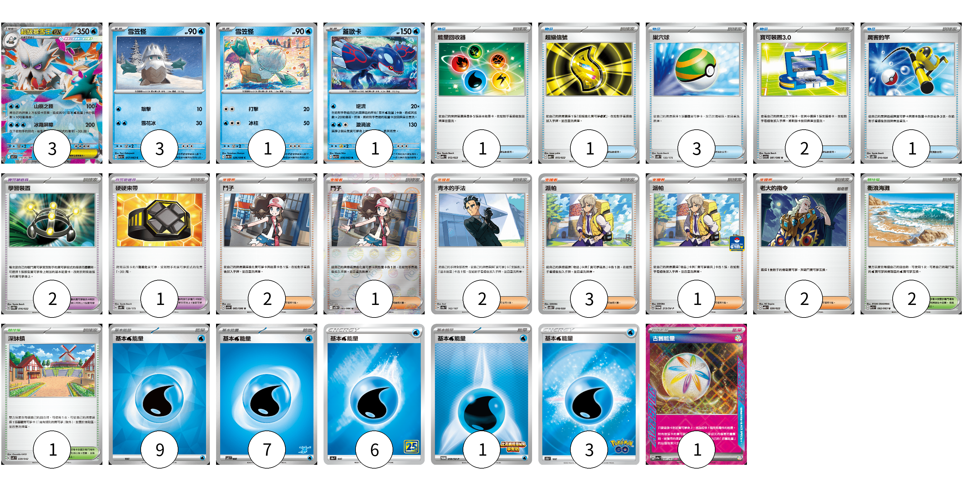 牌組構築方案 以此牌組為基礎新構築牌組 顯示卡面 顯示列表 寶可夢卡(8) 3 3 1 1 寶可夢道具(3) 2 1 物品卡(8) 1 1 3 2 1 支援者卡(11) 2 1 2 3 1 2 競技場卡(3) 2 1 能量卡(27) 9 7 6 1 3 1 寶可夢卡(8) 卡牌名稱 張數 卡牌名稱 張數 超級暴雪王ex M1S 018/063 03 雪笠怪 M1S 017/063 03 雪笠怪 SV10 026/098 01 蓋歐卡 M1S 016/063 01 寶可夢道具(3) 卡牌名稱 張數 卡牌名稱 張數 學習裝置 SVTM 016/022 02 硬硬束帶 SVM 139/175 01 物品卡(8) 卡牌名稱 張數 卡牌名稱 張數 能量回收器 MBD 012/022 01 超級信號 MBD 015/022 01 巢穴球 SVM 133/175 03 寶可裝置3.0 SV11B 081/086 02 厲害釣竿 SVOD 010/020 01 支援者卡(11) 卡牌名稱 張數 卡牌名稱 張數 鬥子 SV11W 085/086 02 鬥子 SV11W 085/086 01 青木的手法 SV8a 162/187 02 派帕 SVOD 018/020 03 派帕 SV-P 213/SV-P 01 老大的指令 MBD 020/022 02 競技場卡(3) 卡牌名稱 張數 卡牌名稱 張數 衝浪海灘 M1S 062/063 02 深缽鎮 SVK 039/042 01 能量卡(27) 卡牌名稱 張數 卡牌名稱 張數 基本【水】能量 SVM WAT 09 基本【水】能量 SVI WAT 07 基本水能量 S8a WAT 06 基本【水】能量 SV-P 259/SV-P 01 基本水能量 S10b WAT 03 古舊能量 SV8a 187/187 01 以此牌組為基礎新構築牌組 牌組編碼 wwxdwP-hGIQUt-FBUJeI copy 列印牌組單 牌組編碼已複製 分享至SNS