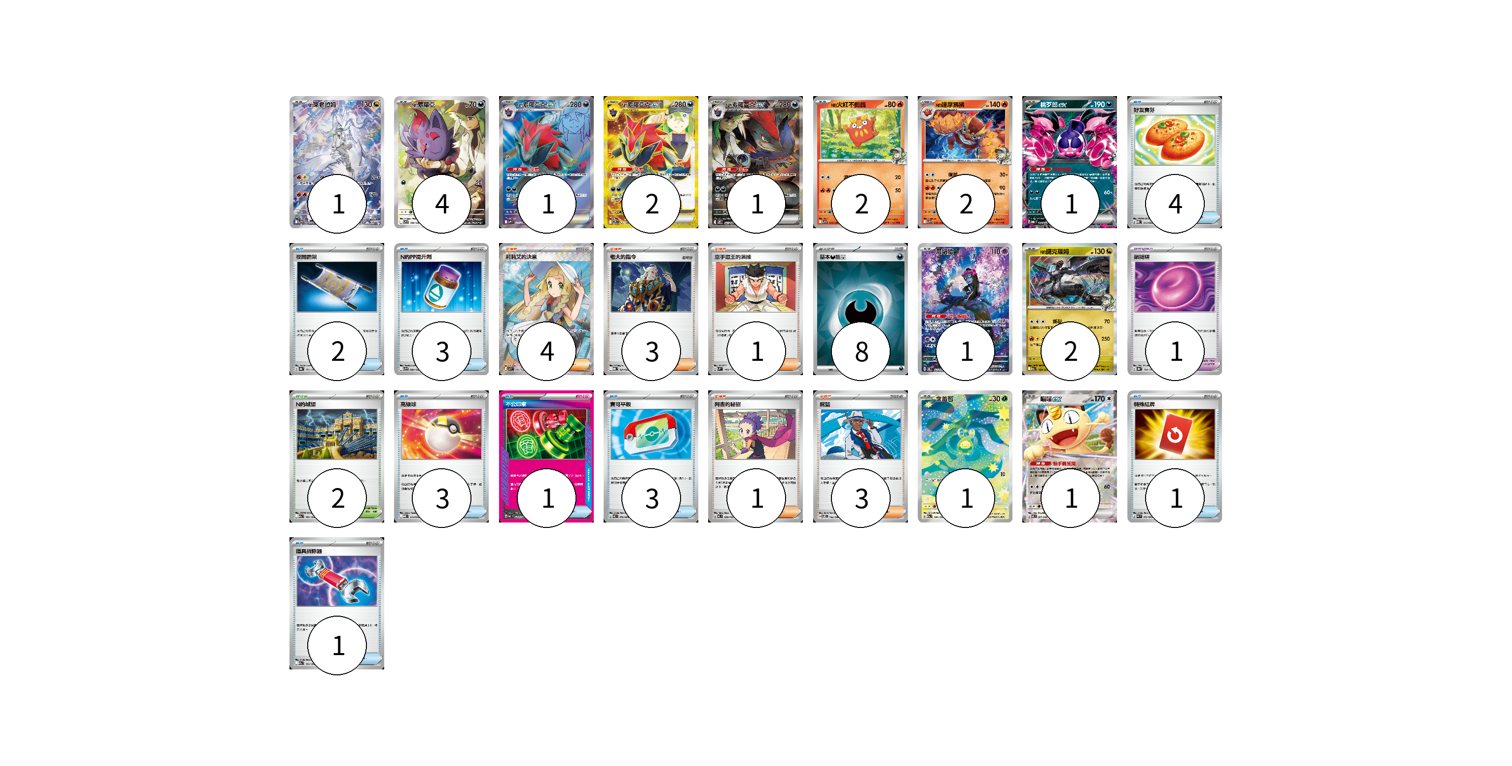 牌組構築方案 以此牌組為基礎新構築牌組 顯示卡面 顯示列表 寶可夢卡(19) 1 4 1 2 1 2 2 1 1 2 1 1 寶可夢道具(1) 1 物品卡(18) 4 2 3 3 1 3 1 1 支援者卡(12) 4 3 1 1 3 競技場卡(2) 2 能量卡(8) 8 寶可夢卡(19) 卡牌名稱 張數 卡牌名稱 張數 N的萊希拉姆 SV9 109/100 01 N的索羅亞 SV9 108/100 04 N的索羅亞克ex SV9 117/100 01 N的索羅亞克ex SV9 131/100 02 N的索羅亞克ex SV9 127/100 01 N的火紅不倒翁 SV9 015/100 02 N的達摩狒狒 SV9 016/100 02 桃歹郎ex MBG 009/022 01 願增猿 SV6 107/101 01 N的捷克羅姆 M2a 129/193 02 含羞苞 M2a 196/193 01 喵喵ex M3 061/080 01 寶可夢道具(1) 卡牌名稱 張數 卡牌名稱 張數 鎖鏈糬 SV8a 154/187 01 物品卡(18) 卡牌名稱 張數 卡牌名稱 張數 好友寶芬 MBD 013/022 04 夜間擔架 SV8a 151/187 02 N的PP提升劑 SV9 089/100 03 高級球 MBD 014/022 03 不公印章 MC 633/742 01 寶可平板 M3 070/080 03 特殊紅牌 M4 072/083 01 道具拆除器 M2a 151/193 01 支援者卡(12) 卡牌名稱 張數 卡牌名稱 張數 莉莉艾的決意 M1L 086/063 04 老大的指令 MBG 021/022 03 空手道王的演練 SVM 143/175 01 阿杏的秘招 MC 699/742 01 席藍 SV8 102/106 03 競技場卡(2) 卡牌名稱 張數 卡牌名稱 張數 N的城堡 M2a 181/193 02 能量卡(8) 卡牌名稱 張數 卡牌名稱 張數 基本【惡】能量 SVOM DAR 08 以此牌組為基礎新構築牌組 牌組編碼 wxdyOf-MSrBxO-IxQBMr copy 列印牌組單 牌組編碼已複製 分享至SNS