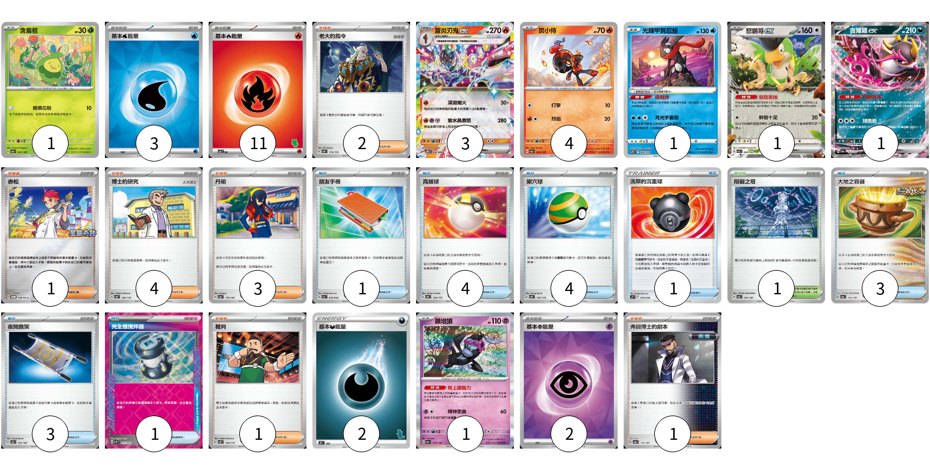 牌組構築方案 以此牌組為基礎新構築牌組 顯示卡面 顯示列表 寶可夢卡(12) 1 3 4 1 1 1 1 物品卡(17) 1 4 4 1 3 3 1 支援者卡(12) 2 1 4 3 1 1 競技場卡(1) 1 能量卡(18) 3 11 2 2 寶可夢卡(12) 卡牌名稱 張數 卡牌名稱 張數 含羞苞 SV8a 001/187 01 蒼炎刃鬼ex SVPS 006/008 03 炭小侍 SV8a 023/187 04 光輝甲賀忍蛙 SVTG 002/019 01 怒鸚哥ex SVK 006/042 01 吉雉雞ex SV8a 104/187 01 願增猿 SV8a 075/187 01 物品卡(17) 卡牌名稱 張數 卡牌名稱 張數 朋友手冊 SVK 014/042 01 高級球 SVM 134/175 04 巢穴球 SVM 133/175 04 洗翠的沉重球 SVF 019/038 01 大地之容器 SV8a 143/187 03 夜間擔架 SV8a 151/187 03 完全體攪拌器 SVK 017/042 01 支援者卡(12) 卡牌名稱 張數 卡牌名稱 張數 老大的指令 SVM 172/175 02 赤松 SV-P 150/SV-P 01 博士的研究 SVM 162/175 04 丹瑜 SV8a 170/187 03 裁判 SVM 154/175 01 弗圖博士的劇本 SV8a 175/187 01 競技場卡(1) 卡牌名稱 張數 卡牌名稱 張數 阻礙之塔 SV8a 181/187 01 能量卡(18) 卡牌名稱 張數 卡牌名稱 張數 基本【水】能量 SVK WAT 03 基本【火】能量 SVI FIR 11 基本惡能量 SH DAR 02 基本【超】能量 SVK PSY 02 以此牌組為基礎新構築牌組 牌組編碼 xBVktP-iwDimx-ZcDqFS copy 列印牌組單 牌組編碼已複製 分享至SNS