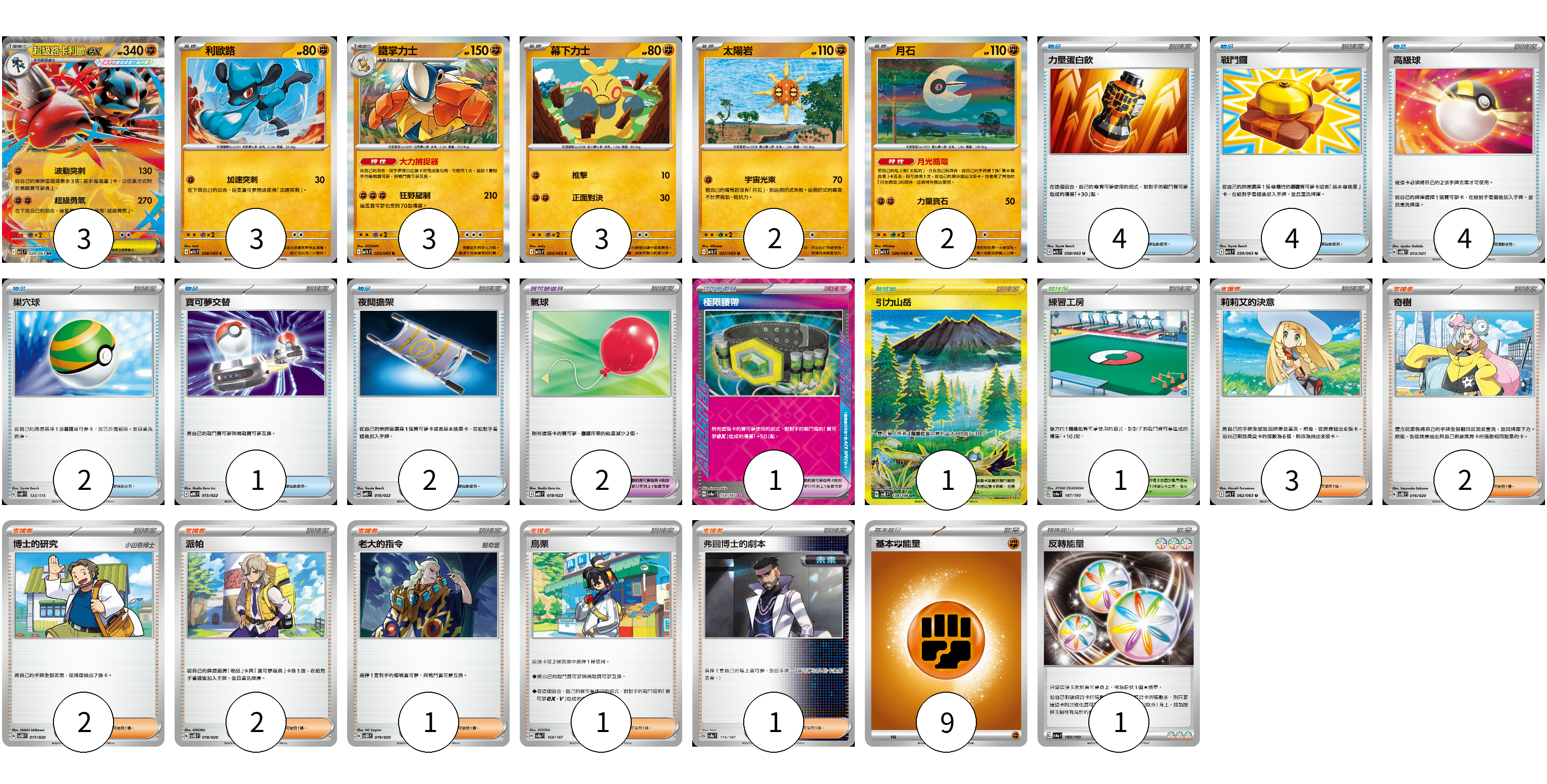 牌組構築方案 以此牌組為基礎新構築牌組 顯示卡面 顯示列表 寶可夢卡(16) 3 3 3 3 2 2 寶可夢道具(1) 1 物品卡(19) 4 4 4 2 1 2 2 支援者卡(12) 3 2 2 2 1 1 1 競技場卡(2) 1 1 能量卡(10) 9 1 寶可夢卡(16) 卡牌名稱 張數 卡牌名稱 張數 超級路卡利歐ex M1L 029/063 03 利歐路 M1L 028/063 03 鐵掌力士 M1L 025/063 03 幕下力士 M1L 024/063 03 太陽岩 M1L 027/063 02 月石 M1L 026/063 02 寶可夢道具(1) 卡牌名稱 張數 卡牌名稱 張數 極限腰帶 SV8a 159/187 01 物品卡(19) 卡牌名稱 張數 卡牌名稱 張數 力量蛋白飲 M1L 058/063 04 戰鬥鑼 M1L 059/063 04 高級球 SVOM 013/021 04 巢穴球 SVM 133/175 02 寶可夢交替 MBG 015/022 01 夜間擔架 MBD 016/022 02 氣球 MBD 018/022 02 支援者卡(12) 卡牌名稱 張數 卡牌名稱 張數 莉莉艾的決意 M1L 062/063 03 奇樹 SVOD 016/020 02 博士的研究 SVOD 017/020 02 派帕 SVOD 018/020 02 老大的指令 SVOD 019/020 01 烏栗 SV8a 169/187 01 弗圖博士的劇本 SV8a 175/187 01 競技場卡(2) 卡牌名稱 張數 卡牌名稱 張數 引力山岳 SV8 138/106 01 練習工房 SV4a 187/190 01 能量卡(10) 卡牌名稱 張數 卡牌名稱 張數 基本【鬥】能量 M-P FIG 09 反轉能量 SV4a 189/190 01 以此牌組為基礎新構築牌組 牌組編碼 xBswOm-saVXOY-Suycny copy 列印牌組單 牌組編碼已複製 分享至SNS