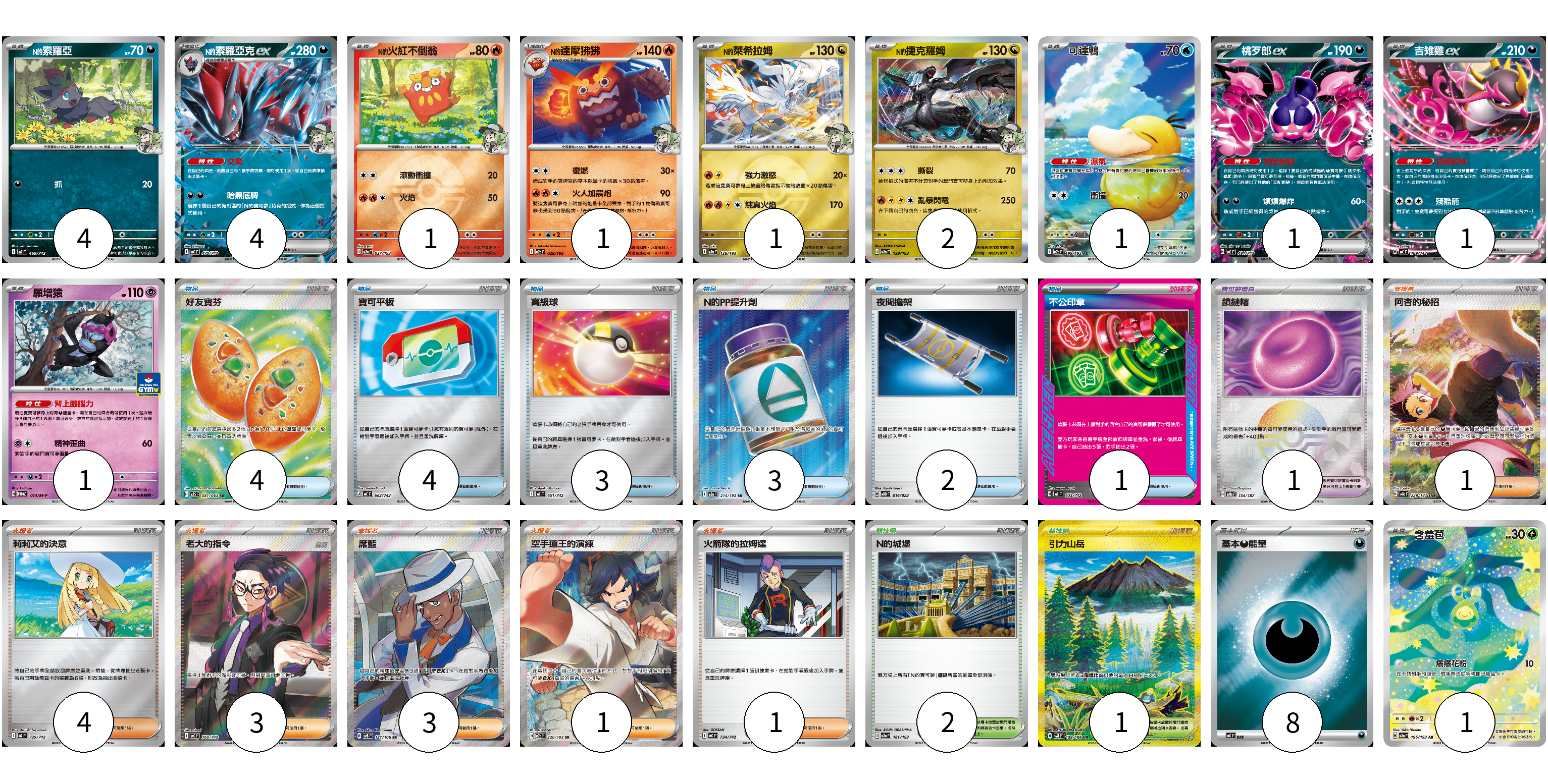 牌組構築方案 以此牌組為基礎新構築牌組 顯示卡面 顯示列表 寶可夢卡(18) 4 4 1 1 1 2 1 1 1 1 1 寶可夢道具(1) 1 物品卡(17) 4 4 3 3 2 1 支援者卡(13) 1 4 3 3 1 1 競技場卡(3) 2 1 能量卡(8) 8 寶可夢卡(18) 卡牌名稱 張數 卡牌名稱 張數 N的索羅亞 MC 469/742 04 N的索羅亞克ex MC 470/742 04 N的火紅不倒翁 M2a 027/193 01 N的達摩狒狒 M2a 028/193 01 N的萊希拉姆 M2a 128/193 01 N的捷克羅姆 M2a 129/193 02 可達鴨 M2a 199/193 01 桃歹郎ex MC 491/742 01 吉雉雞ex MC 489/742 01 願增猿 M-P 014/M-P 01 含羞苞 M2a 196/193 01 寶可夢道具(1) 卡牌名稱 張數 卡牌名稱 張數 鎖鏈糬 SV8a 154/187 01 物品卡(17) 卡牌名稱 張數 卡牌名稱 張數 好友寶芬 M1S 081/063 04 寶可平板 MC 662/742 04 高級球 MC 651/742 03 N的PP提升劑 M2a 214/193 03 夜間擔架 MBD 016/022 02 不公印章 MC 633/742 01 支援者卡(13) 卡牌名稱 張數 卡牌名稱 張數 阿杏的秘招 SV8a 228/187 01 莉莉艾的決意 MC 729/742 04 老大的指令(烏羽) MC 760/742 03 席藍 SV8 127/106 03 空手道王的演練 M2a 220/193 01 火箭隊的拉姆達 MC 734/742 01 競技場卡(3) 卡牌名稱 張數 卡牌名稱 張數 N的城堡 M2a 181/193 02 引力山岳 SV8 138/106 01 能量卡(8) 卡牌名稱 張數 卡牌名稱 張數 基本【惡】能量 MC DAR 08 以此牌組為基礎新構築牌組 牌組編碼 xDYhgo-zYsxMD-xvKkRo copy 列印牌組單 牌組編碼已複製 分享至SNS