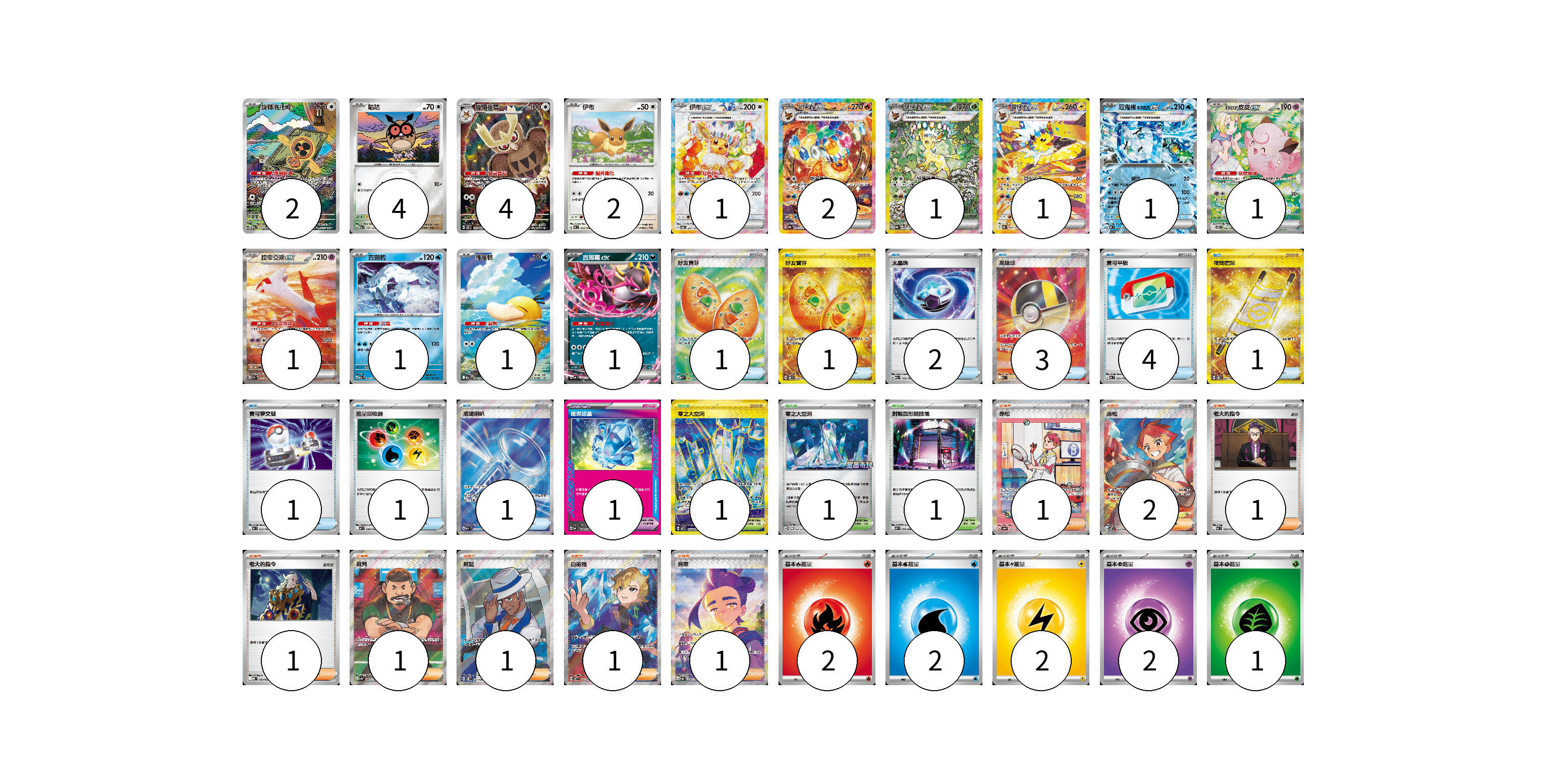 牌組構築方案 以此牌組為基礎新構築牌組 顯示卡面 顯示列表 寶可夢卡(23) 2 4 4 2 1 2 1 1 1 1 1 1 1 1 寶可夢道具(1) 1 物品卡(15) 1 1 2 3 4 1 1 1 1 支援者卡(9) 1 2 1 1 1 1 1 1 競技場卡(3) 1 1 1 能量卡(9) 2 2 2 2 1 寶可夢卡(23) 卡牌名稱 張數 卡牌名稱 張數 旋轉洛托姆 M2a 213/193 02 咕咕 M2a 137/193 04 貓頭夜鷹 SV7 114/102 04 伊布 MC 565/742 02 伊布ex SV8a 224/187 01 火伊布ex SV8a 202/187 02 葉伊布ex SV8a 200/187 01 雷伊布ex SV8a 209/187 01 厄鬼椪 水井面具ex MC 224/742 01 莉莉艾的皮皮ex SV9 126/100 01 拉帝亞斯ex SV7a 087/064 01 古劍豹 M2a 043/193 01 可達鴨 M2a 199/193 01 吉雉雞ex MC 489/742 01 寶可夢道具(1) 卡牌名稱 張數 卡牌名稱 張數 璀璨結晶 MC 680/742 01 物品卡(15) 卡牌名稱 張數 卡牌名稱 張數 好友寶芬 M1S 081/063 01 好友寶芬 SV6 133/101 01 太晶珠 M2a 152/193 02 高級球 M2a 216/193 03 寶可平板 MC 662/742 04 夜間擔架 SV8 137/106 01 寶可夢交替 MC 663/742 01 能量回收器 MC 640/742 01 玻璃喇叭 M2a 215/193 01 支援者卡(9) 卡牌名稱 張數 卡牌名稱 張數 赤松 SV8a 227/187 01 赤松 SV7 123/102 02 老大的指令 MC 724/742 01 老大的指令 MBD 020/022 01 裁判 SV4a 342/190 01 席藍 SV8 127/106 01 白蕾雅 SV7 126/102 01 烏栗 SV8a 230/187 01 競技場卡(3) 卡牌名稱 張數 卡牌名稱 張數 零之大空洞 SV7 135/102 01 零之大空洞 SV-P 151/SV-P 01 對戰圓形競技場 M2 079/080 01 能量卡(9) 卡牌名稱 張數 卡牌名稱 張數 基本【火】能量 MC FIR 02 基本【水】能量 MC WAT 02 基本【雷】能量 MC LIG 02 基本【超】能量 MC PSY 02 基本【草】能量 MC GRA 01 以此牌組為基礎新構築牌組 牌組編碼 xIsifc-CGvqEK-vwCBzt copy 列印牌組單 牌組編碼已複製 分享至SNS