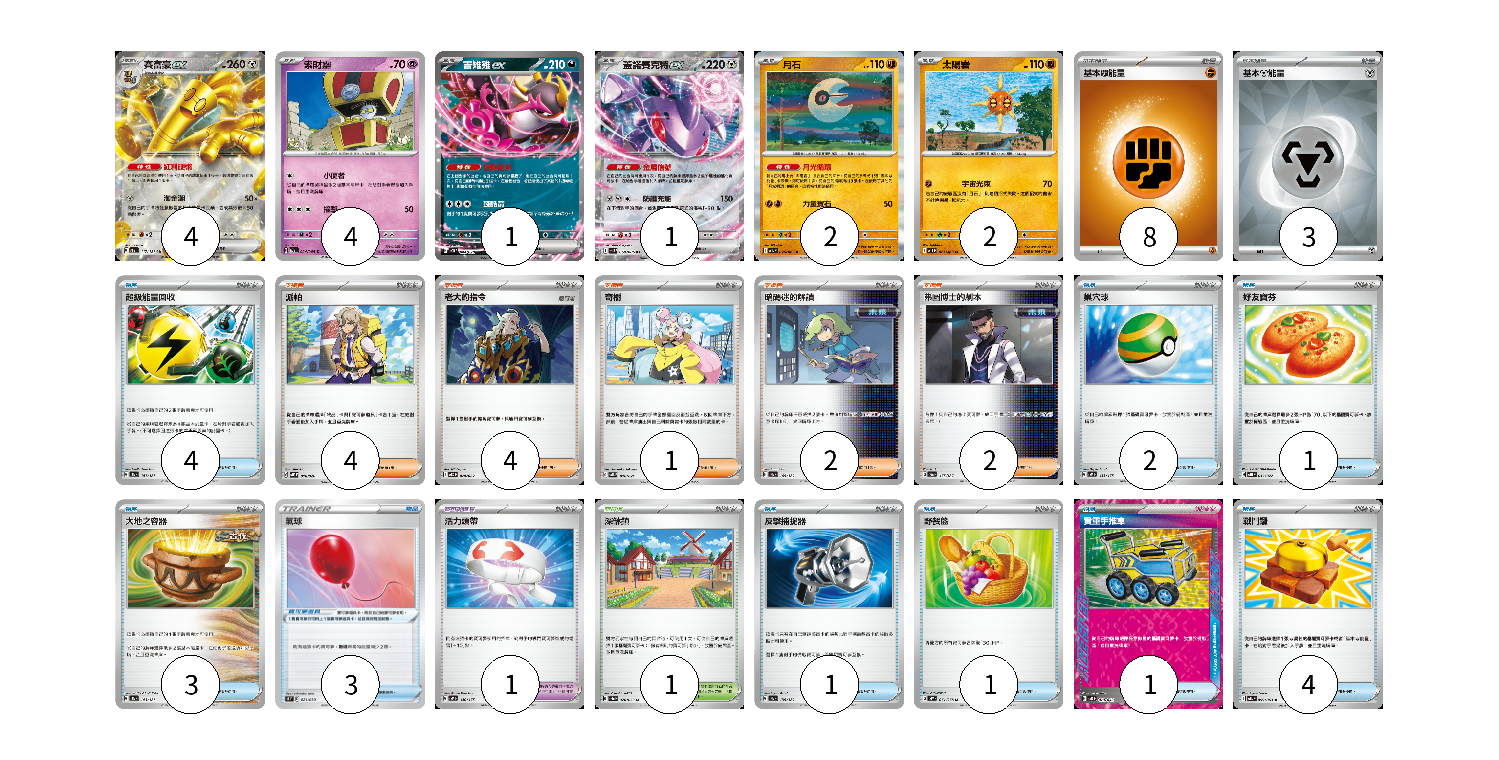 牌組構築方案 以此牌組為基礎新構築牌組 顯示卡面 顯示列表 寶可夢卡(14) 4 4 1 1 2 2 寶可夢道具(5) 1 3 1 物品卡(17) 4 2 1 3 1 1 1 4 支援者卡(12) 4 4 2 2 競技場卡(1) 1 能量卡(11) 8 3 寶可夢卡(14) 卡牌名稱 張數 卡牌名稱 張數 賽富豪ex SV8a 117/187 04 索財靈 SV7a 024/064 04 吉雉雞ex SVOD 004/020 01 蓋諾賽克特ex SV11B 069/086 01 月石 M1L 026/063 02 太陽岩 M1L 027/063 02 寶可夢道具(5) 卡牌名稱 張數 卡牌名稱 張數 奇樹 SVTL 018/021 01 氣球 SK 021/030 03 活力頭帶 SVM 140/175 01 物品卡(17) 卡牌名稱 張數 卡牌名稱 張數 超級能量回收 SV8a 141/187 04 巢穴球 SVM 133/175 02 好友寶芬 MBD 013/022 01 大地之容器 SV8a 143/187 03 反擊捕捉器 SV8a 139/187 01 野餐籃 SV1V 071/078 01 貴重手推車 SVK 020/042 01 戰鬥鑼 M1L 059/063 04 支援者卡(12) 卡牌名稱 張數 卡牌名稱 張數 派帕 SVOD 018/020 04 老大的指令 MBD 020/022 04 暗碼迷的解讀 SV8a 165/187 02 弗圖博士的劇本 SV8a 175/187 02 競技場卡(1) 卡牌名稱 張數 卡牌名稱 張數 深缽鎮 SV1a 070/073 01 能量卡(11) 卡牌名稱 張數 卡牌名稱 張數 基本【鬥】能量 M-P FIG 08 基本【鋼】能量 SVOD MET 03 以此牌組為基礎新構築牌組 牌組編碼 xJCdQq-WkZBal-FoCChn copy 列印牌組單 牌組編碼已複製 分享至SNS