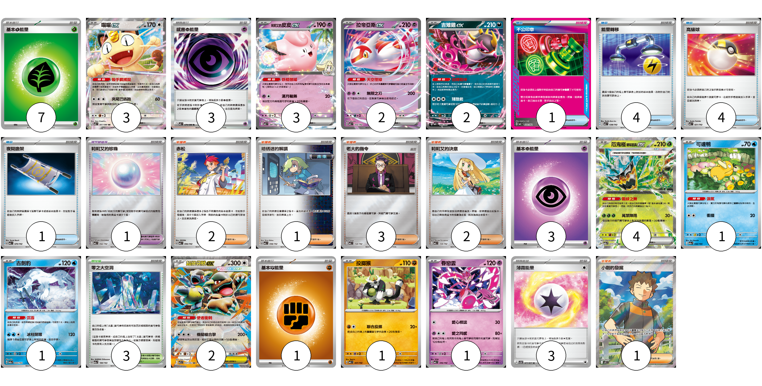 牌組構築方案 以此牌組為基礎新構築牌組 顯示卡面 顯示列表 寶可夢卡(20) 3 3 2 2 4 1 1 2 1 1 寶可夢道具(1) 1 物品卡(10) 1 4 4 1 支援者卡(9) 2 1 3 2 1 競技場卡(3) 3 能量卡(17) 7 3 3 1 3 寶可夢卡(20) 卡牌名稱 張數 卡牌名稱 張數 喵喵ex M3 061/080 03 莉莉艾的皮皮ex MC 287/742 03 拉帝亞斯ex MC 312/742 02 吉雉雞ex MC 489/742 02 厄鬼椪 碧草面具ex M2a 017/193 04 可達鴨 M2a 032/193 01 古劍豹 M2a 043/193 01 超級袋獸ex M1S 051/063 02 投擲猴 MC 407/742 01 眷戀雲 MC 346/742 01 寶可夢道具(1) 卡牌名稱 張數 卡牌名稱 張數 莉莉艾的珍珠 MC 692/742 01 物品卡(10) 卡牌名稱 張數 卡牌名稱 張數 不公印章 MC 633/742 01 能量轉移 MC 638/742 04 高級球 MC 651/742 04 夜間擔架 MC 670/742 01 支援者卡(9) 卡牌名稱 張數 卡牌名稱 張數 赤松 MC 696/742 02 暗碼迷的解讀 MC 698/742 01 老大的指令 MC 724/742 03 莉莉艾的決意 MC 729/742 02 小剛的發掘 SV9 123/100 01 競技場卡(3) 卡牌名稱 張數 卡牌名稱 張數 零之大空洞 M2a 184/193 03 能量卡(17) 卡牌名稱 張數 卡牌名稱 張數 基本【草】能量 MJ GRA 07 感應【超】能量 M3 079/080 03 基本【超】能量 MC PSY 03 基本【鬥】能量 M-P FIG 01 薄霧能量 SV5M 071/071 03 以此牌組為基礎新構築牌組 牌組編碼 xJcgdB-CZhEjC-hDXRuU copy 列印牌組單 牌組編碼已複製 分享至SNS
