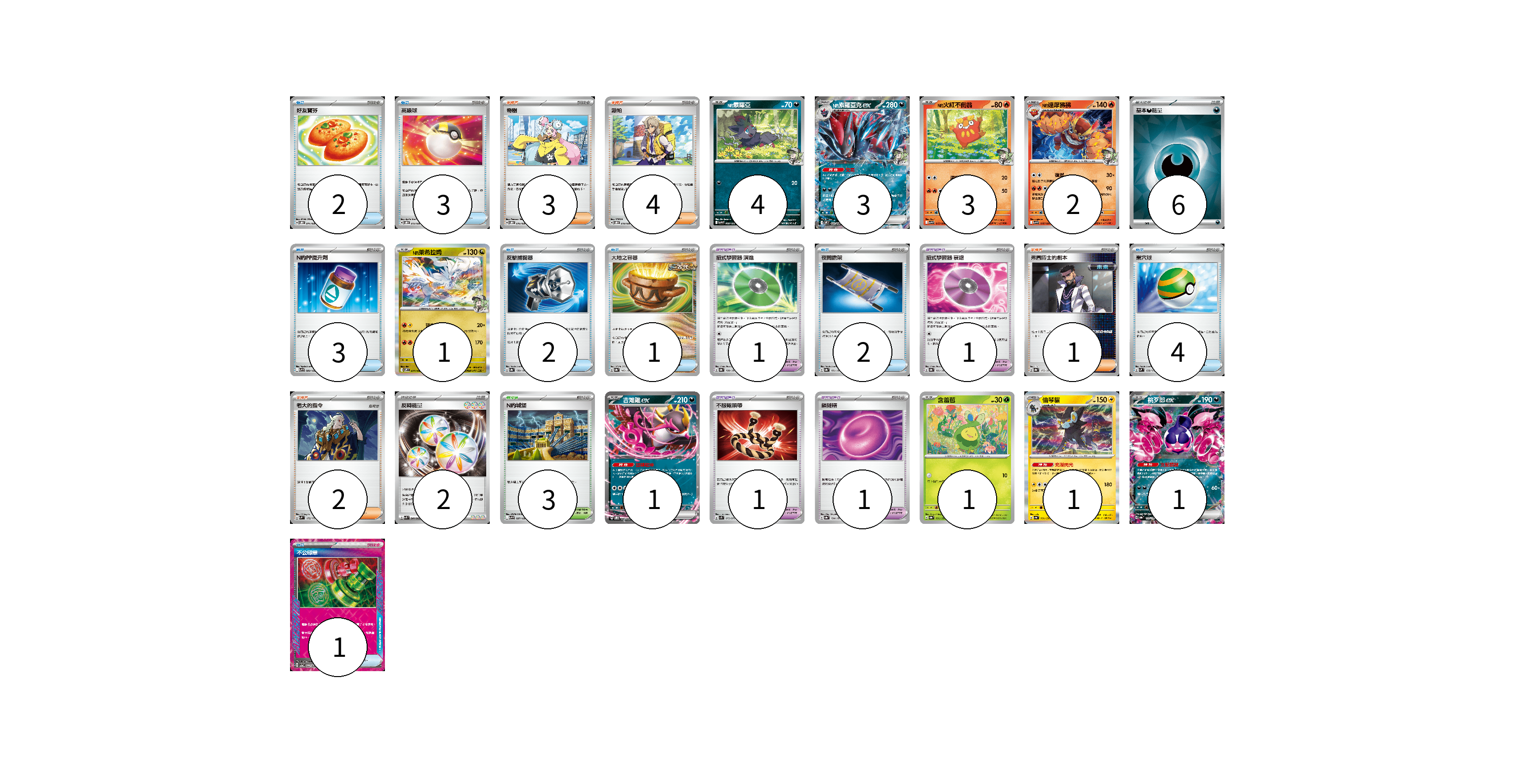 牌組構築方案 以此牌組為基礎新構築牌組 顯示卡面 顯示列表 寶可夢卡(17) 4 3 3 2 1 1 1 1 1 寶可夢道具(4) 1 1 1 1 物品卡(18) 2 3 3 2 1 2 4 1 支援者卡(10) 3 4 1 2 競技場卡(3) 3 能量卡(8) 6 2 寶可夢卡(17) 卡牌名稱 張數 卡牌名稱 張數 N的索羅亞 SV9 060/100 04 N的索羅亞克ex SV9 061/100 03 N的火紅不倒翁 SV9 015/100 03 N的達摩狒狒 SV9 016/100 02 N的萊希拉姆 SV9 074/100 01 吉雉雞ex SVOD 004/020 01 含羞苞 SV8a 001/187 01 倫琴貓 SV4a 061/190 01 桃歹郎ex SV8a 105/187 01 寶可夢道具(4) 卡牌名稱 張數 卡牌名稱 張數 招式學習器 演進 SV8a 160/187 01 招式學習器 衰退 SV8a 161/187 01 不服輸頭帶 SV1S 073/078 01 鎖鏈糬 SV8a 154/187 01 物品卡(18) 卡牌名稱 張數 卡牌名稱 張數 好友寶芬 SVOD 011/020 02 高級球 SVOD 012/020 03 N的PP提升劑 SV9 089/100 03 反擊捕捉器 SV8a 139/187 02 大地之容器 SV8a 143/187 01 夜間擔架 SV8a 151/187 02 巢穴球 SVM 133/175 04 不公印章 SV5a 053/066 01 支援者卡(10) 卡牌名稱 張數 卡牌名稱 張數 奇樹 SVOD 016/020 03 派帕 SVOD 018/020 04 弗圖博士的劇本 SV8a 175/187 01 老大的指令 SVM 172/175 02 競技場卡(3) 卡牌名稱 張數 卡牌名稱 張數 N的城堡 SV9 097/100 03 能量卡(8) 卡牌名稱 張數 卡牌名稱 張數 基本【惡】能量 SVOM DAR 06 反轉能量 SVK 041/042 02 以此牌組為基礎新構築牌組 牌組編碼 xMXBzU-IzIKpq-RzwmTq copy 列印牌組單 牌組編碼已複製 分享至SNS
