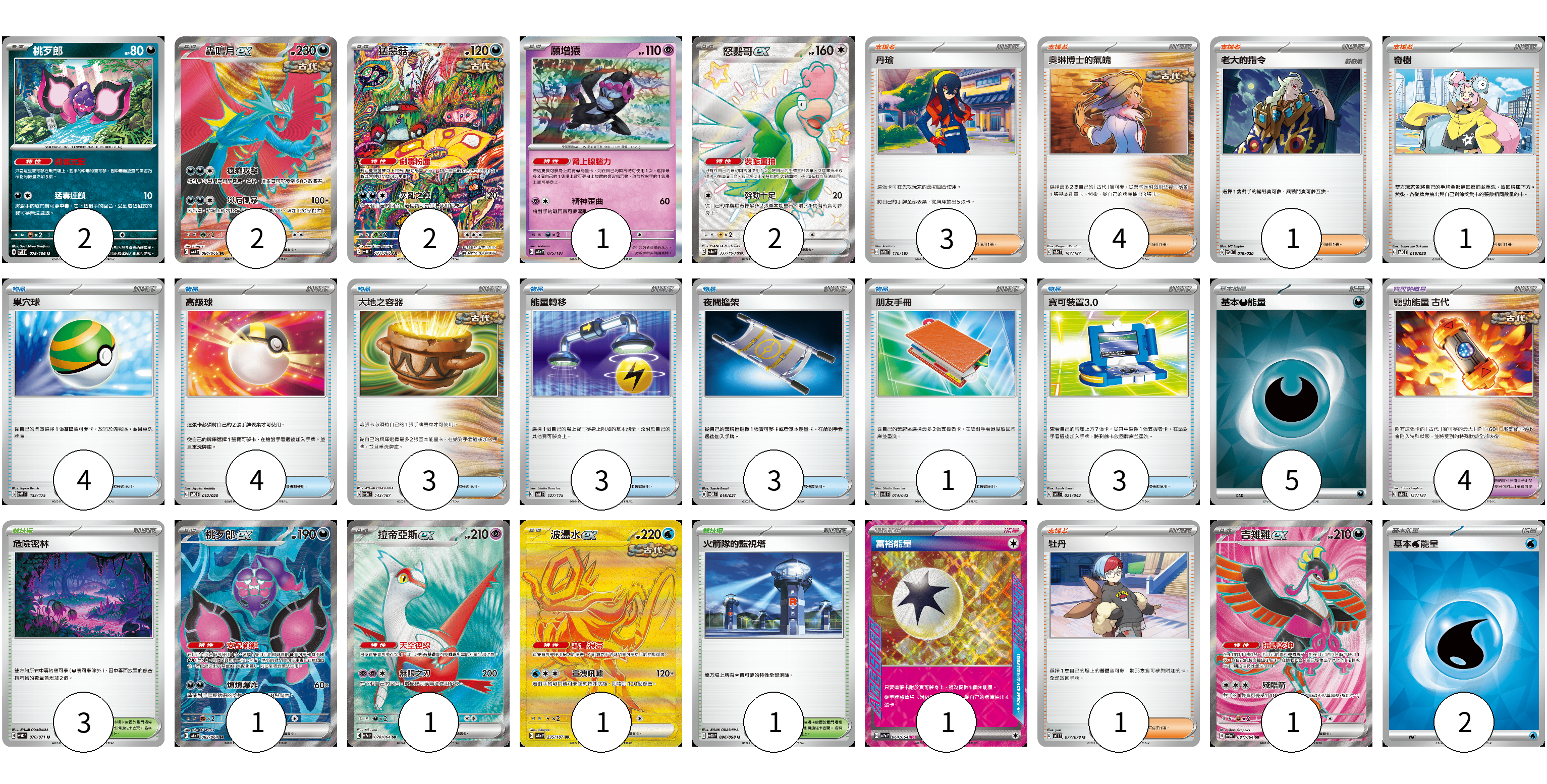 牌組構築方案 以此牌組為基礎新構築牌組 顯示卡面 顯示列表 寶可夢卡(13) 2 2 2 1 2 1 1 1 1 寶可夢道具(4) 4 物品卡(21) 4 4 3 3 3 1 3 支援者卡(10) 3 4 1 1 1 競技場卡(4) 3 1 能量卡(8) 5 1 2 寶可夢卡(13) 卡牌名稱 張數 卡牌名稱 張數 桃歹郎 SV8 075/106 02 轟鳴月ex SV4K 084/066 02 猛惡菇 SV4K 077/066 02 願增猿 SV8a 075/187 01 怒鸚哥ex SV4a 337/190 02 桃歹郎ex SV6a 082/064 01 拉帝亞斯ex SV7a 078/064 01 波盪水ex SV8a 235/187 01 吉雉雞ex SV6a 081/064 01 寶可夢道具(4) 卡牌名稱 張數 卡牌名稱 張數 驅勁能量 古代 SV8a 157/187 04 物品卡(21) 卡牌名稱 張數 卡牌名稱 張數 巢穴球 SVM 133/175 04 高級球 SVOD 012/020 04 大地之容器 SV8a 143/187 03 能量轉移 SVM 127/175 03 夜間擔架 SVOM 016/021 03 朋友手冊 SVK 014/042 01 寶可裝置3.0 SVK 021/042 03 支援者卡(10) 卡牌名稱 張數 卡牌名稱 張數 丹瑜 SV8a 170/187 03 奧琳博士的氣魄 SV8a 167/187 04 老大的指令 SVOD 019/020 01 奇樹 SVOD 016/020 01 牡丹 SV1S 077/078 01 競技場卡(4) 卡牌名稱 張數 卡牌名稱 張數 危險密林 SV5K 070/071 03 火箭隊的監視塔 SV10 096/098 01 能量卡(8) 卡牌名稱 張數 卡牌名稱 張數 基本【惡】能量 SVOM DAR 05 富裕能量 SV7a 064/064 01 基本【水】能量 SVK WAT 02 以此牌組為基礎新構築牌組 牌組編碼 xOjPGI-erjDhS-zibjQf copy 列印牌組單 牌組編碼已複製 分享至SNS