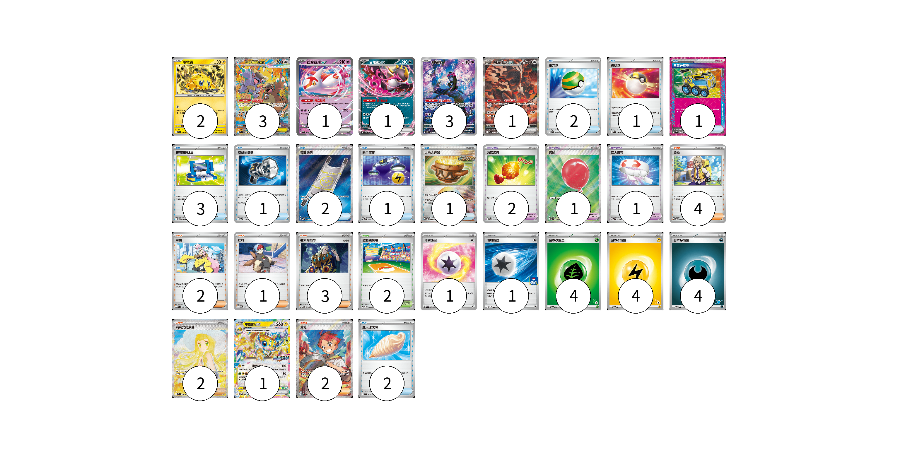牌組構築方案 以此牌組為基礎新構築牌組 顯示卡面 顯示列表 寶可夢卡(12) 2 3 1 1 3 1 1 寶可夢道具(4) 2 1 1 物品卡(14) 2 1 1 3 1 2 1 1 2 支援者卡(14) 4 2 1 3 2 2 競技場卡(2) 2 能量卡(14) 1 1 4 4 4 寶可夢卡(12) 卡牌名稱 張數 卡牌名稱 張數 電電蟲 SV7 032/102 02 超級袋獸ex M1S 089/063 03 拉帝亞斯ex MBD 003/022 01 吉雉雞ex SVOM 009/021 01 願增猿 SV6 107/101 03 月月熊 赫月ex SV8a 225/187 01 電蜘蛛ex SV-P 144/SV-P 01 寶可夢道具(4) 卡牌名稱 張數 卡牌名稱 張數 勇氣護符 SVEM 016/020 02 氣球 M1L 084/063 01 活力頭帶 SVM 140/175 01 物品卡(14) 卡牌名稱 張數 卡牌名稱 張數 巢穴球 SVTG 012/019 02 高級球 MBD 014/022 01 貴重手推車 SVK 020/042 01 寶可裝置3.0 SV11B 081/086 03 反擊捕捉器 SV8a 139/187 01 夜間擔架 M1L 083/063 02 能量轉移 SVM 127/175 01 大地之容器 SV8a 143/187 01 超大冰淇淋 M2 073/080 02 支援者卡(14) 卡牌名稱 張數 卡牌名稱 張數 派帕 SVOD 018/020 04 奇樹 SVM 160/175 02 牡丹 SV4a 182/190 01 老大的指令 MBG 021/022 03 莉莉艾的決意 M1L 091/063 02 赤松 SV7 123/102 02 競技場卡(2) 卡牌名稱 張數 卡牌名稱 張數 激動競技場 SV8 105/106 02 能量卡(14) 卡牌名稱 張數 卡牌名稱 張數 薄霧能量 SV5M 071/071 01 噴射能量 SV-P 180/SV-P 01 基本【草】能量 SVI GRA 04 基本【雷】能量 SVI LIG 04 基本【惡】能量 SVI DAR 04 以此牌組為基礎新構築牌組 牌組編碼 xPbCLZ-ASuJRY-LDqsmt copy 列印牌組單 牌組編碼已複製 分享至SNS